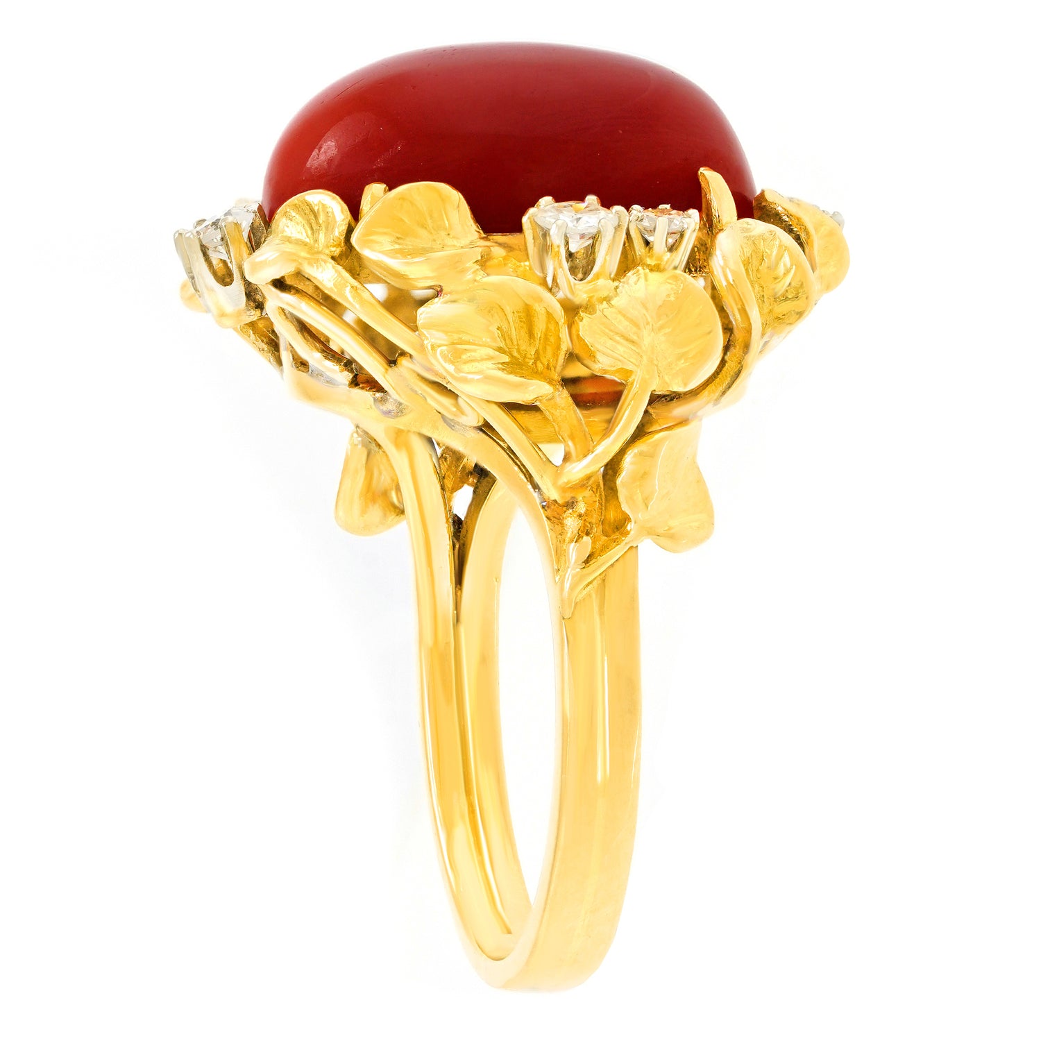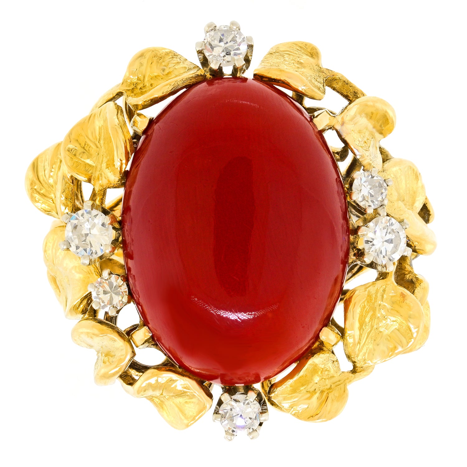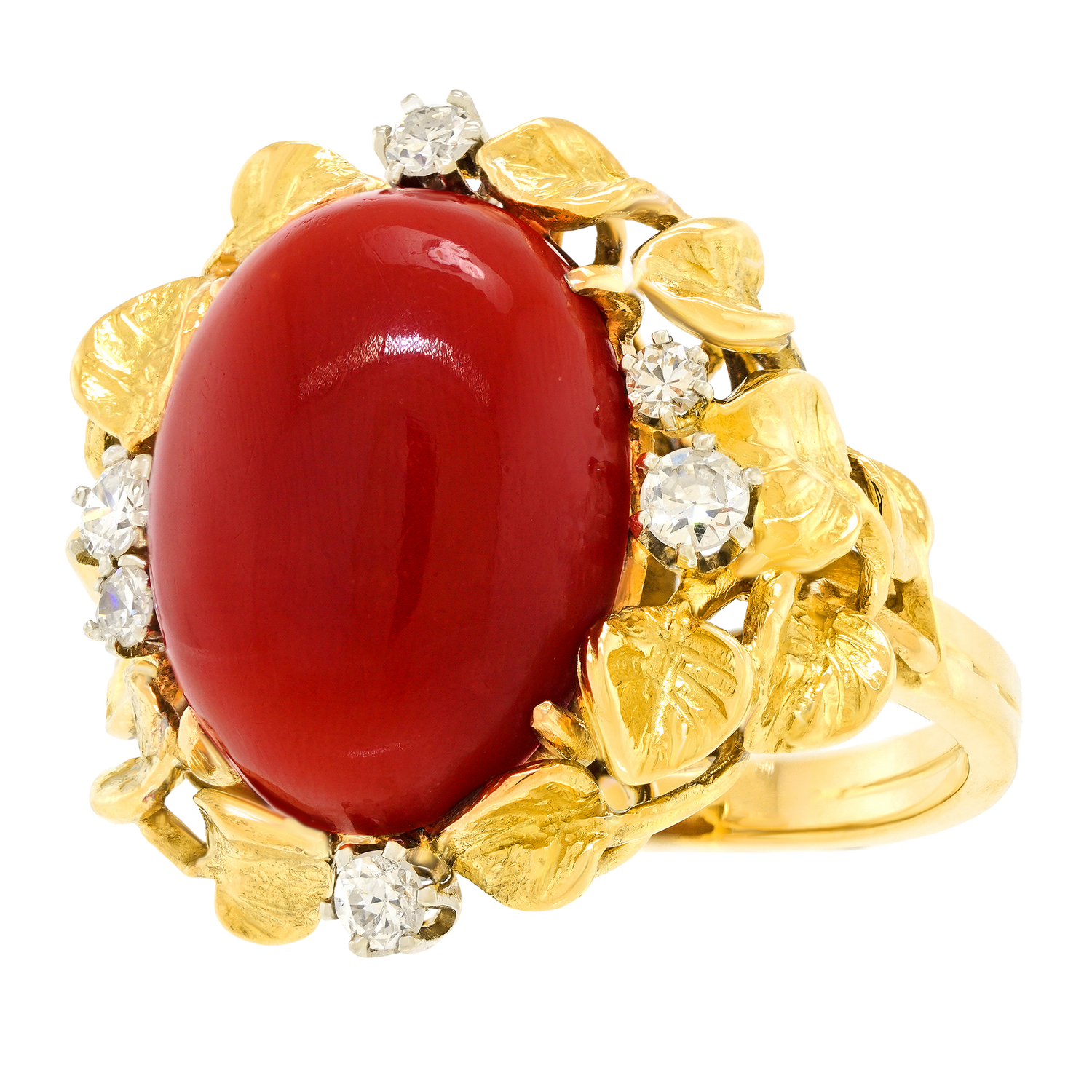 Circa 1960s, 18k, possibly Italy. From the old Gods to the Arts and Crafts movement, naturalistic motifs have always been part of spirit and style. This ring is decorated with vines profuse with leaves and berries, surrounding a lush, deeply-hued coral cabochon. The brilliance of the diamonds (.50ct I-H color VS clarity) underscores the narrative. Finely hand-made, this ring is in excellent condition.