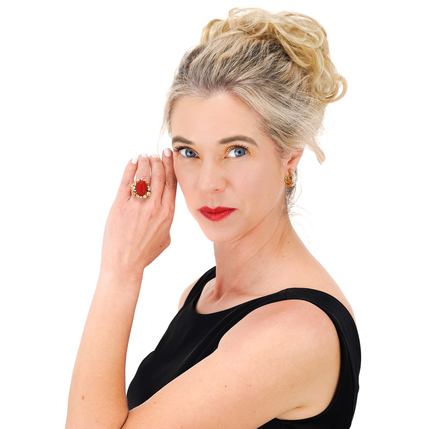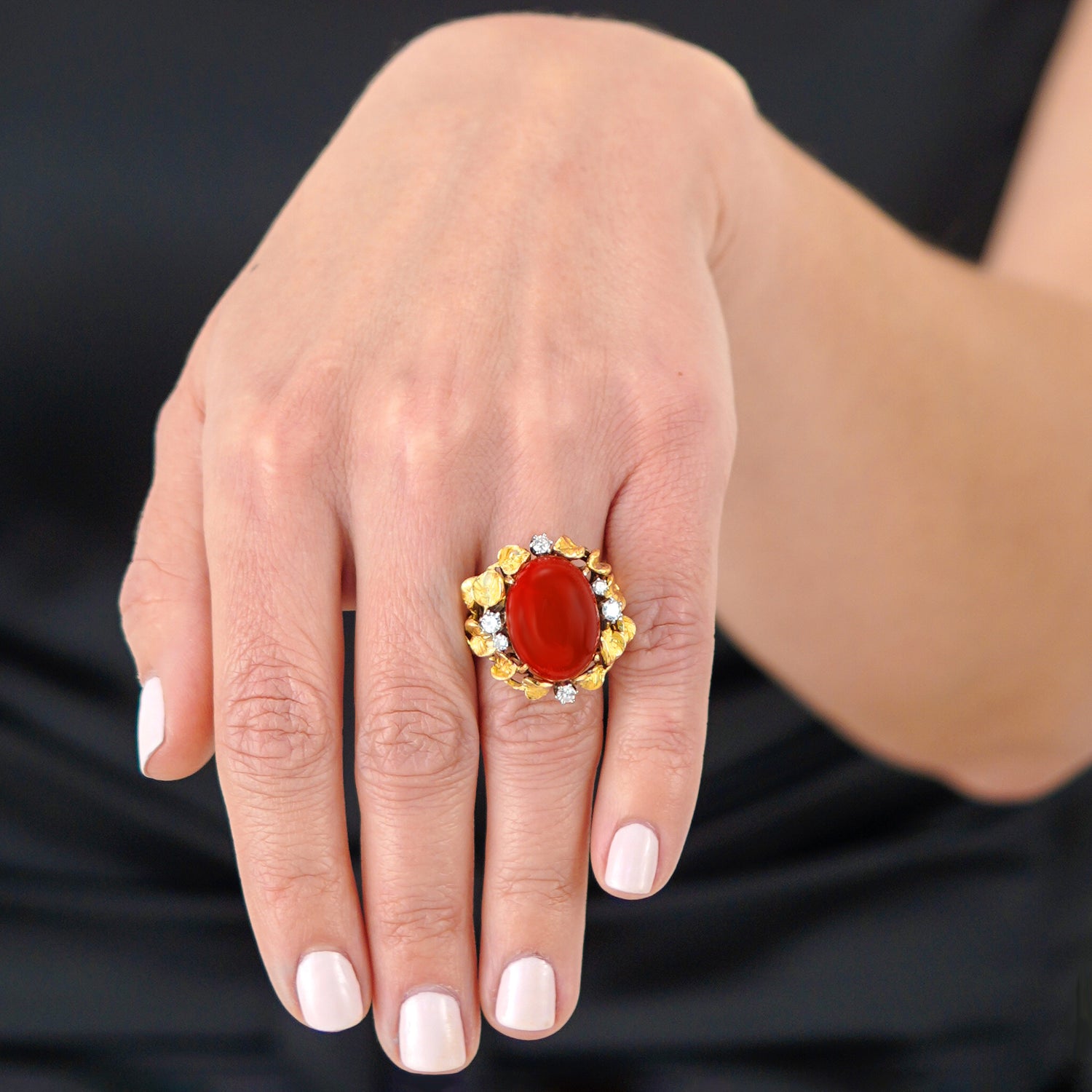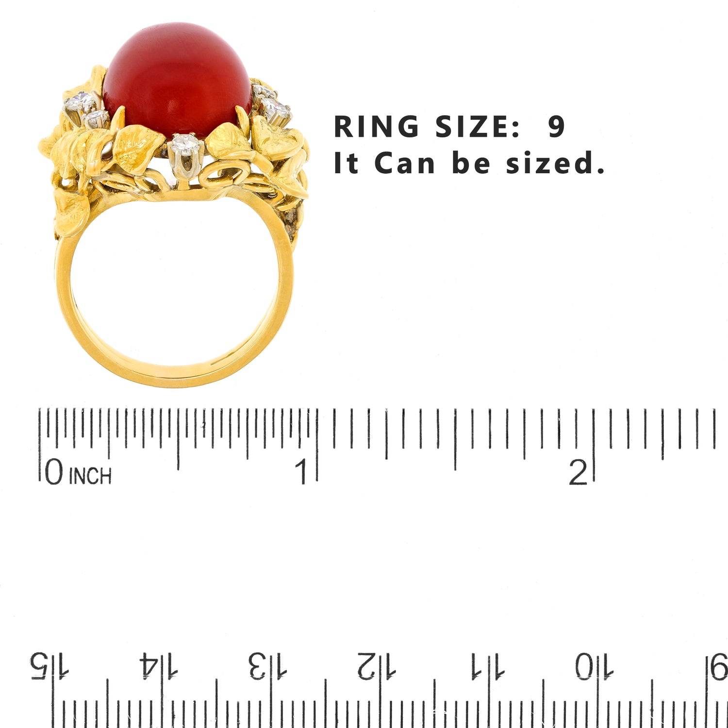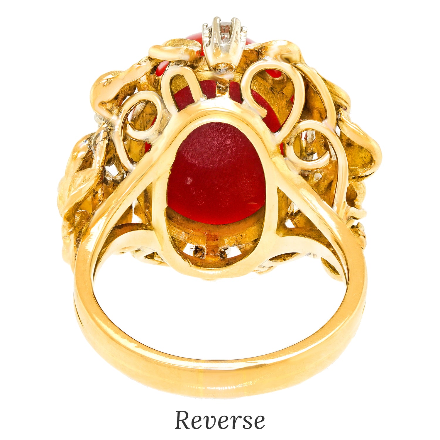 Circa 1960s, 18k, possibly Italy. From the old Gods to the Arts and Crafts movement, naturalistic motifs have always been part of spirit and style. This ring is decorated with vines profuse with leaves and berries, surrounding a lush, deeply-hued coral cabochon. The brilliance of the diamonds (.50ct I-H color VS clarity) underscores the narrative. Finely hand-made, this ring is in excellent condition.