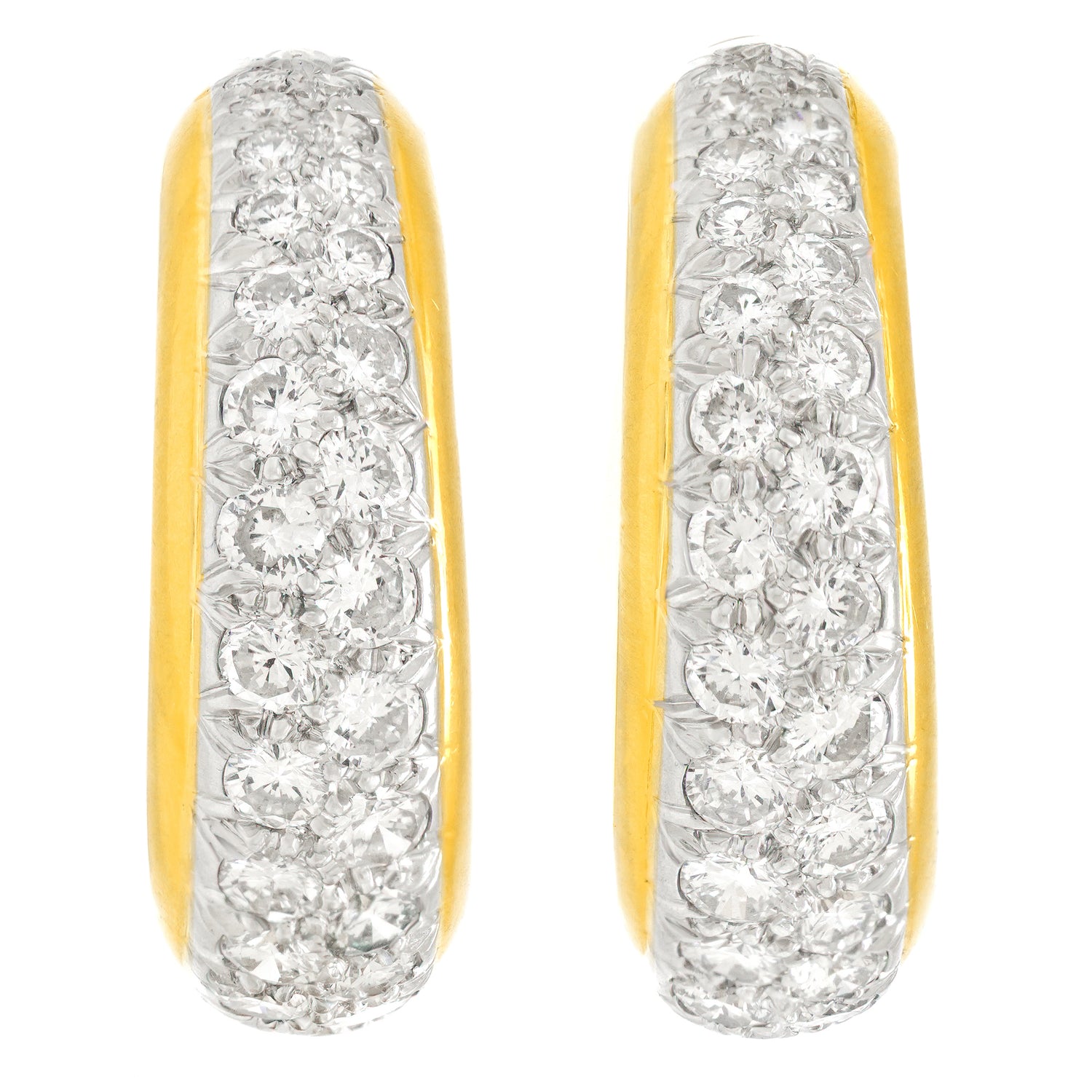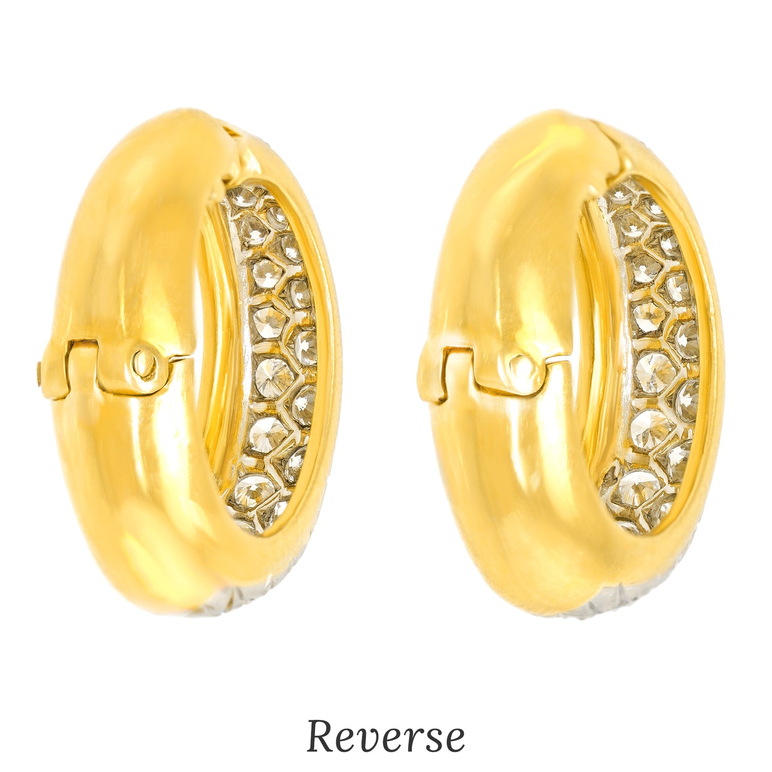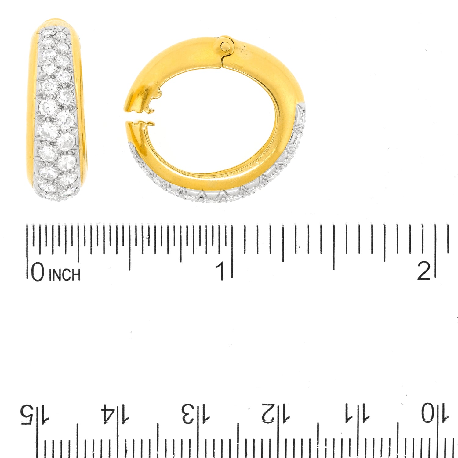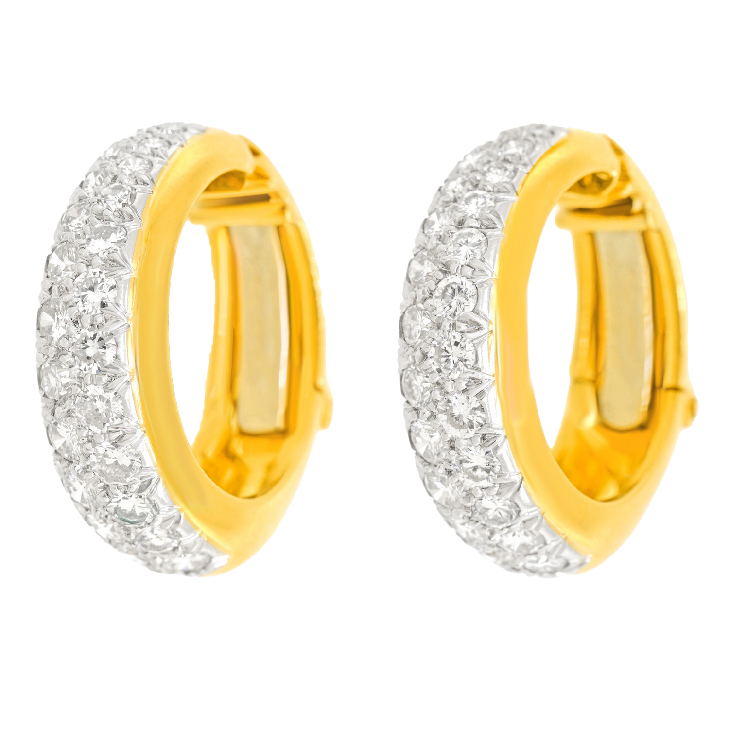 Circa 1960s, 18k/platinum, by David Webb, New York. These chic yellow gold hoops by David Webb are set with 1.75 carats of superb white diamonds (G color, VS clarity). The look breezily dresses up or down, comfortable with heels and jeans, a suit, or a cocktail dress. Made to David Webb's elite standards, these earrings are early and in excellent condition.