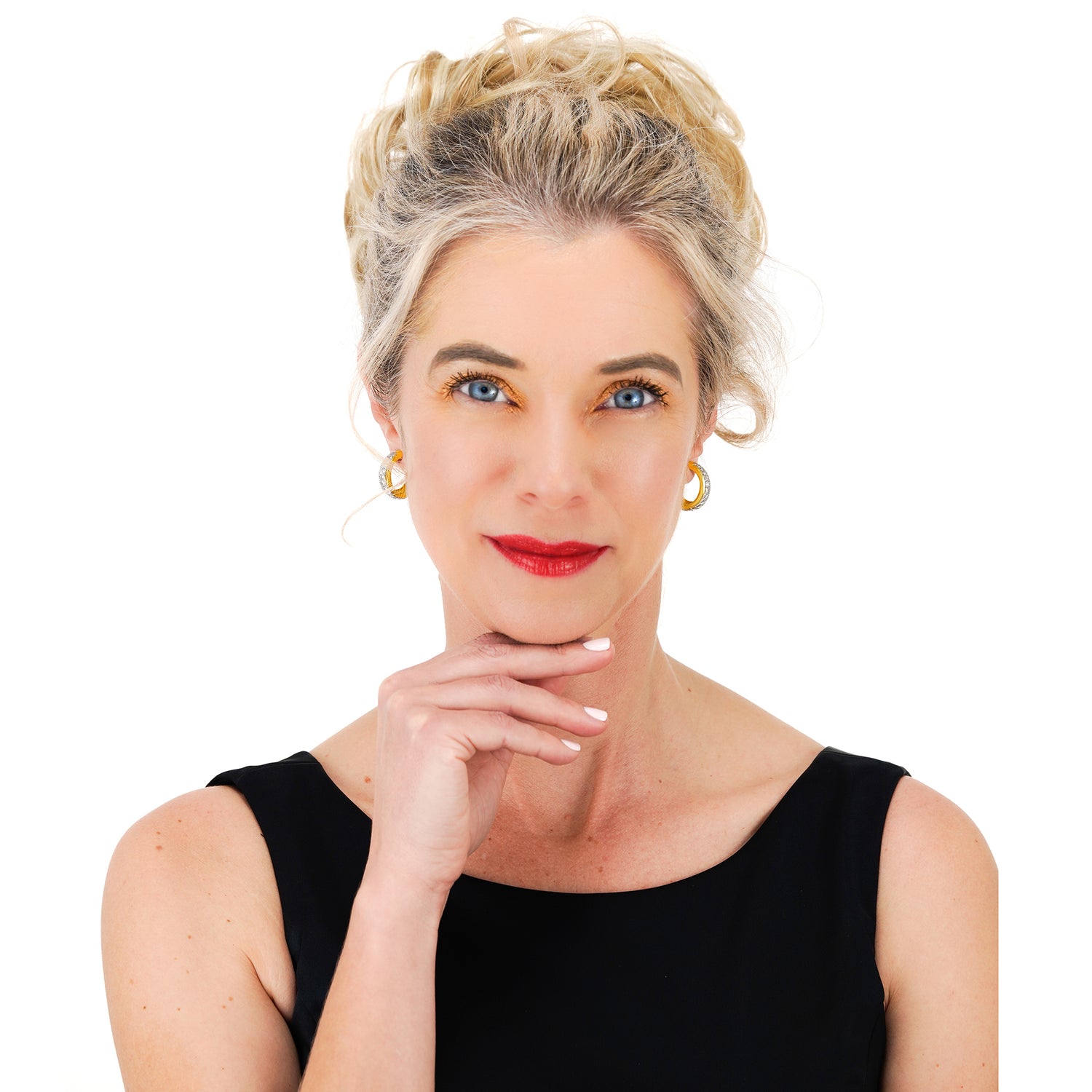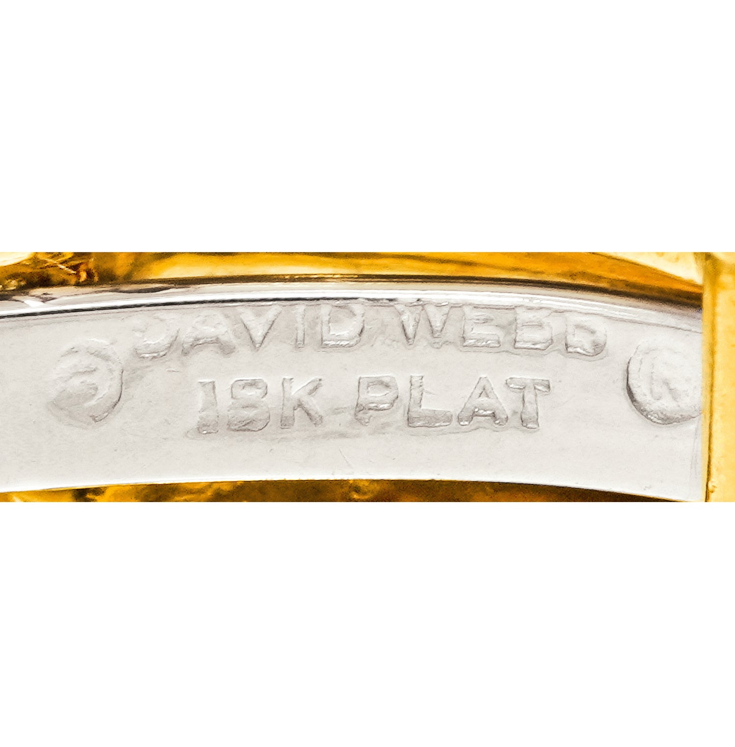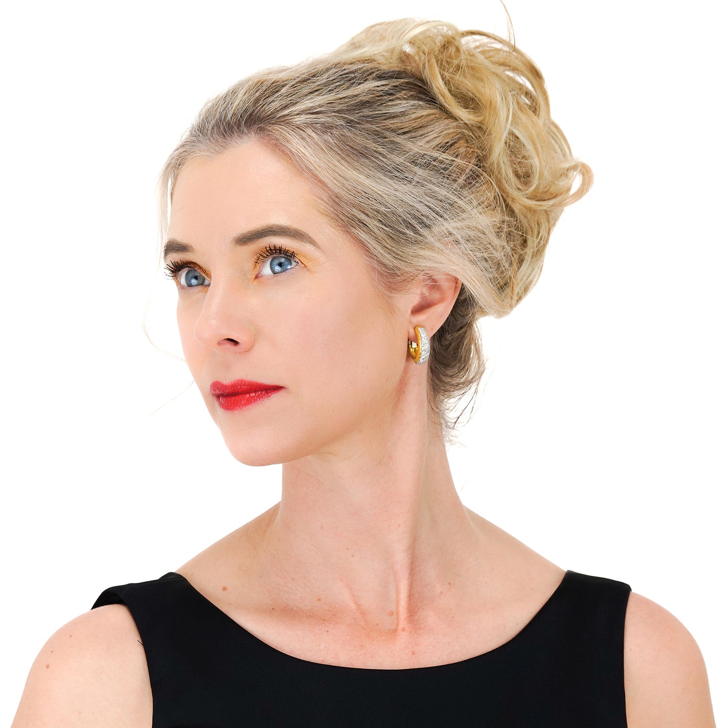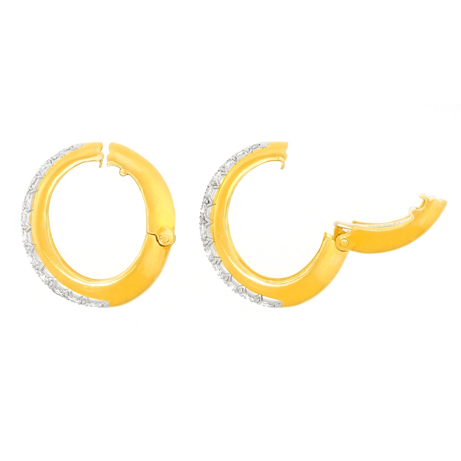Circa 1960s, 18k/platinum, by David Webb, New York. These chic yellow gold hoops by David Webb are set with 1.75 carats of superb white diamonds (G color, VS clarity). The look breezily dresses up or down, comfortable with heels and jeans, a suit, or a cocktail dress. Made to David Webb's elite standards, these earrings are early and in excellent condition.
