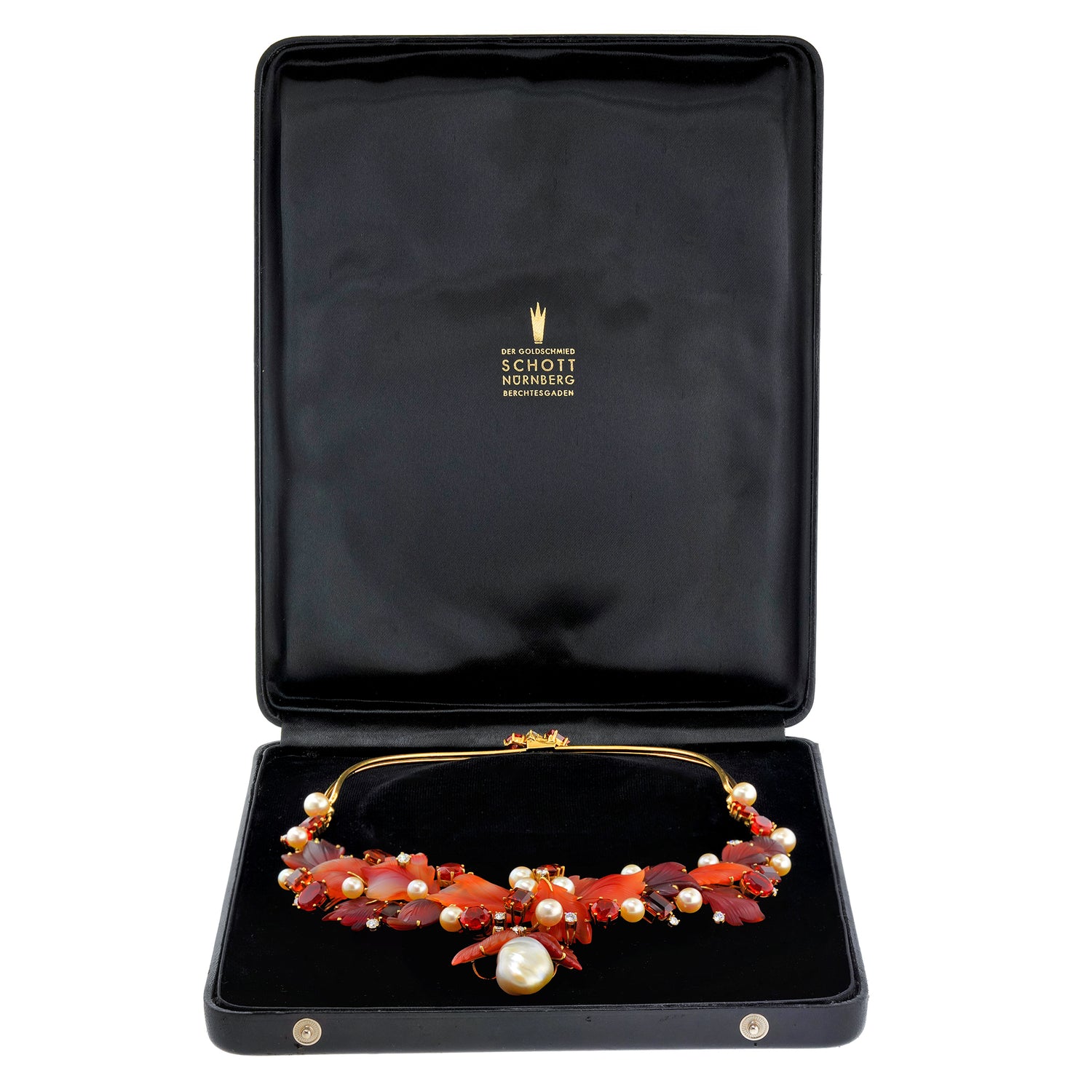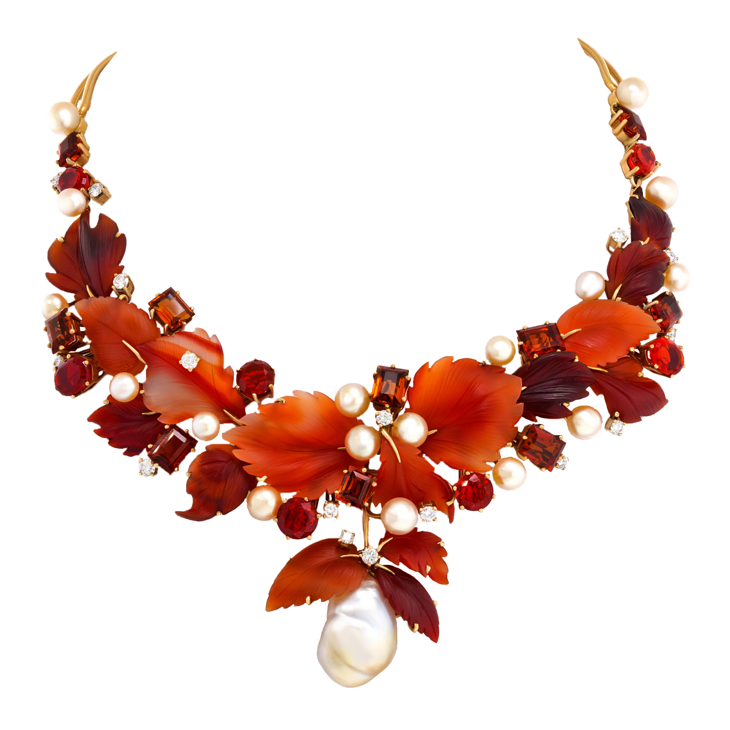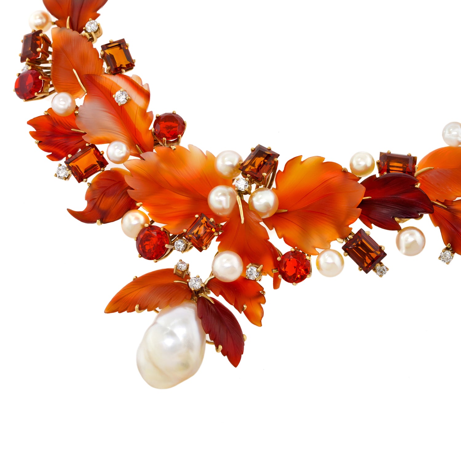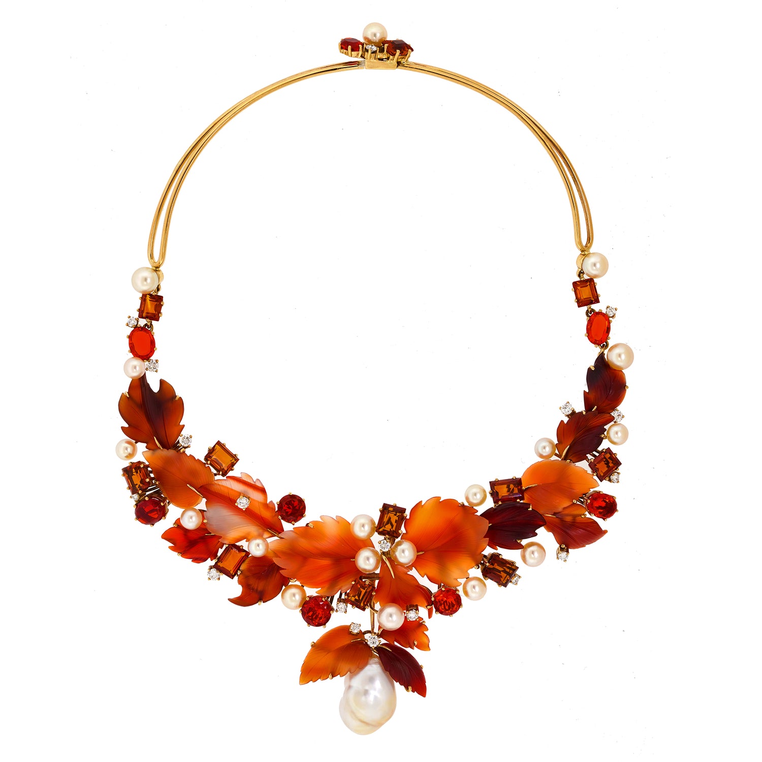 Circa 1980s, 18k, by Schott, Nurnberg, Germany. Featuring a sublime foliate motif, this one-of-a-kind necklace has a potent visual narrative. The carved hardstone leaves are adorned with 2.20 carats of fine white diamonds (G_H color VS clarity), fire opals, citrine, and luminous pearls. The look is brilliantly colorful and delightfully stylish. In its original box, the fabrication is meticulous. Excellent condition.