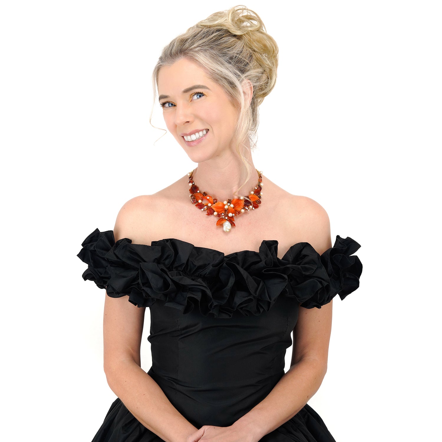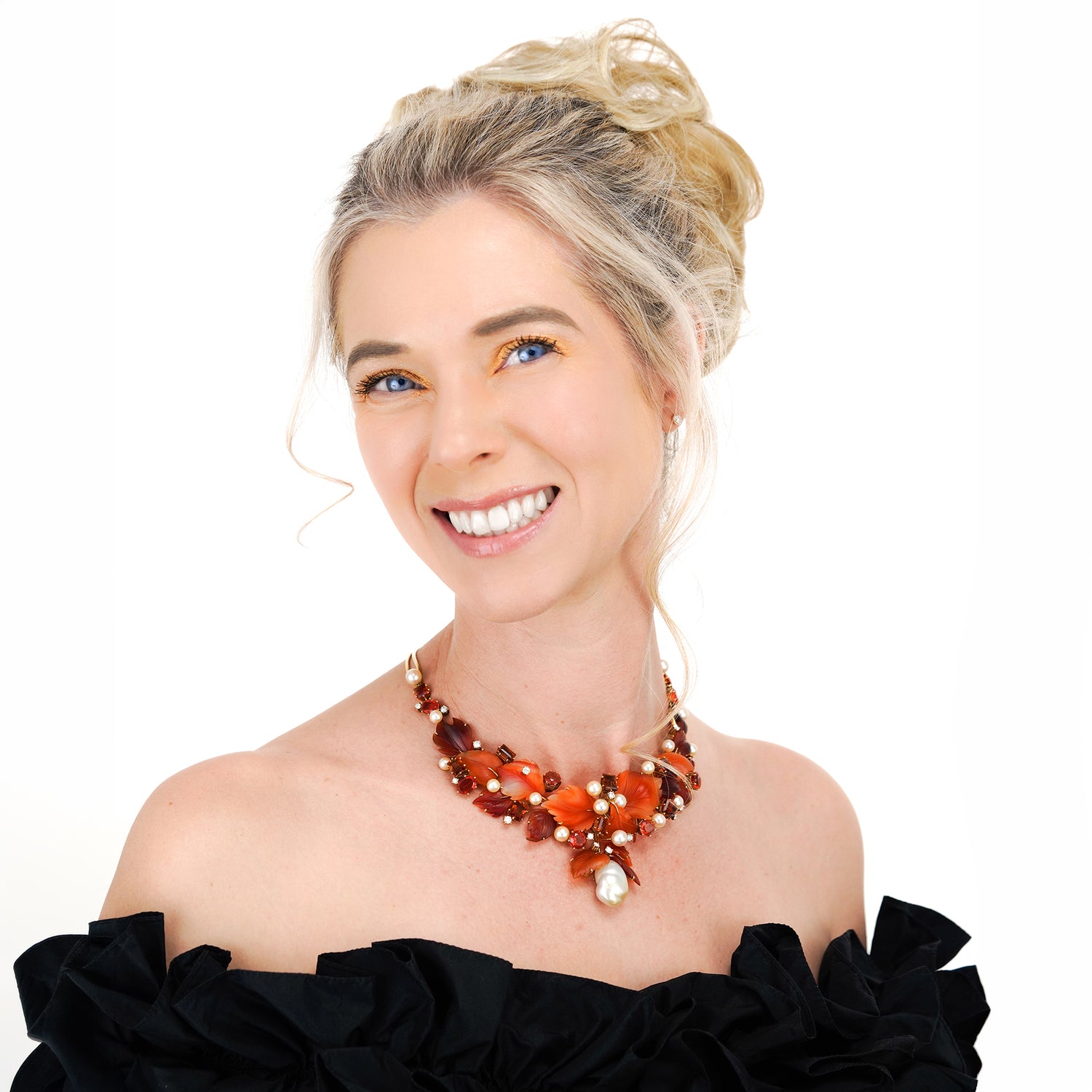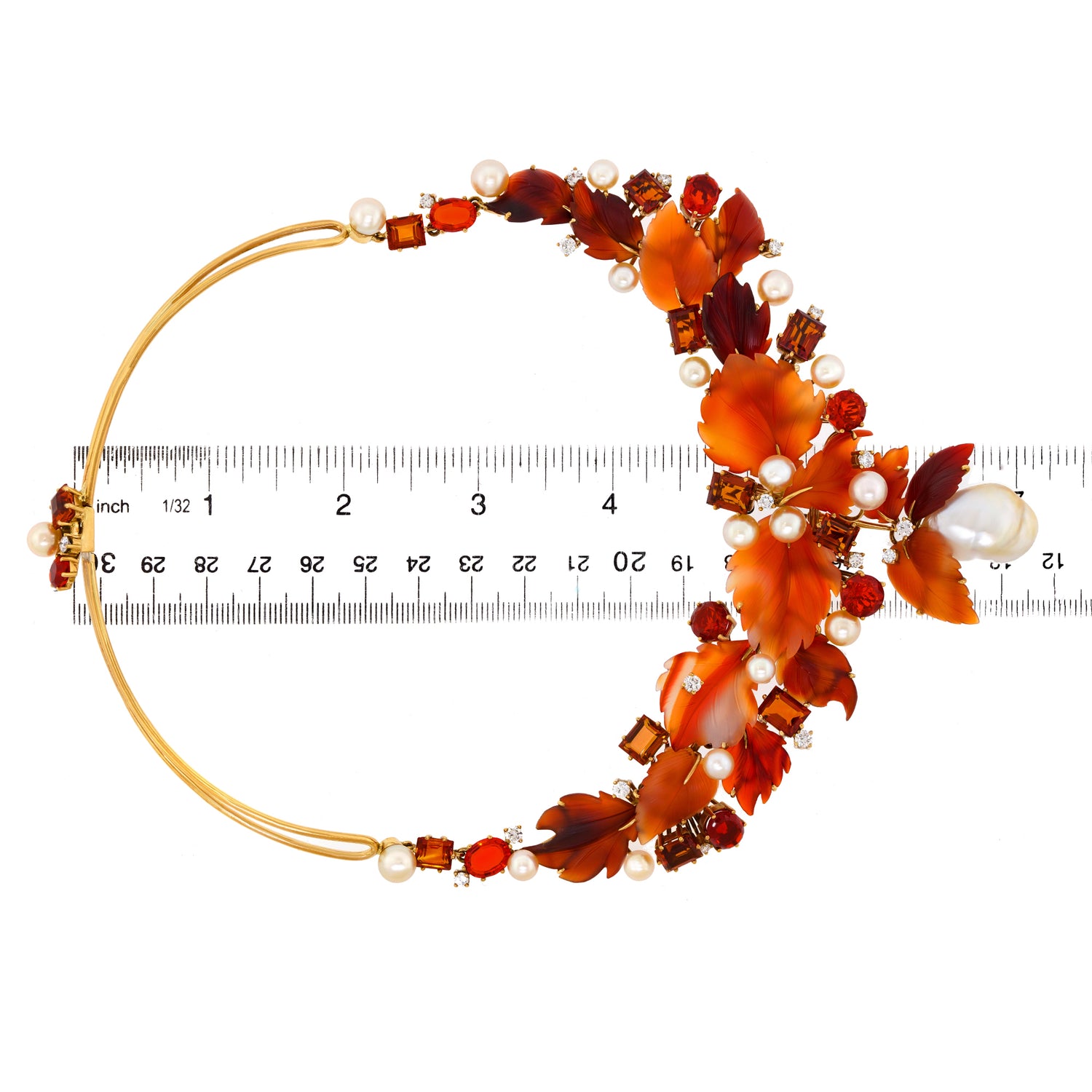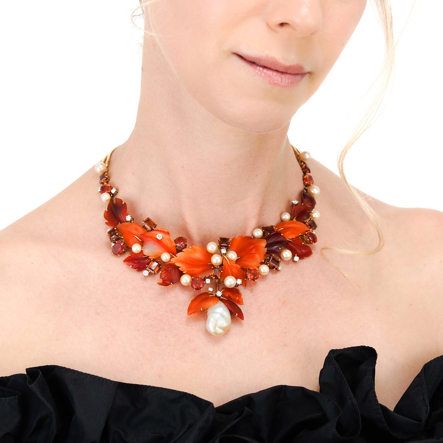 Circa 1980s, 18k, by Schott, Nurnberg, Germany. Featuring a sublime foliate motif, this one-of-a-kind necklace has a potent visual narrative. The carved hardstone leaves are adorned with 2.20 carats of fine white diamonds (G_H color VS clarity), fire opals, citrine, and luminous pearls. The look is brilliantly colorful and delightfully stylish. In its original box, the fabrication is meticulous. Excellent condition.
