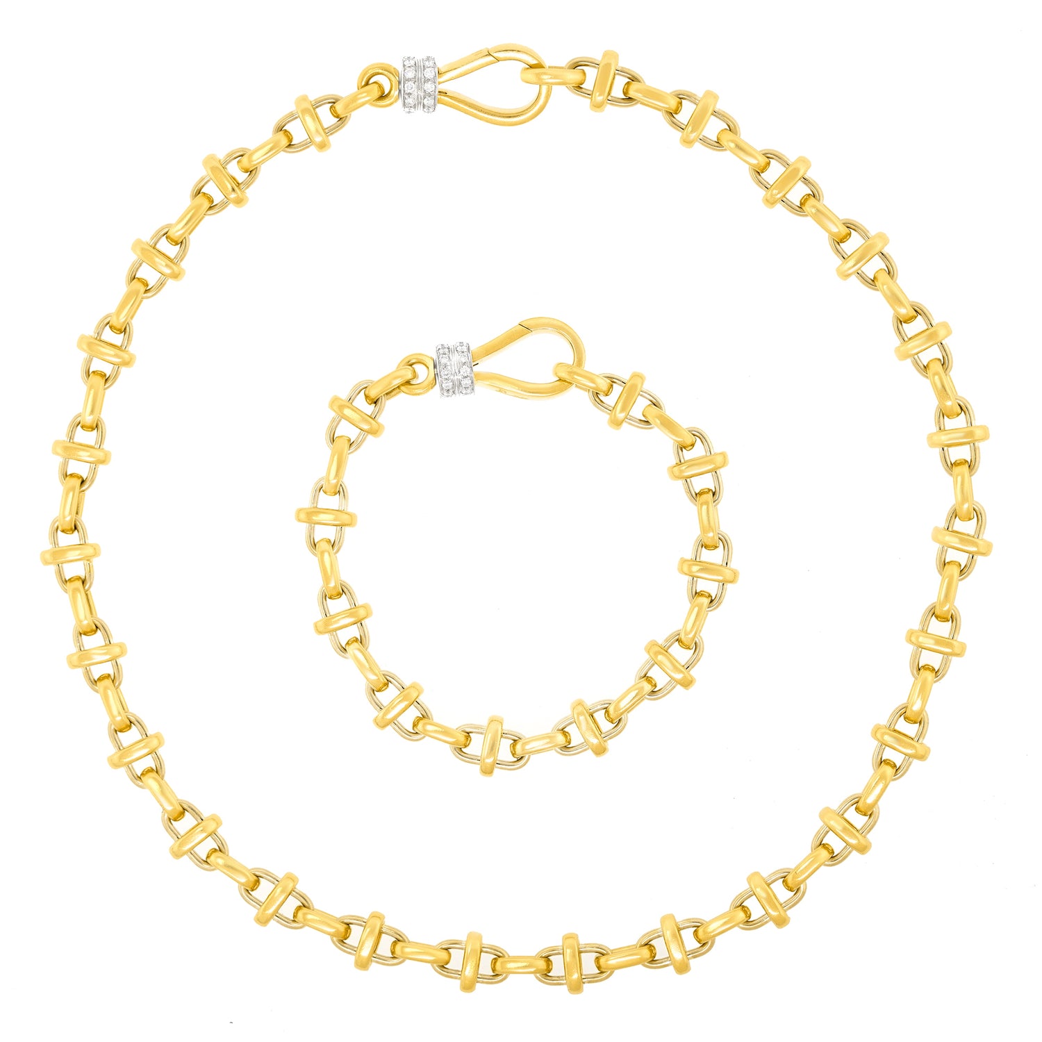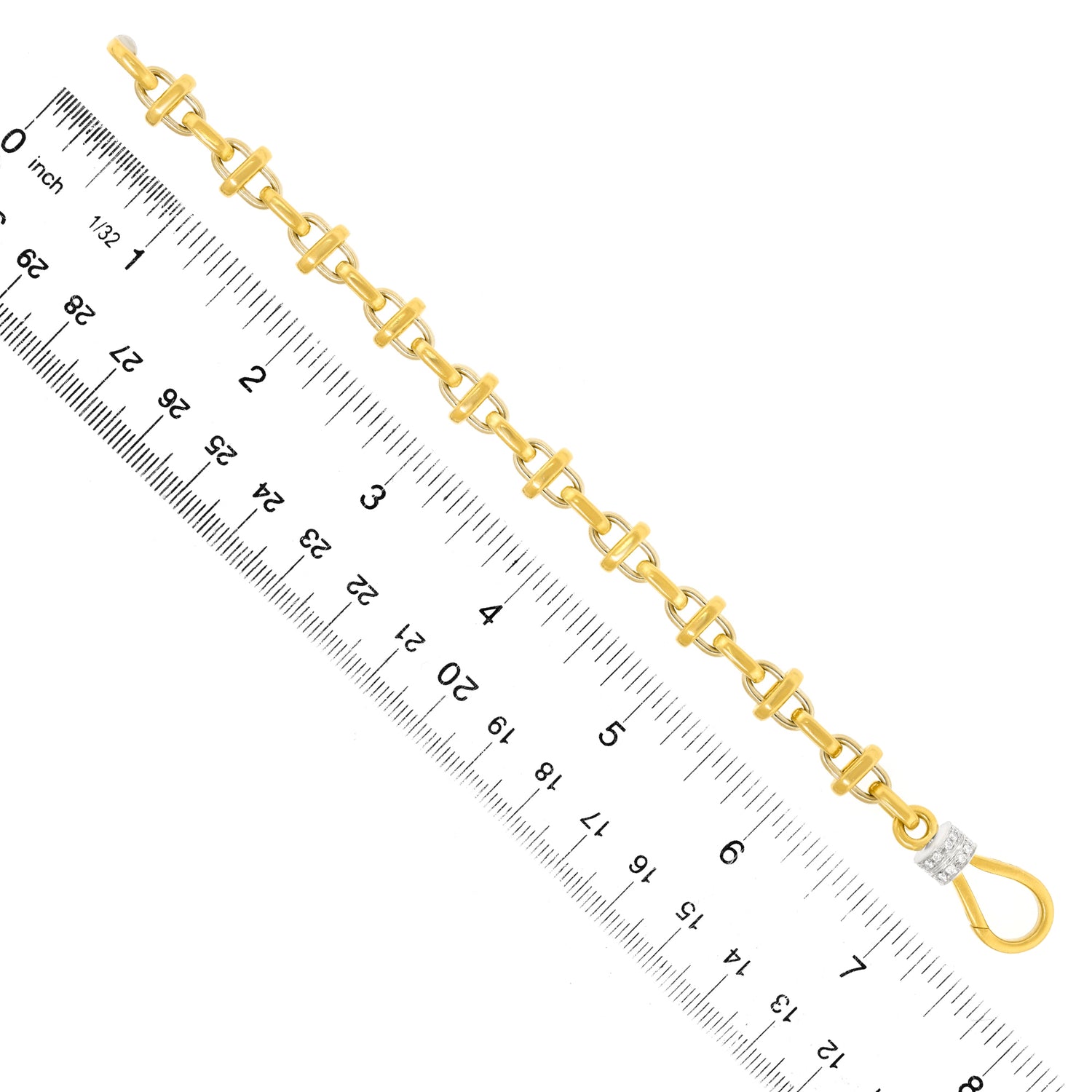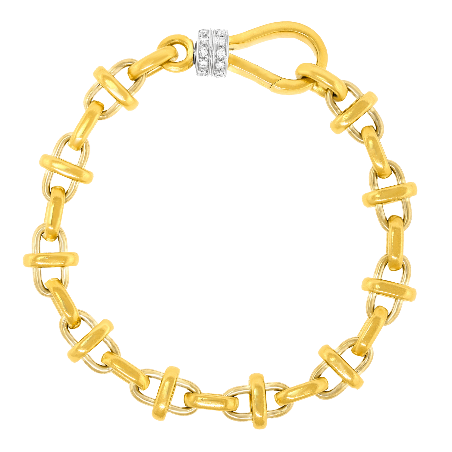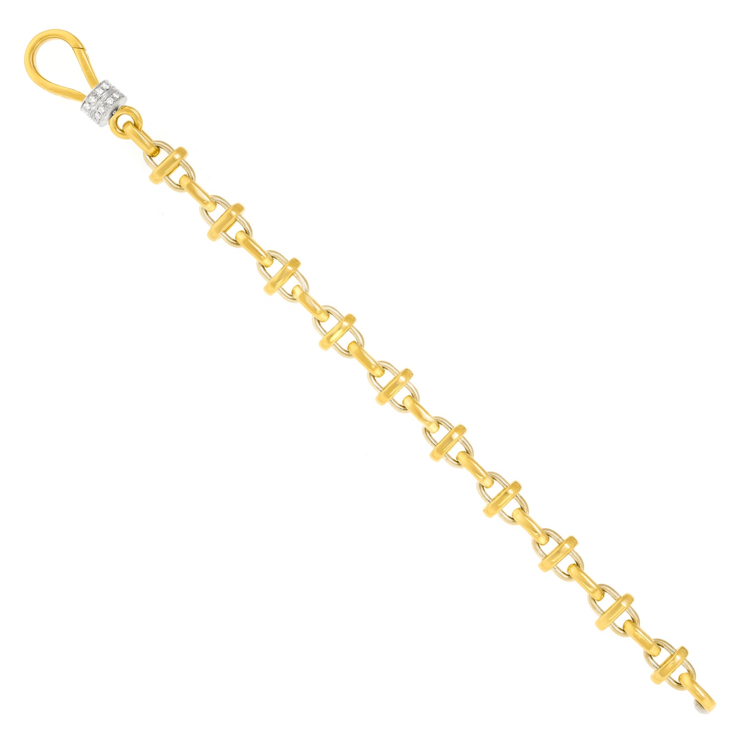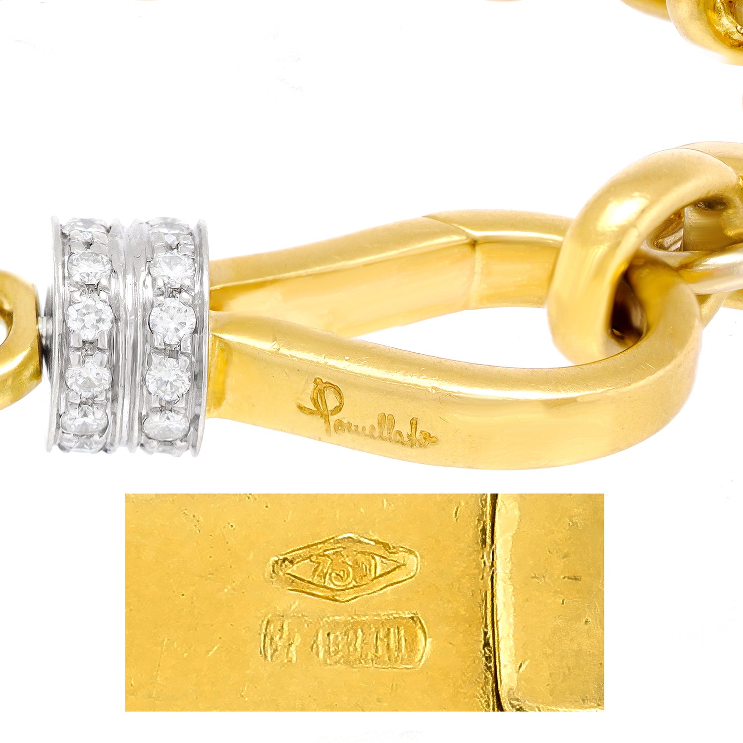 Circa 1980s, 18k, by Pomellato, Italy. Pomellato is one of my favorite Brands. Established in Rome in the late sixties, their approach to jewelry design often combines the essence of medieval and Renaissance jewelry with contemporary fashion. This 71/2-inch-long bracelet has a modernist feel, softened by Old World handwork. Its diamond-set catch is both functional and decorative, very much in the Pomellato design toolbox; form follows function, follows form. The complex doubled links give the piece visual texture. As always with Pomellato, beautifully made. Excellent condition.
