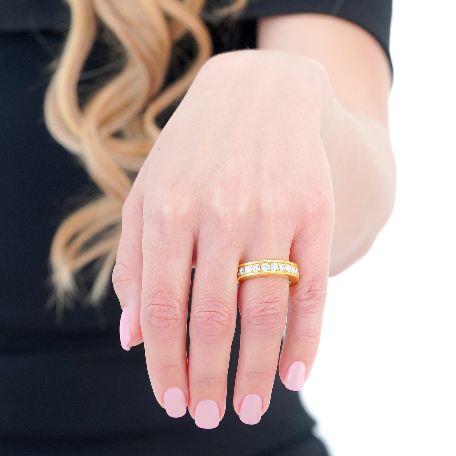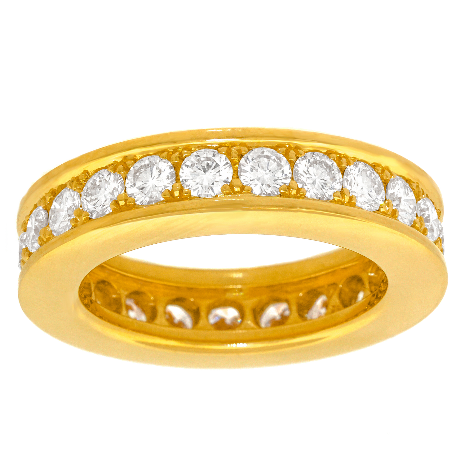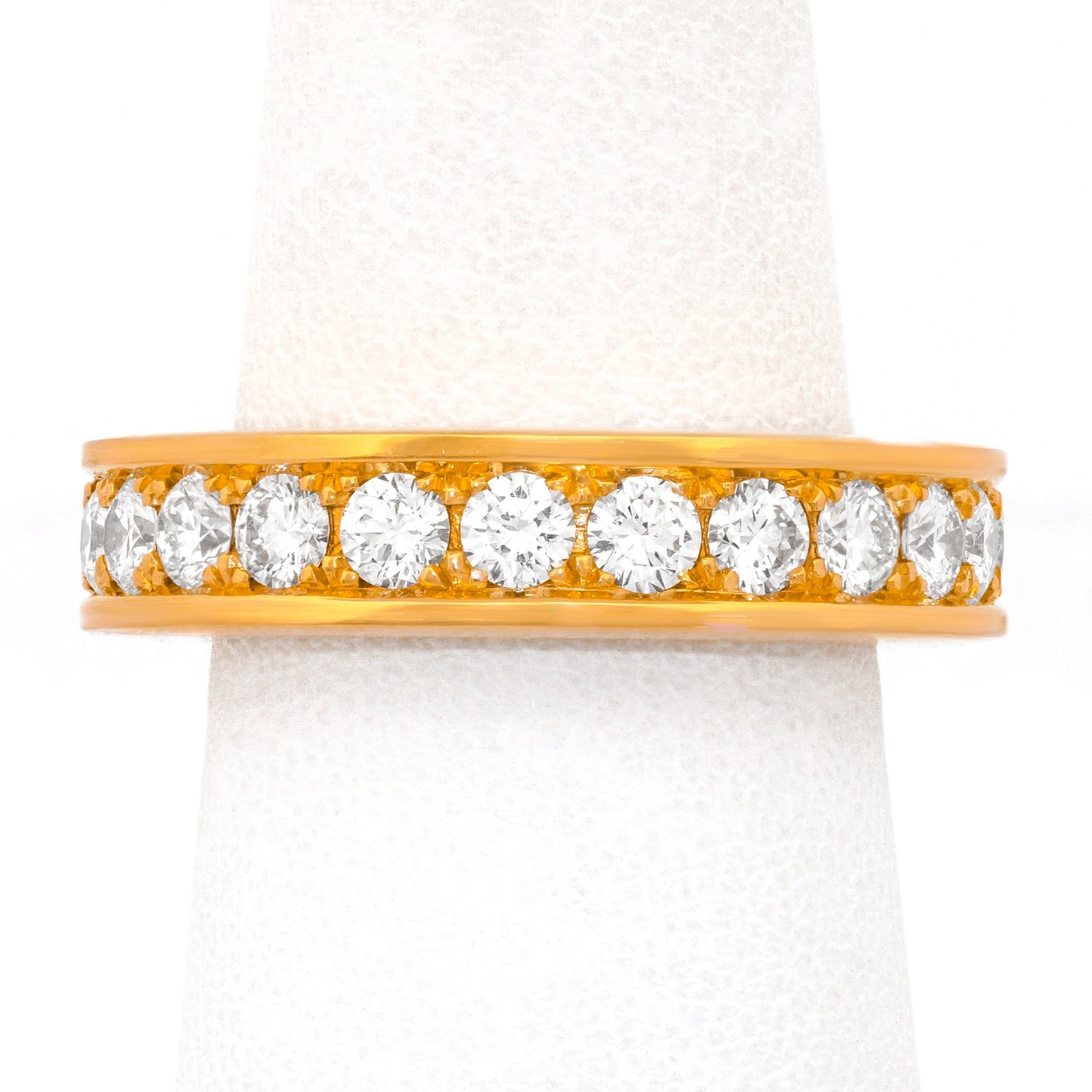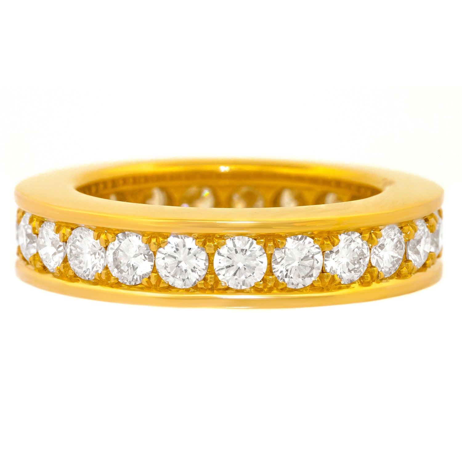 Circa 1970s, 18k, Swiss. This elegant seventies eternity band features 3.22 carats of fine white diamonds (G-H color, VS clarity) set into rich eighteen karat yellow gold. Unusually wide, the look is modern and crisp. Excellent condition.