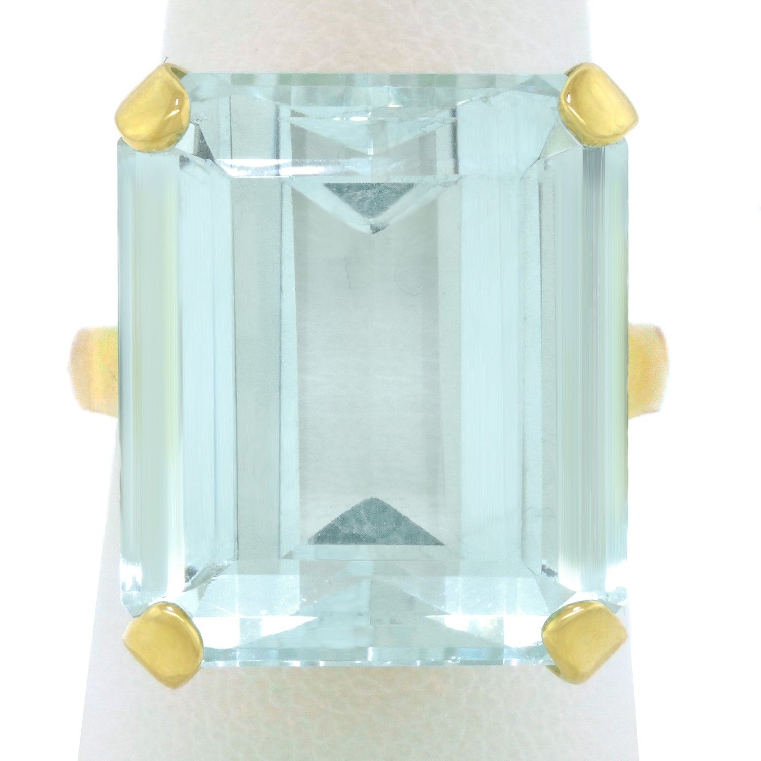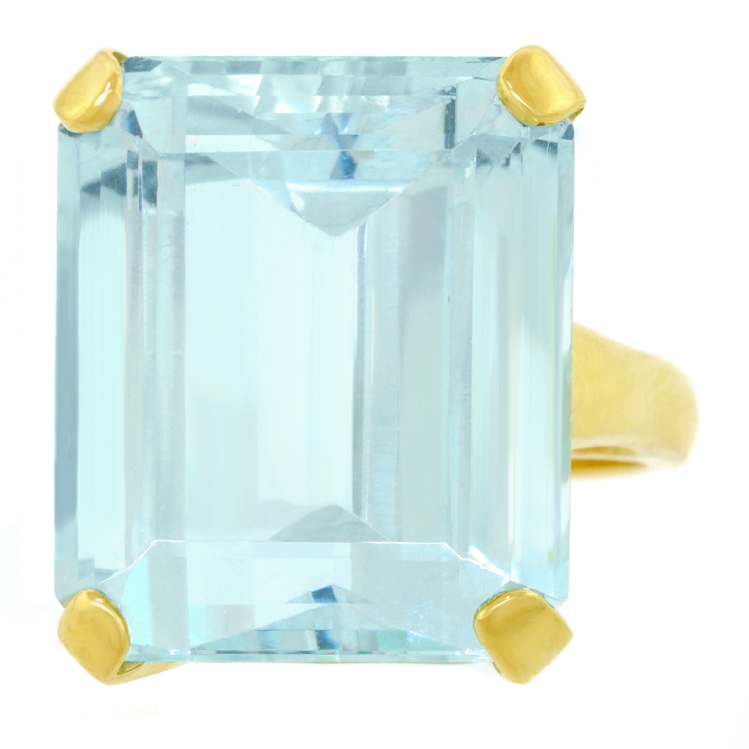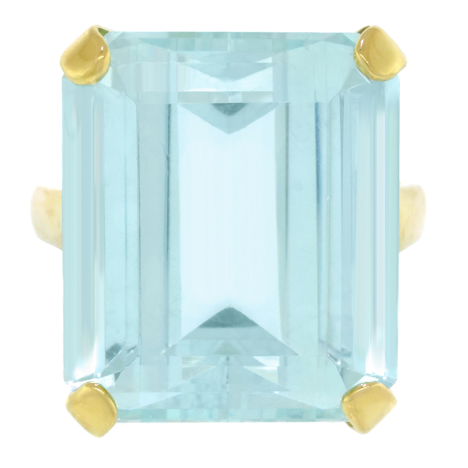 Circa 1950s, 14k, American. Brilliantly fifties, this timeless jewel features a 30.0-carat luminous aquamarine. The look is colorfully bold American glamour, fifties style. Well-made in 14k yellow gold, this ring is in excellent condition.