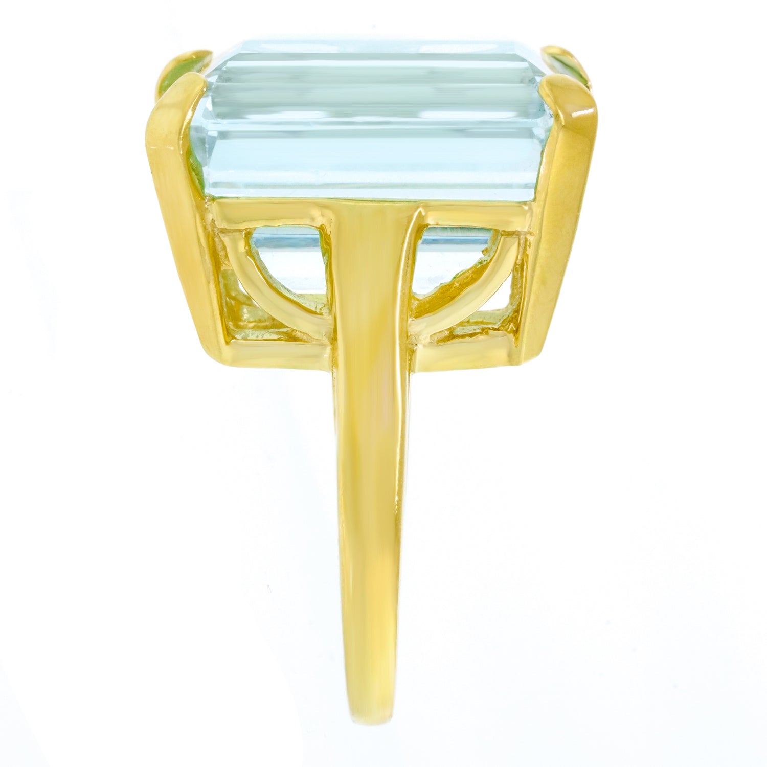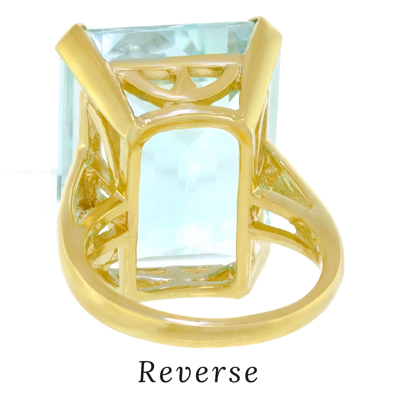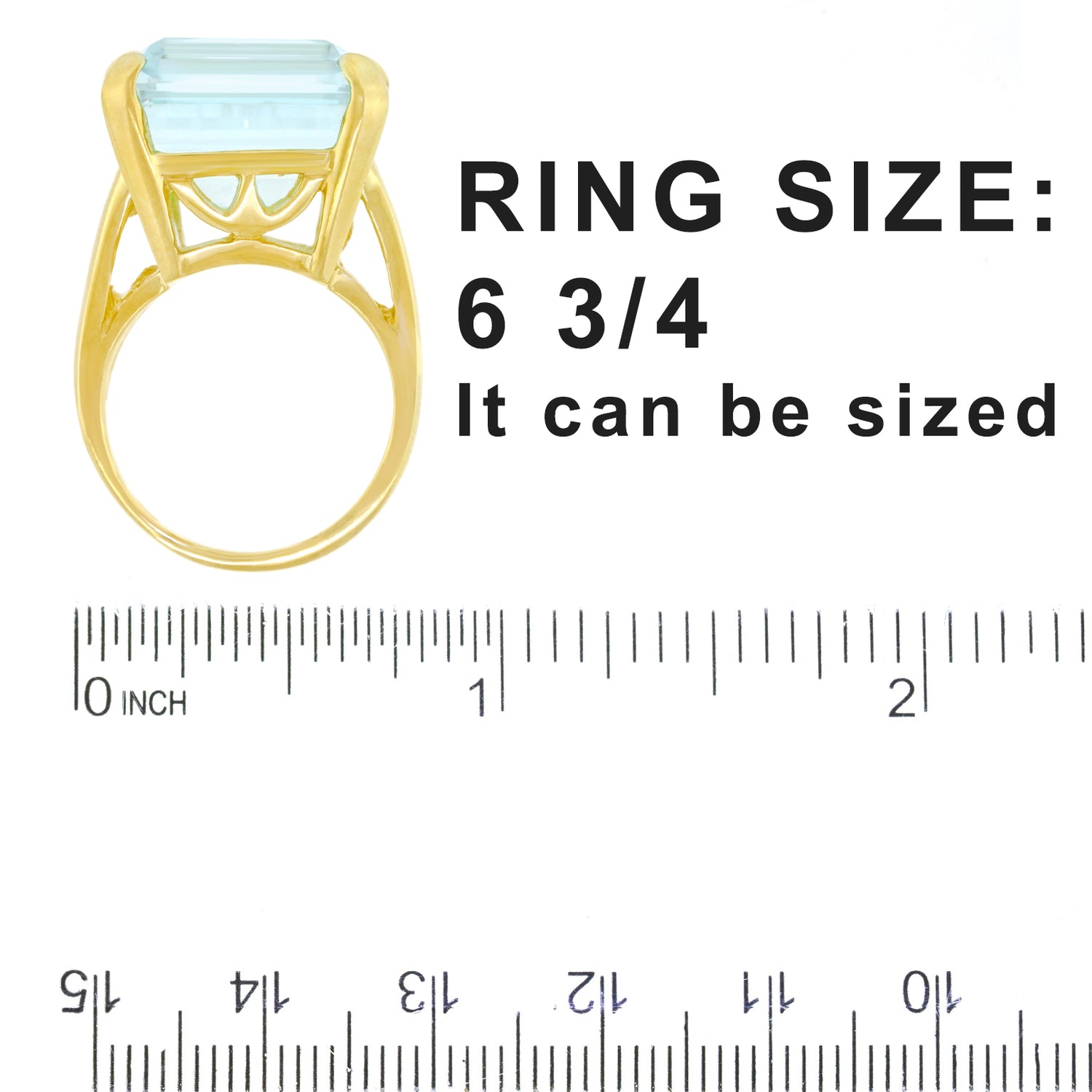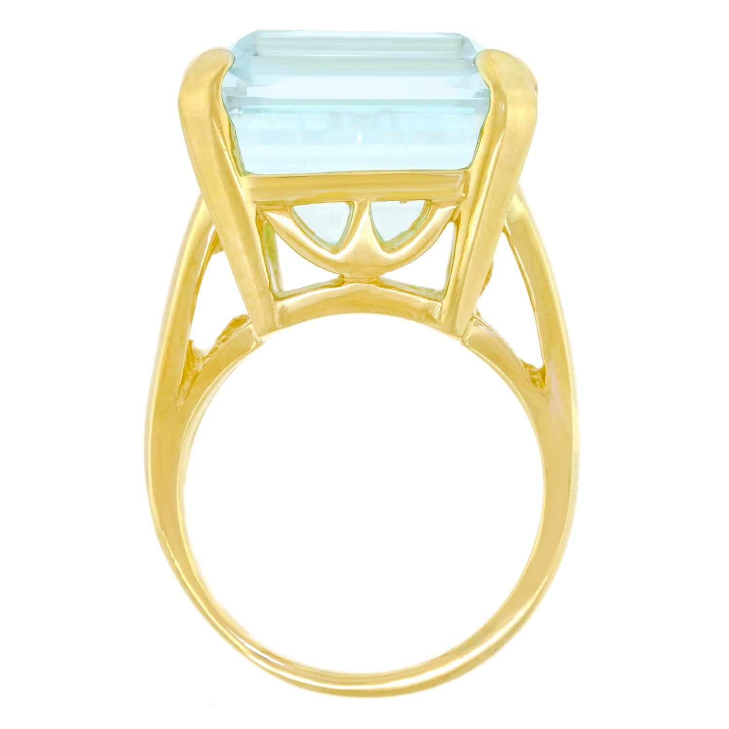 Circa 1950s, 14k, American. Brilliantly fifties, this timeless jewel features a 30.0-carat luminous aquamarine. The look is colorfully bold American glamour, fifties style. Well-made in 14k yellow gold, this ring is in excellent condition.
