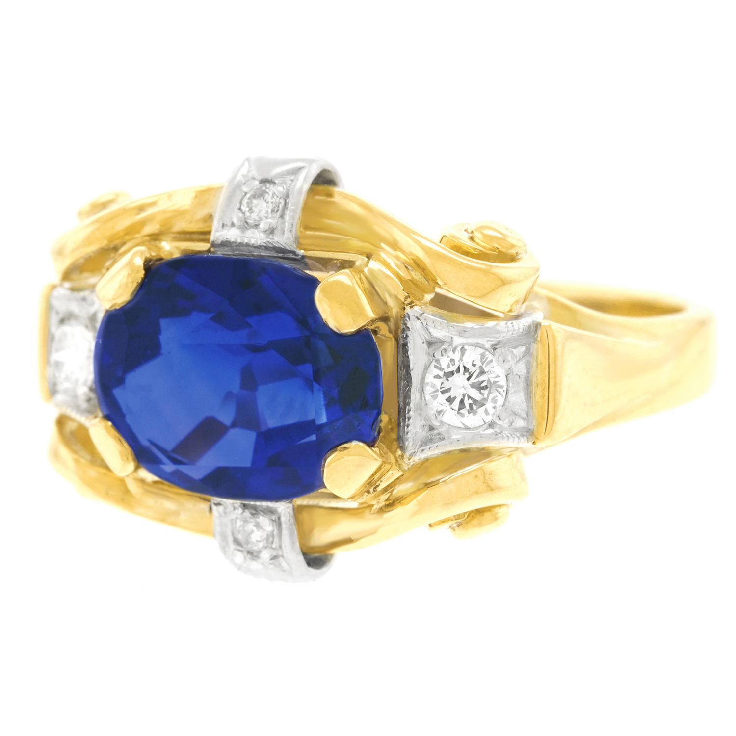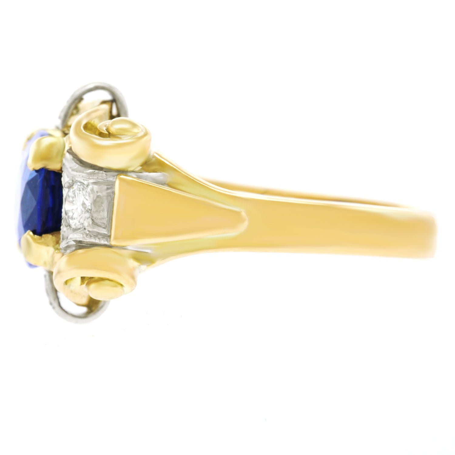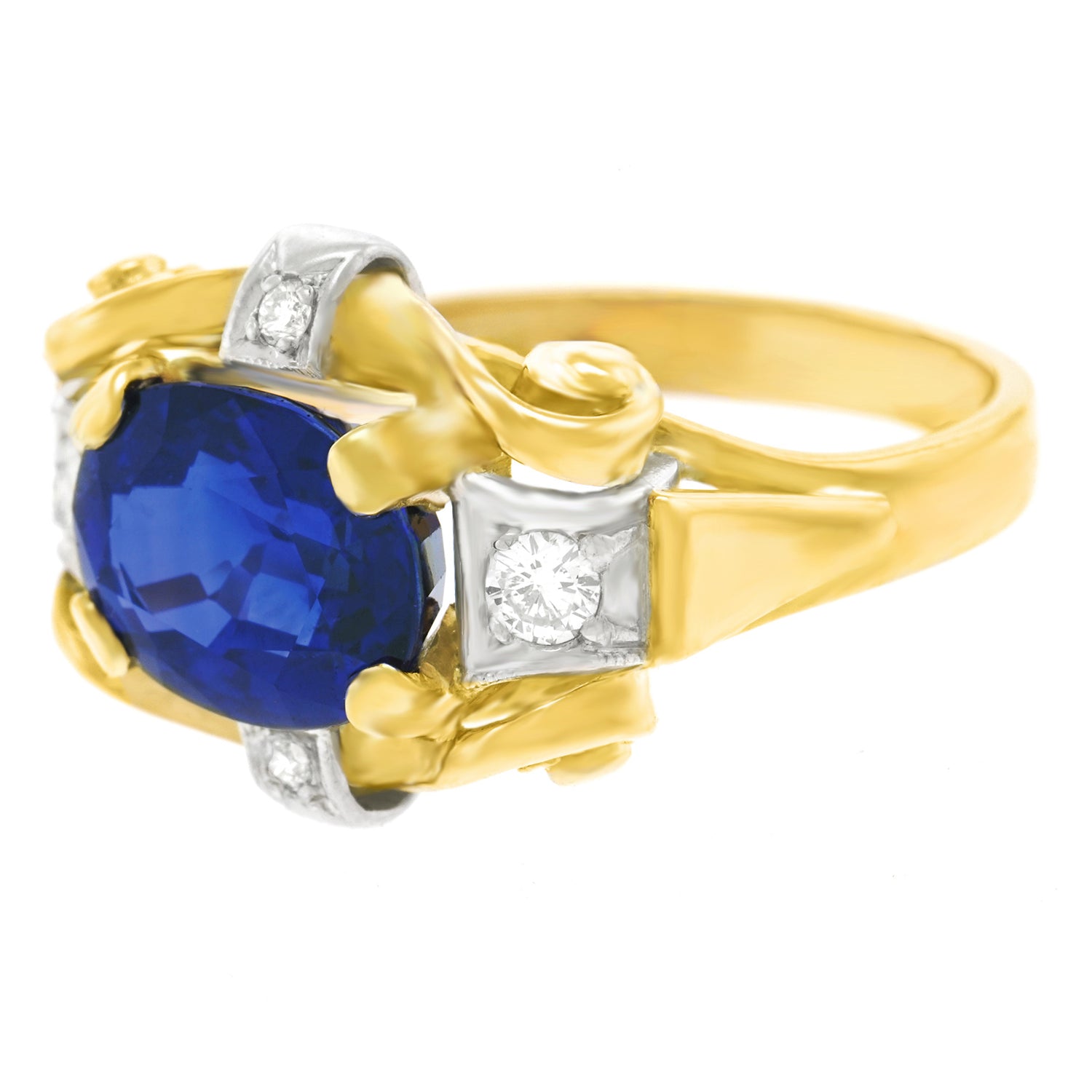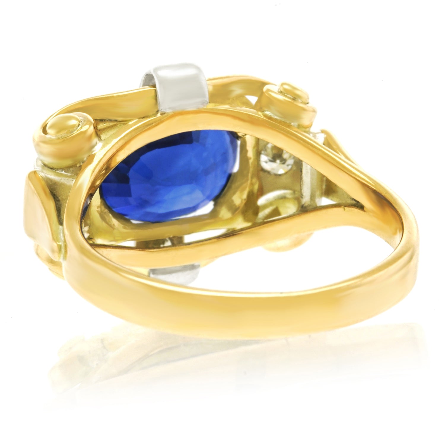 Circa 1920s, 14k. This stunning one-of-a-kind Art Deco ring features a spectacular 4.01-carat cornflower blue sapphire. The gold work is reminiscent of Edgar Brandt's ironwork, with scrolled lines and sleek strap-work. The look is understated, sophisticated, and very chic. Handmade, it is in excellent condition.