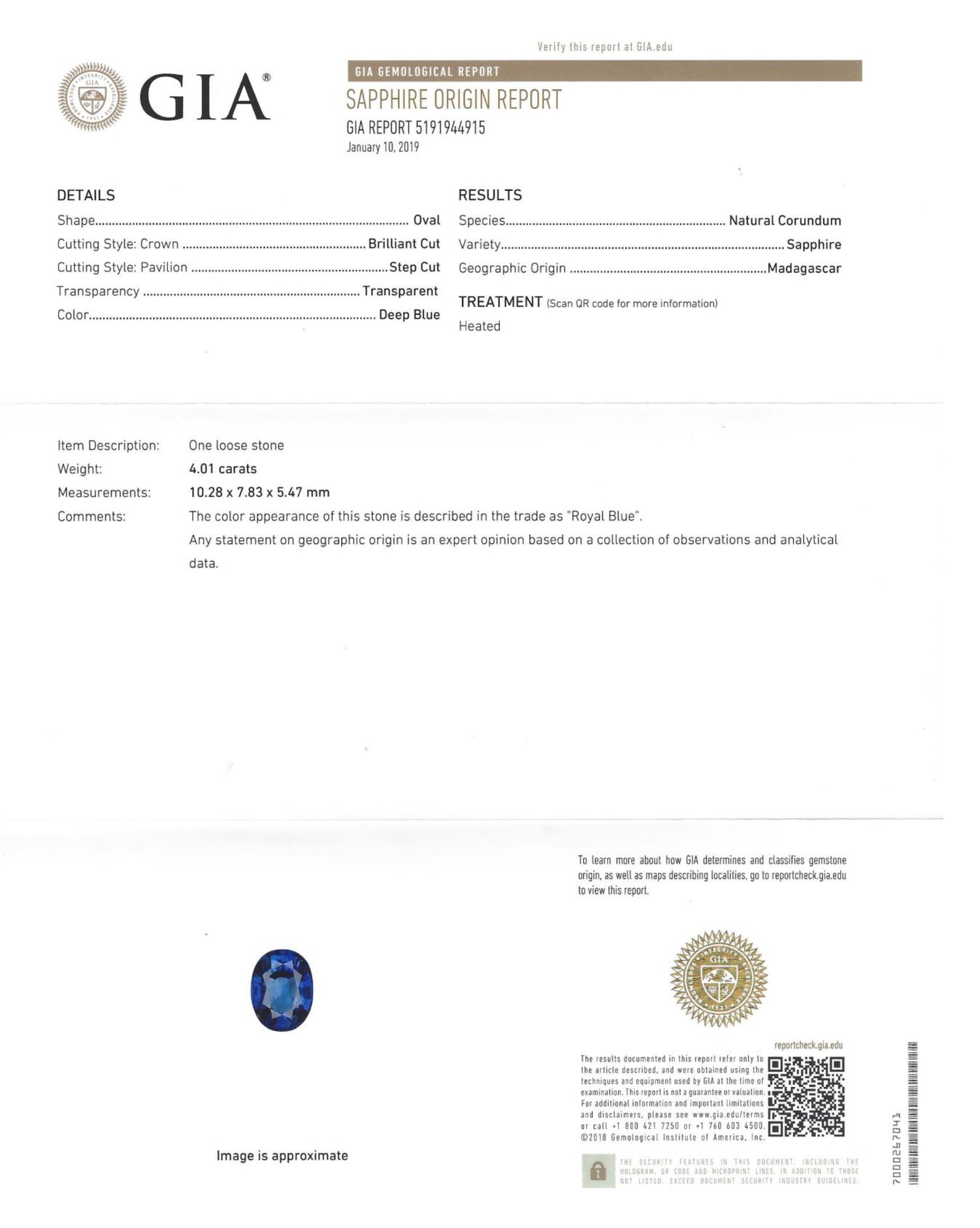 Stones: 4.01 carat heated, Madagascar sapphire and .15 carats total weight of G color, VS clarity diamonds