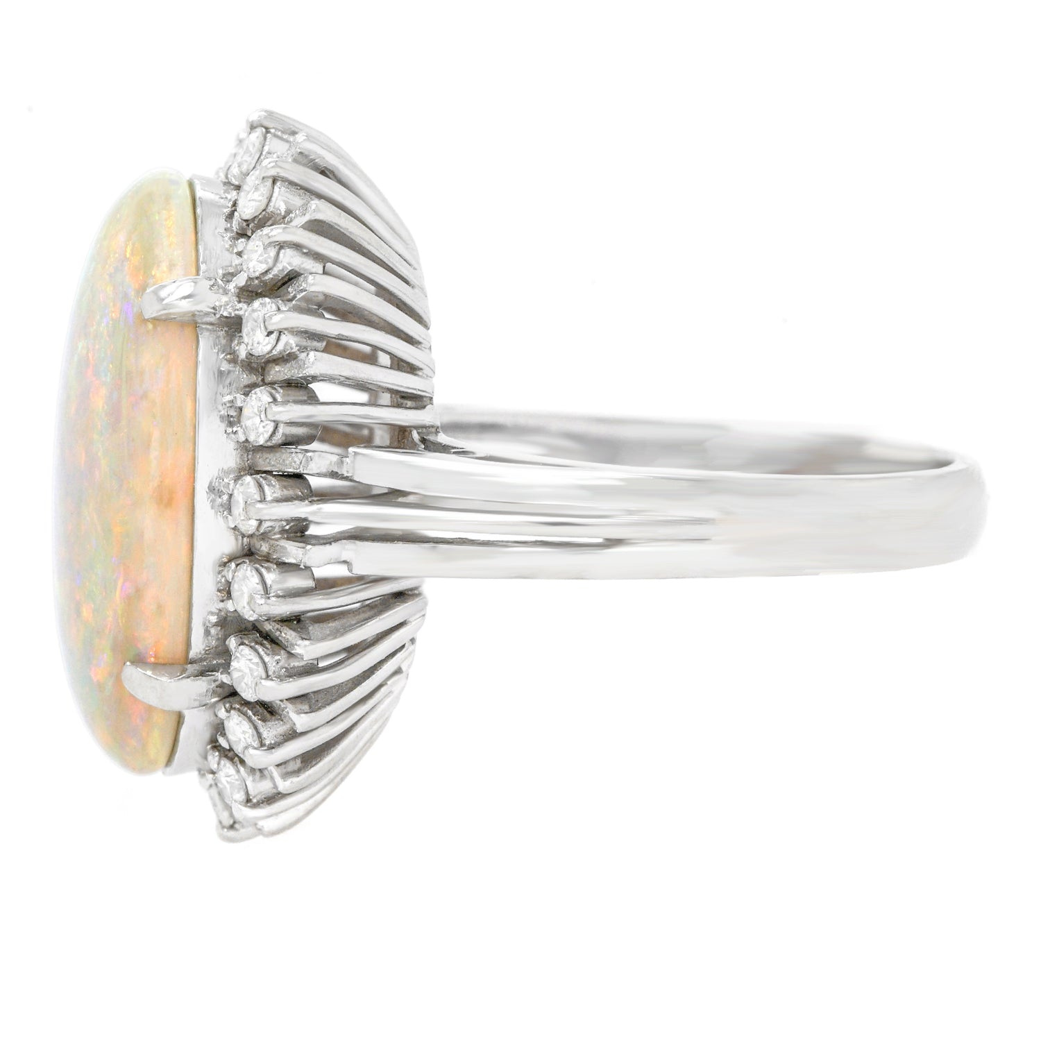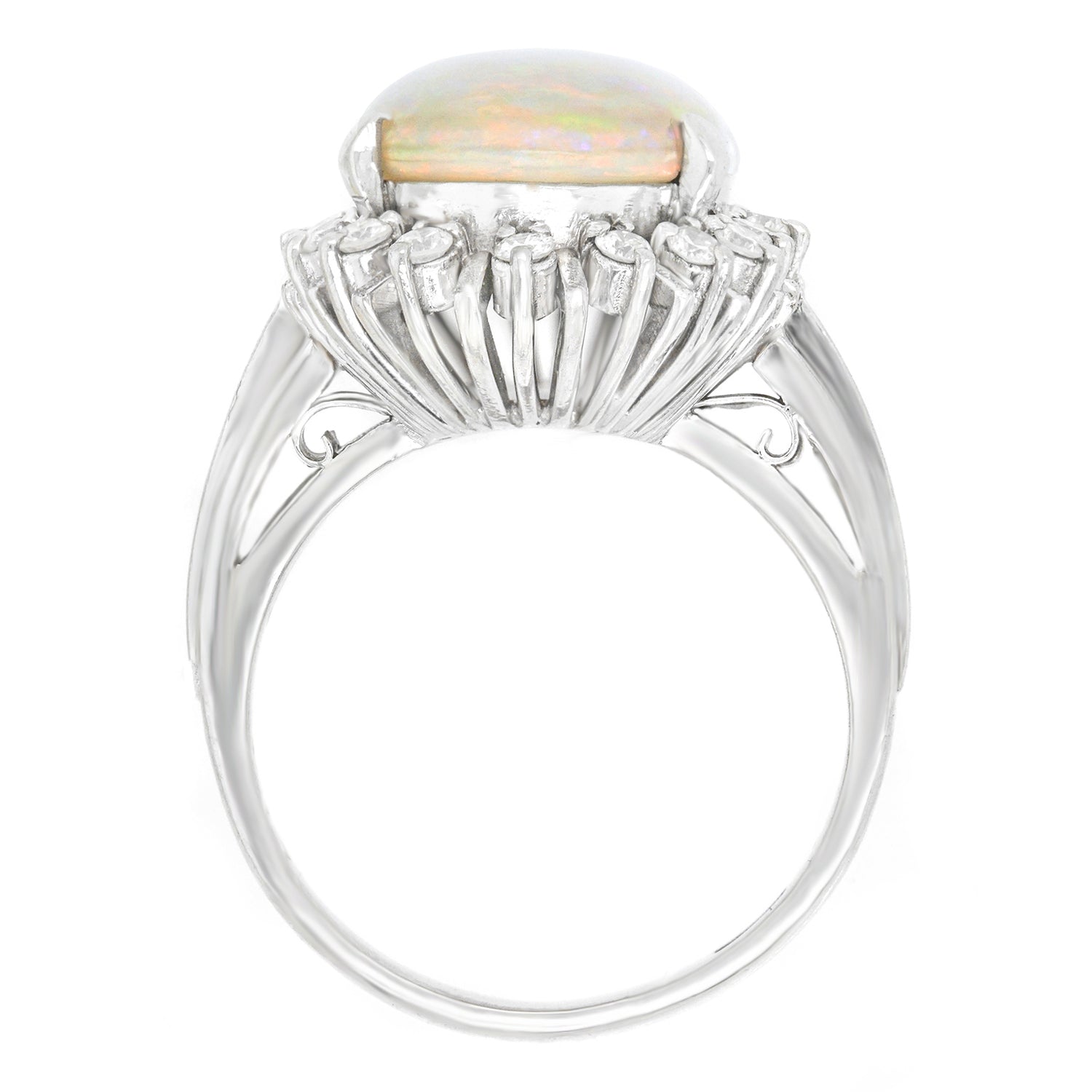 Circa 1950s, Platinum, American.  This classic fifties platinum ring is all about the scintillating 4.17-carat cabochon opal. Displaying green, blue, orange, and red in varying hues, this stone has excellent fire and sublime play of light. .46 carats of white diamonds surround the main stone, interspersed with hand-textured elements that add visual dimension. Finely made, the look is brilliantly glamorous. Excellent condition.