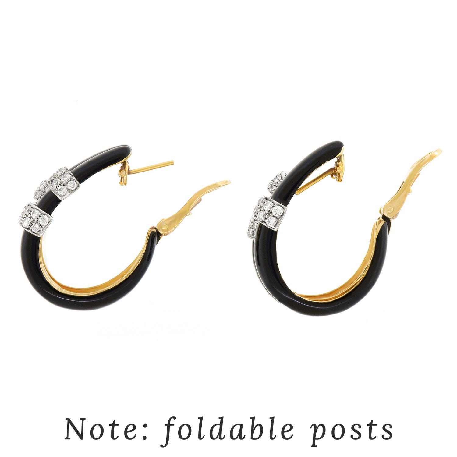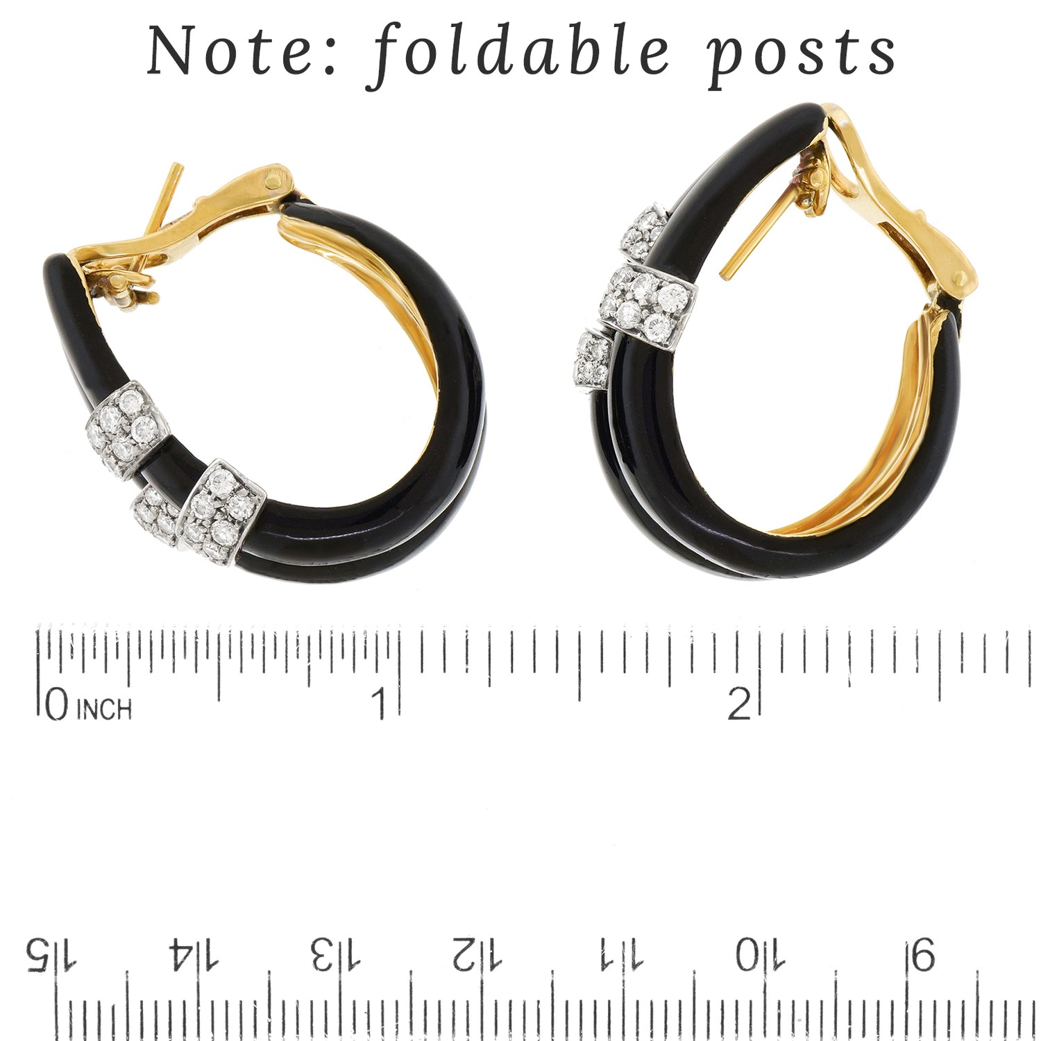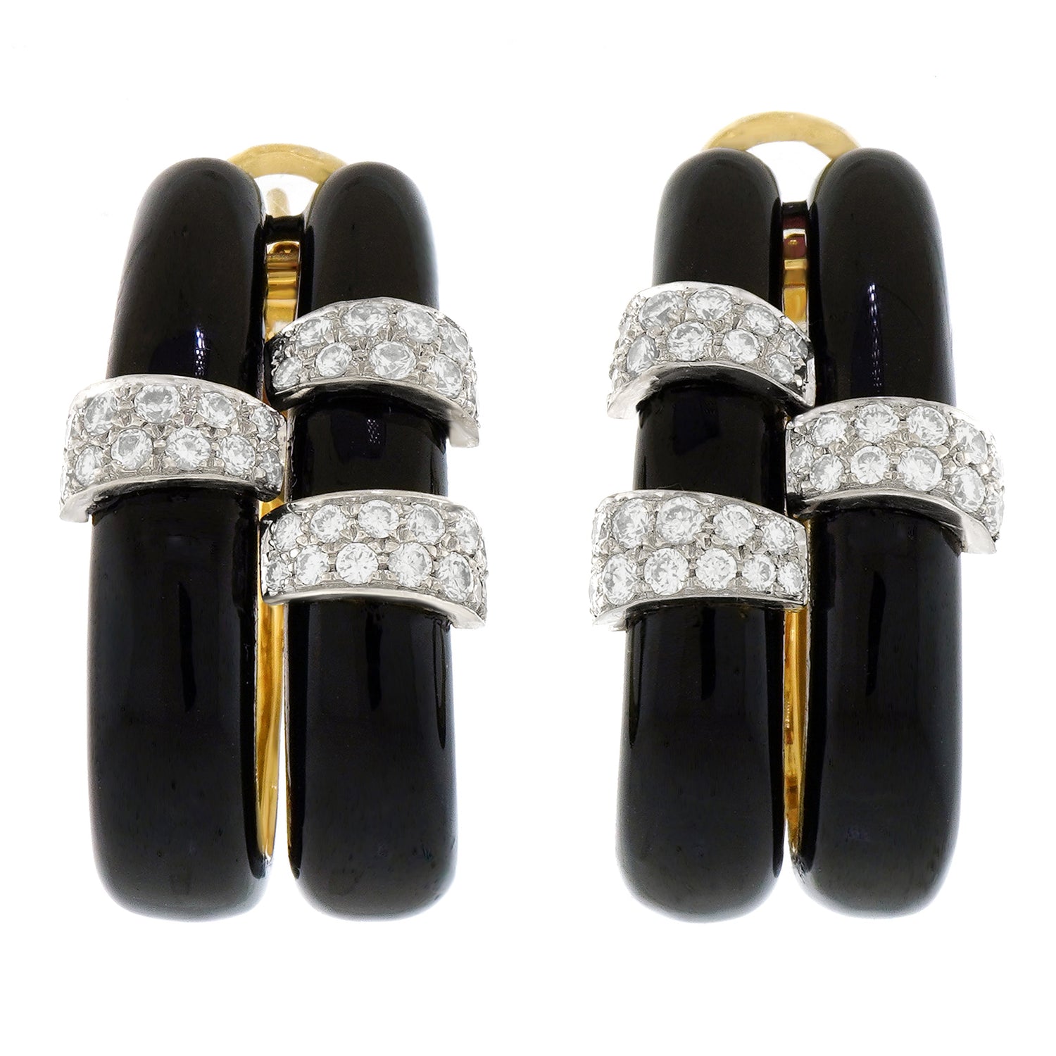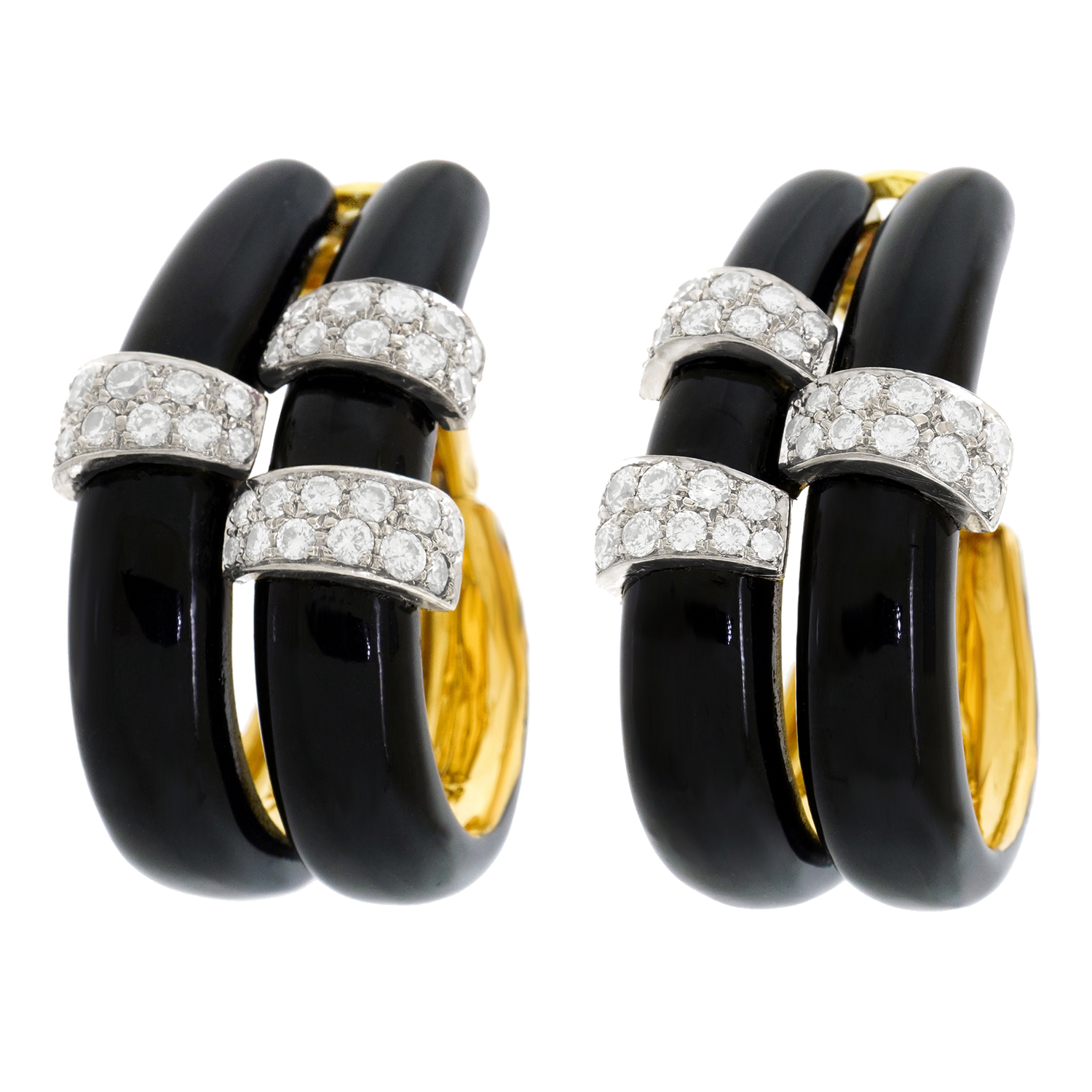 Circa 1980s, 18k, by Adler, Genève, Switzerland.  Black and White, understated Genèven style… brilliant white diamonds and high gloss black lacquer! These elegant eighties earrings are a fearless fashion statement. Effortlessly dressing up or down, they make any look. In a city of stylish jewelers, Adler of Genève is a stand-out, both for quality and design. Excellent condition.