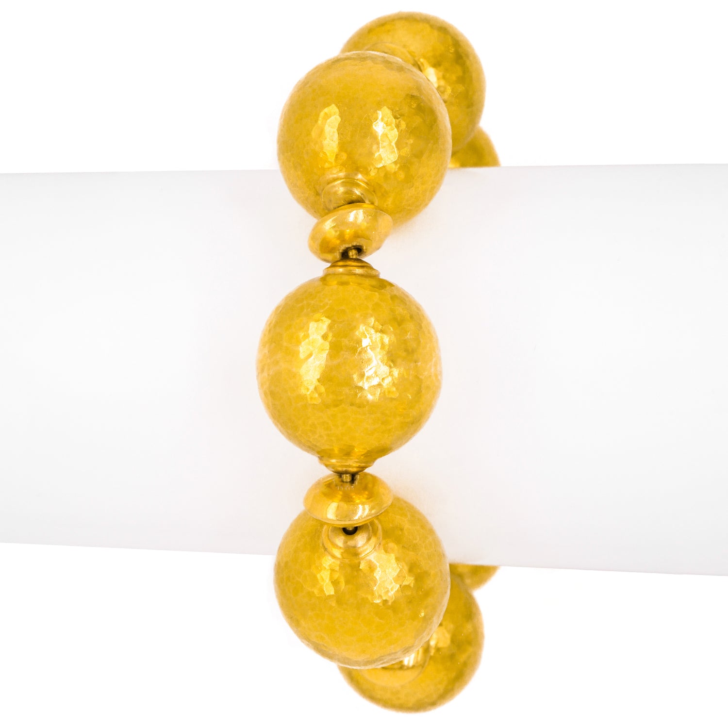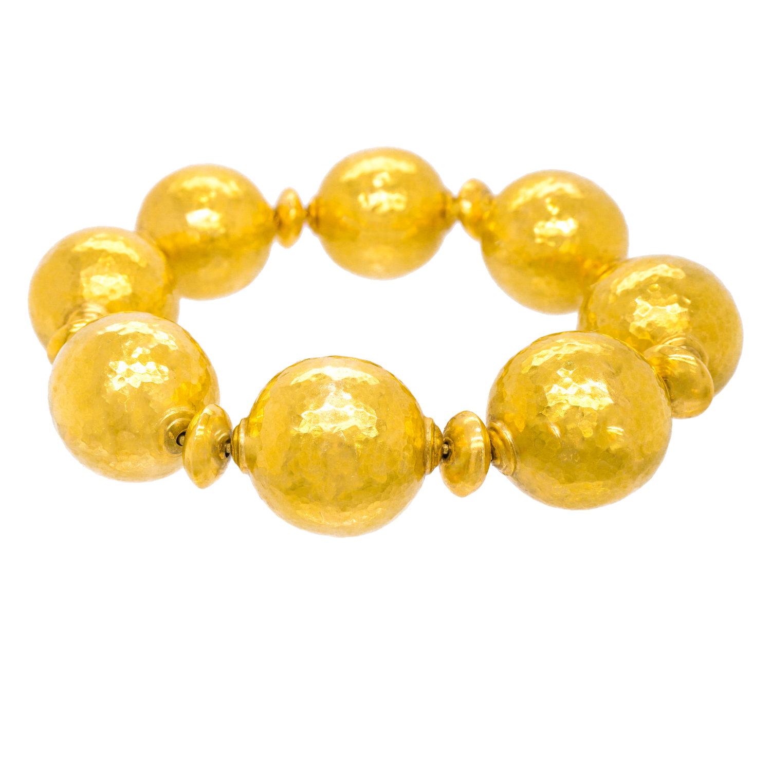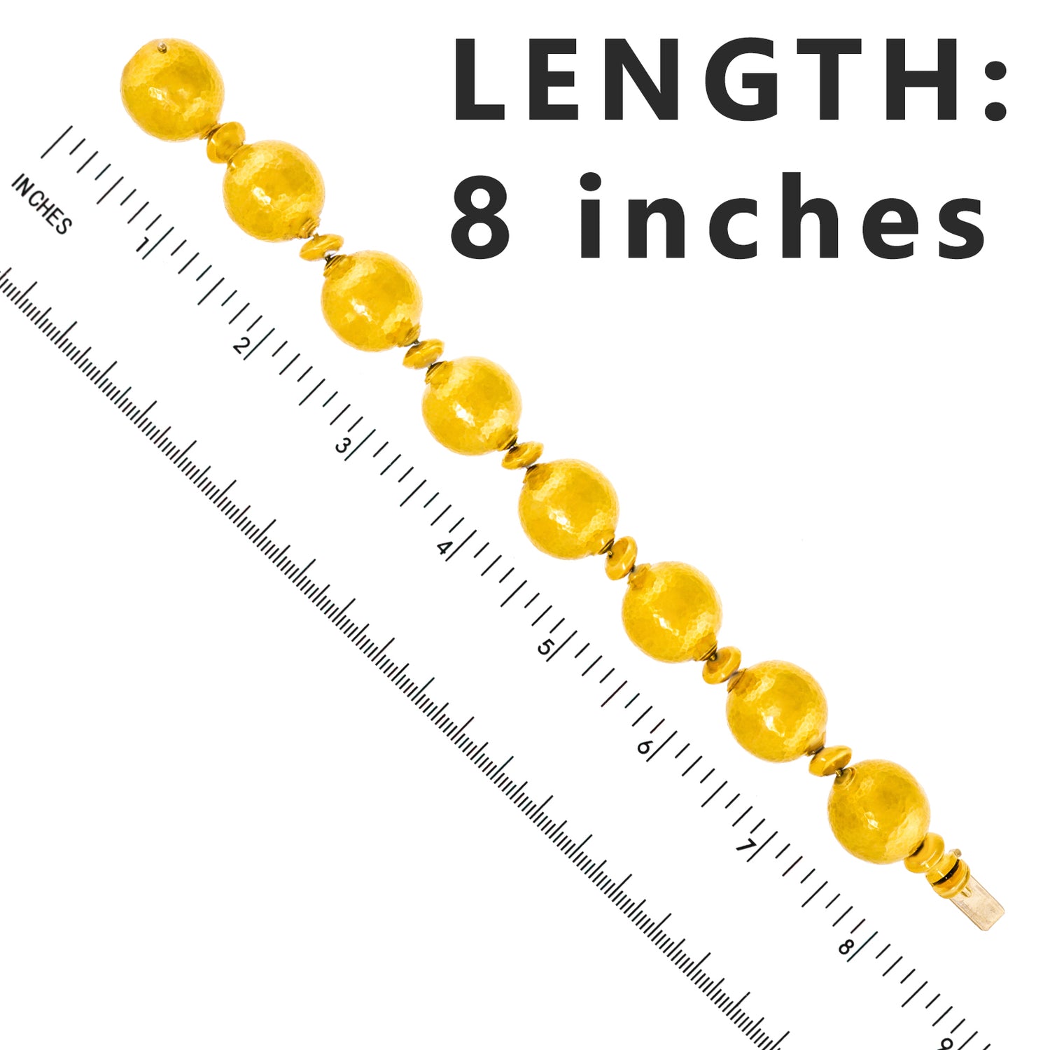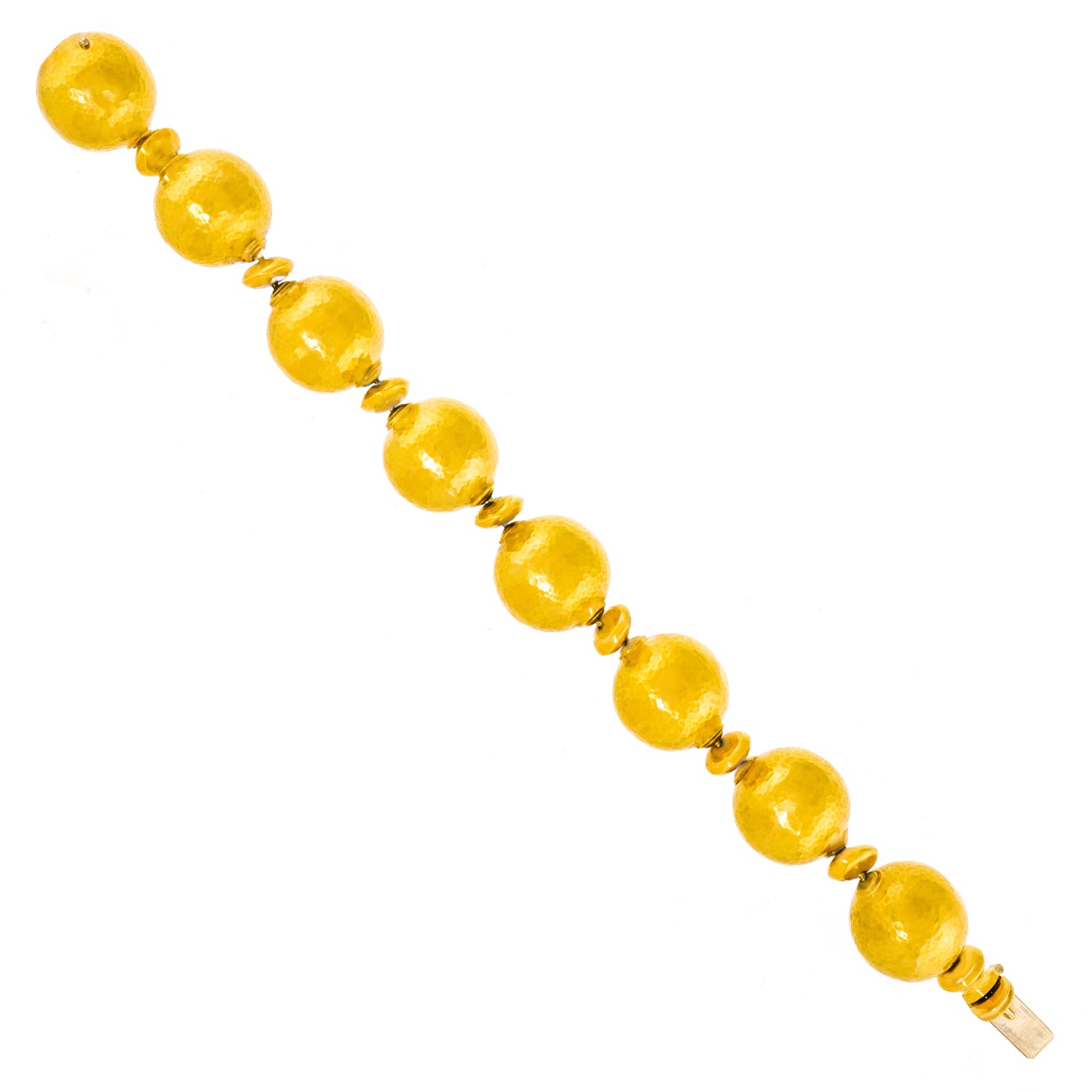 Circa 1960s, 18k, by Adler, Italy.  This 18k yellow gold bracelet is all about effortless chic. Delightfully casual or organo elegant, it features huge gold beads with a sophisticated hammered finish. Beautifully hand-fabricated, it is in excellent condition.