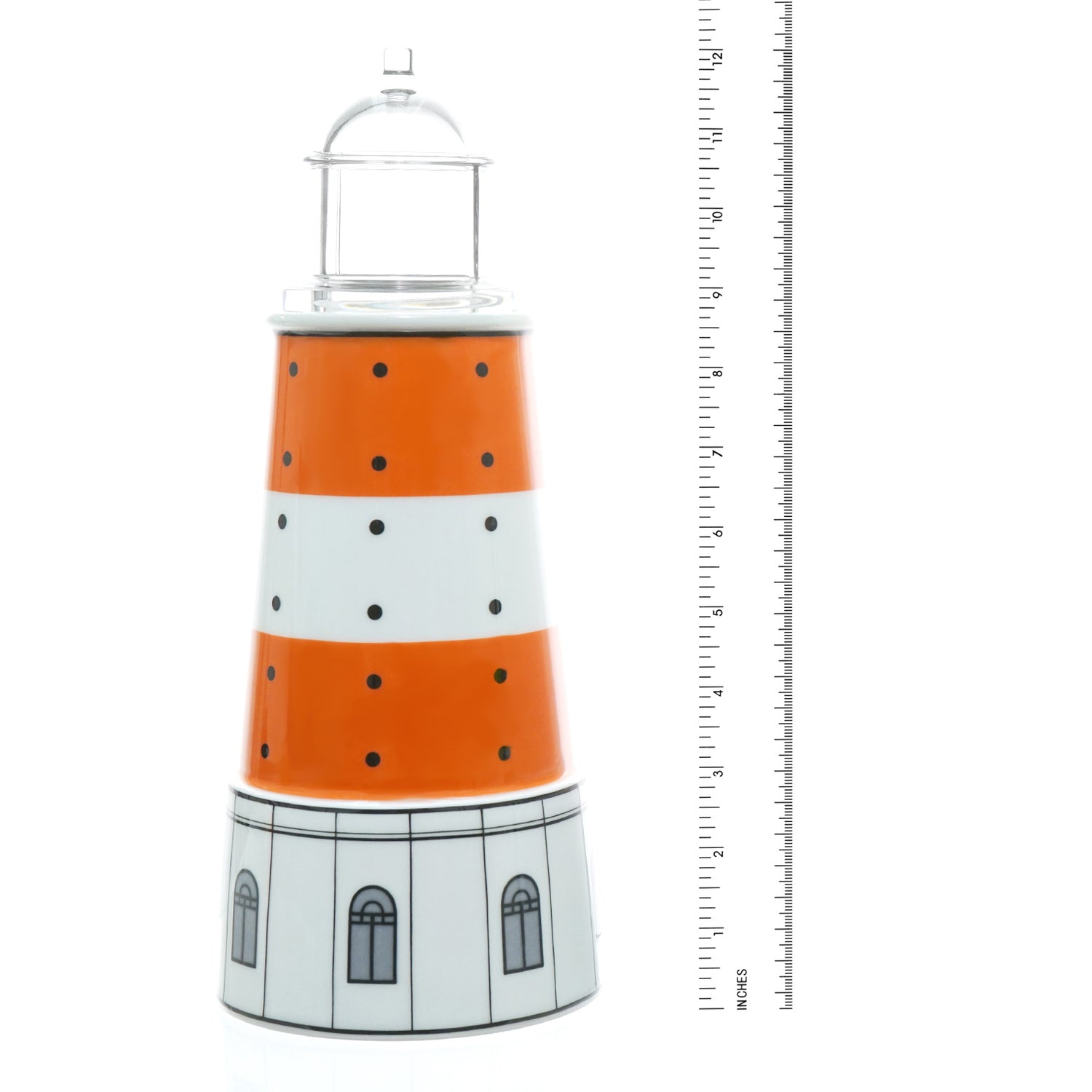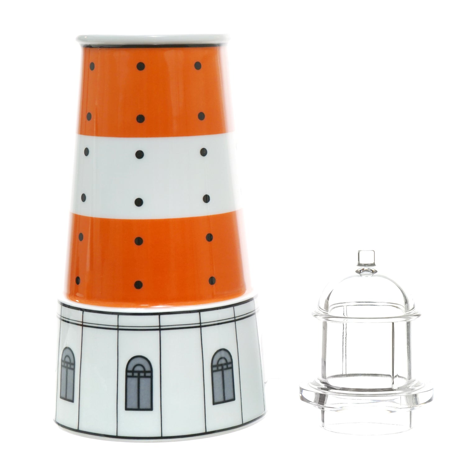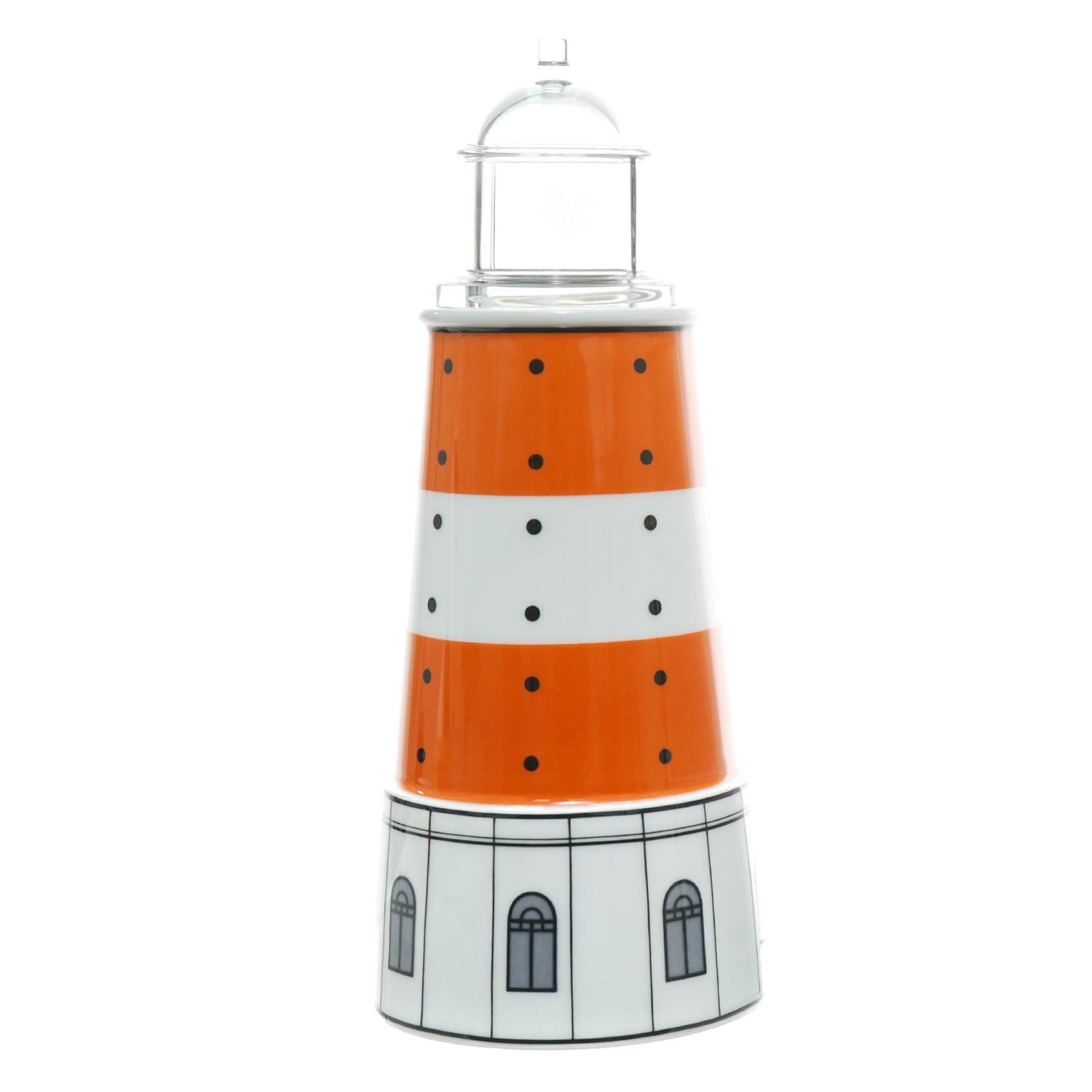Circa 1980s, Aldo Rossi for Rosenthal, Germany. This 12-inch high limited edition lighthouse is a brilliant example of Rosenthal's studio line. Created in the 1950s to showcase contemporary design, the studio line underscores Rosenthal's commitment to decorative accessories, as well as serve ware. Technically, this is a canister. However, it is clearly intended as an effortless splash of color for modern, contemporary, or beach decor. Excellent condition.