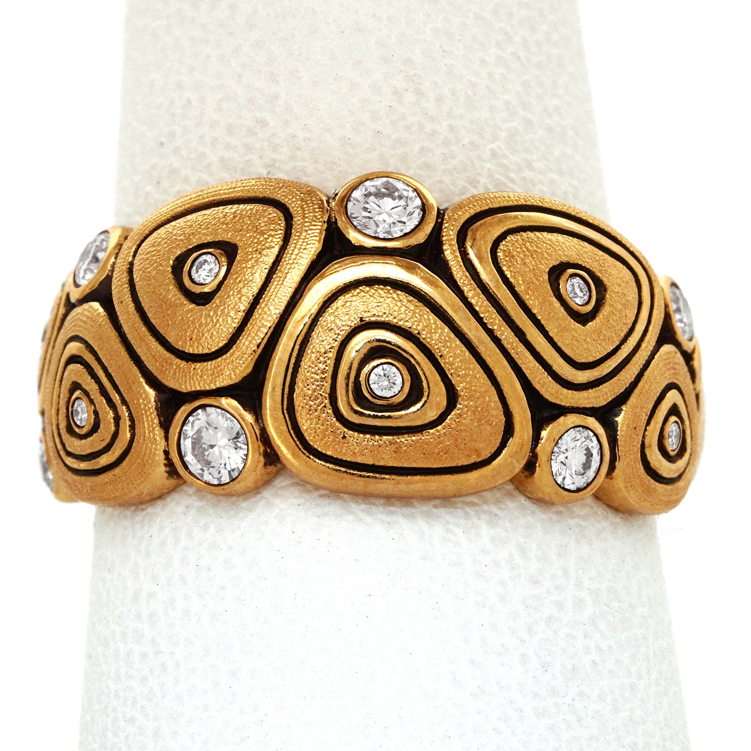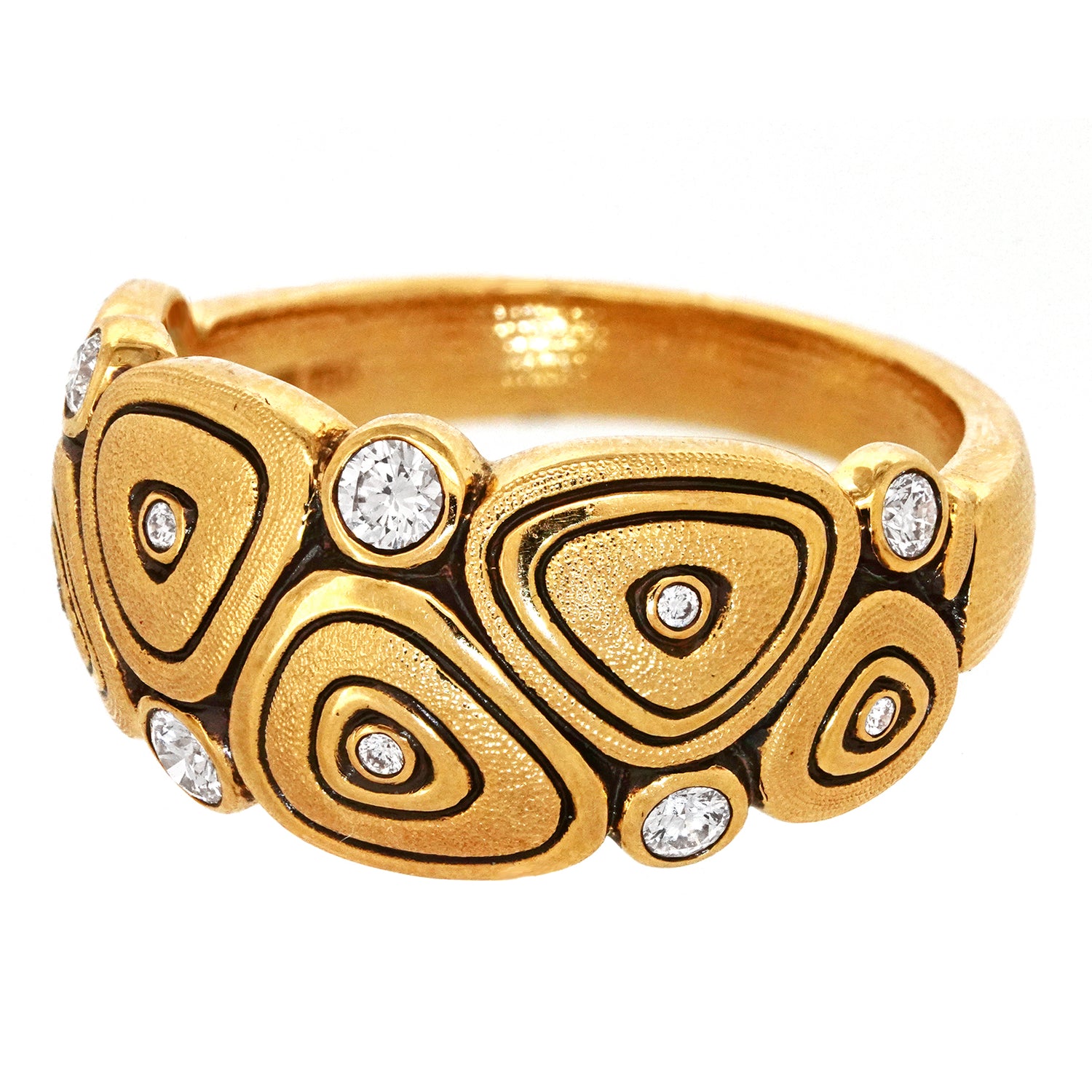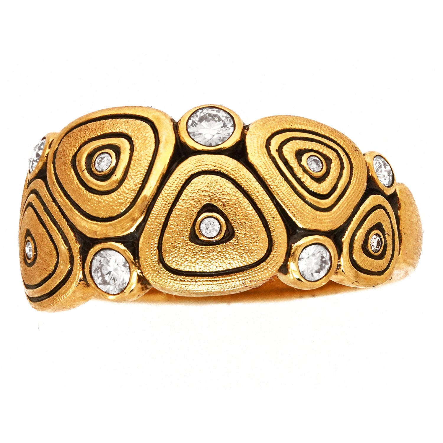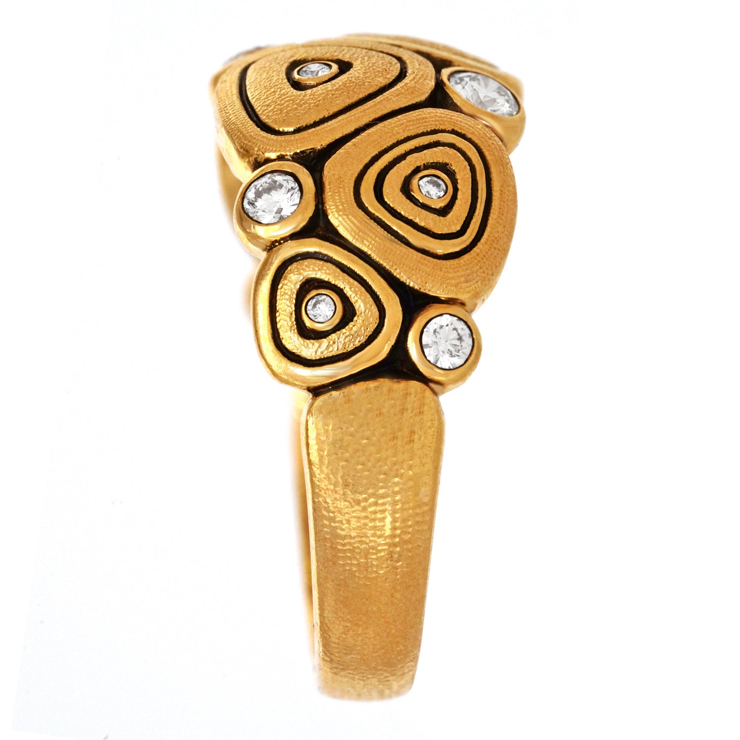 Circa 2000s, 18k, by Alex Sepkus, American. Alex Sepkus jewelry has a wonderful quality that takes rare and valuable and makes it part of our everyday story. This "Pebbles" ring is set with brilliant white diamonds in rich yellow eighteen-karat gold. Excellent condition.