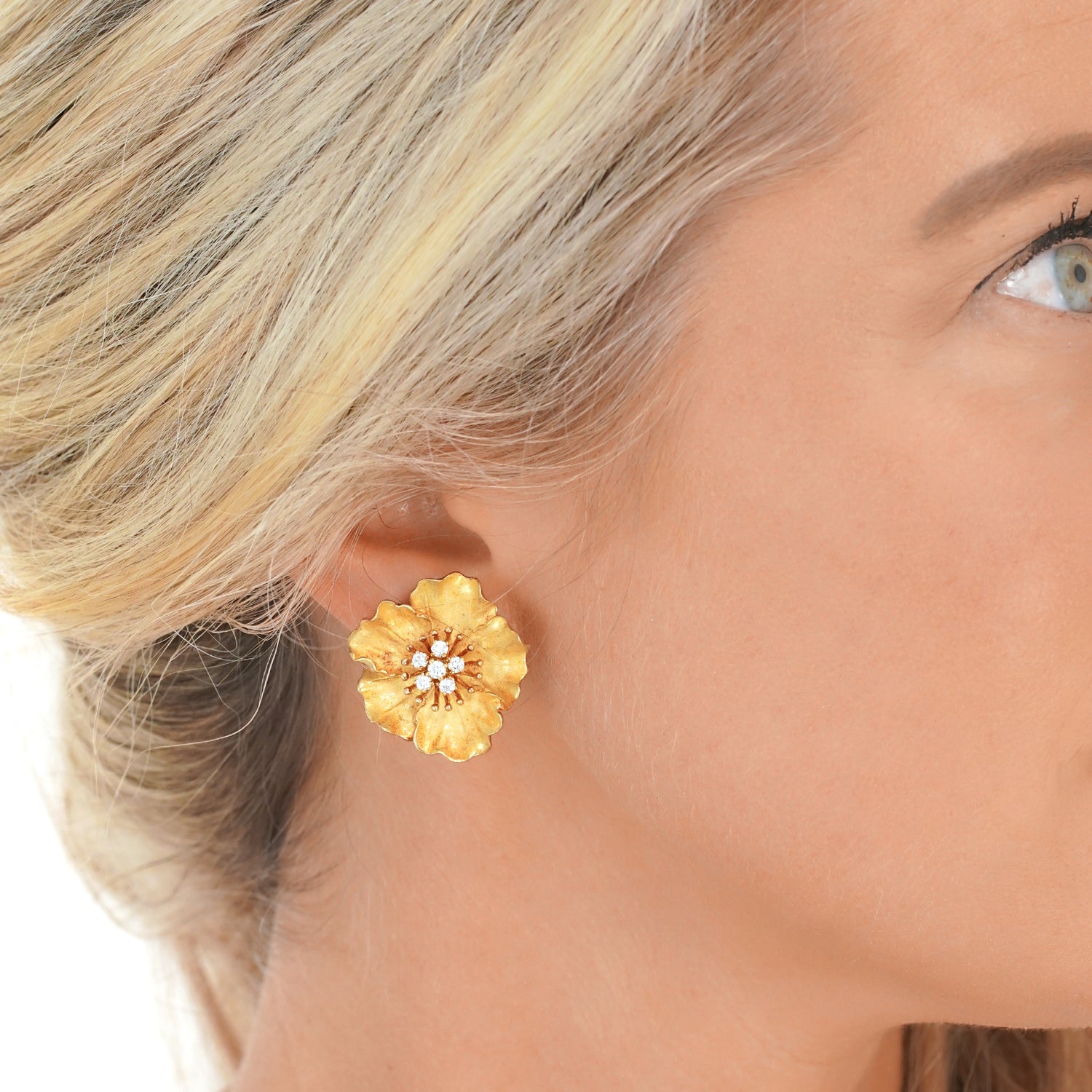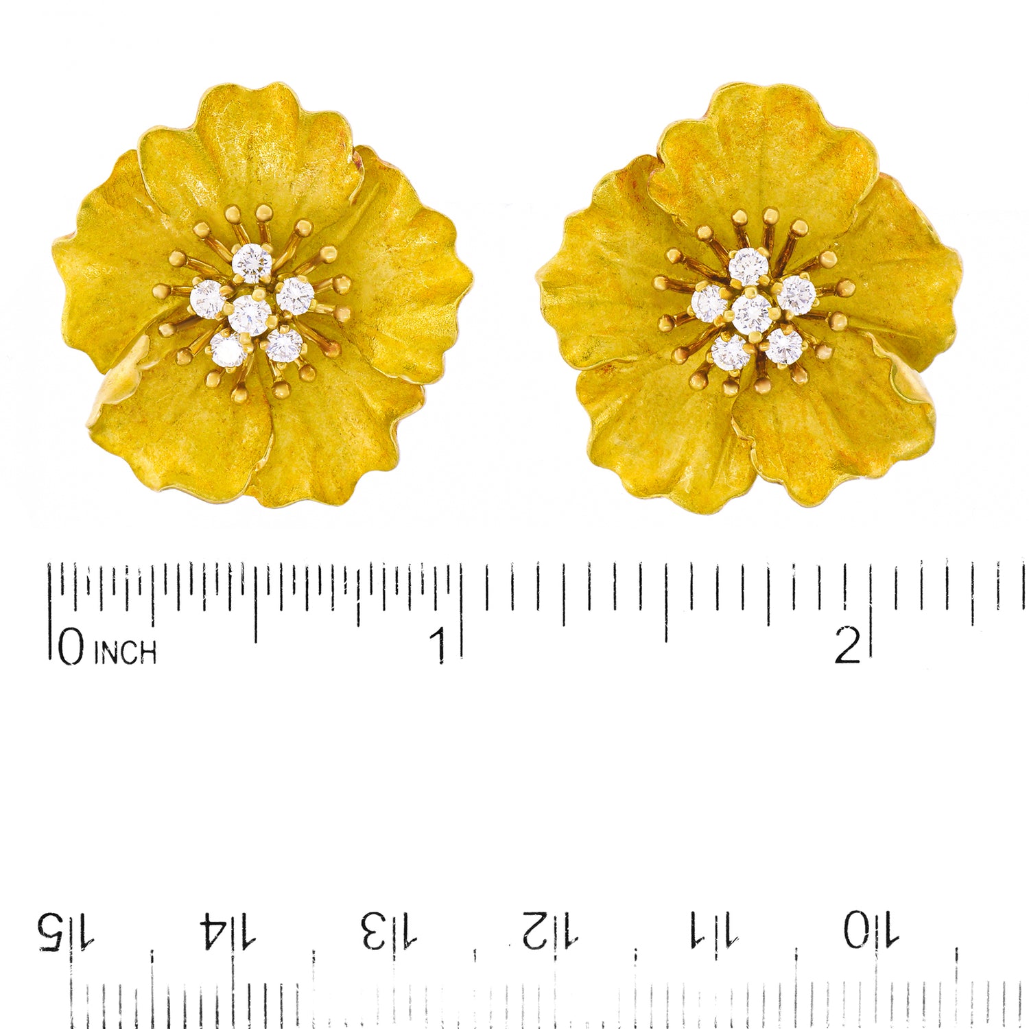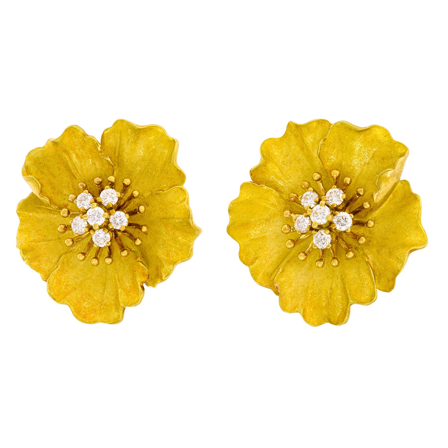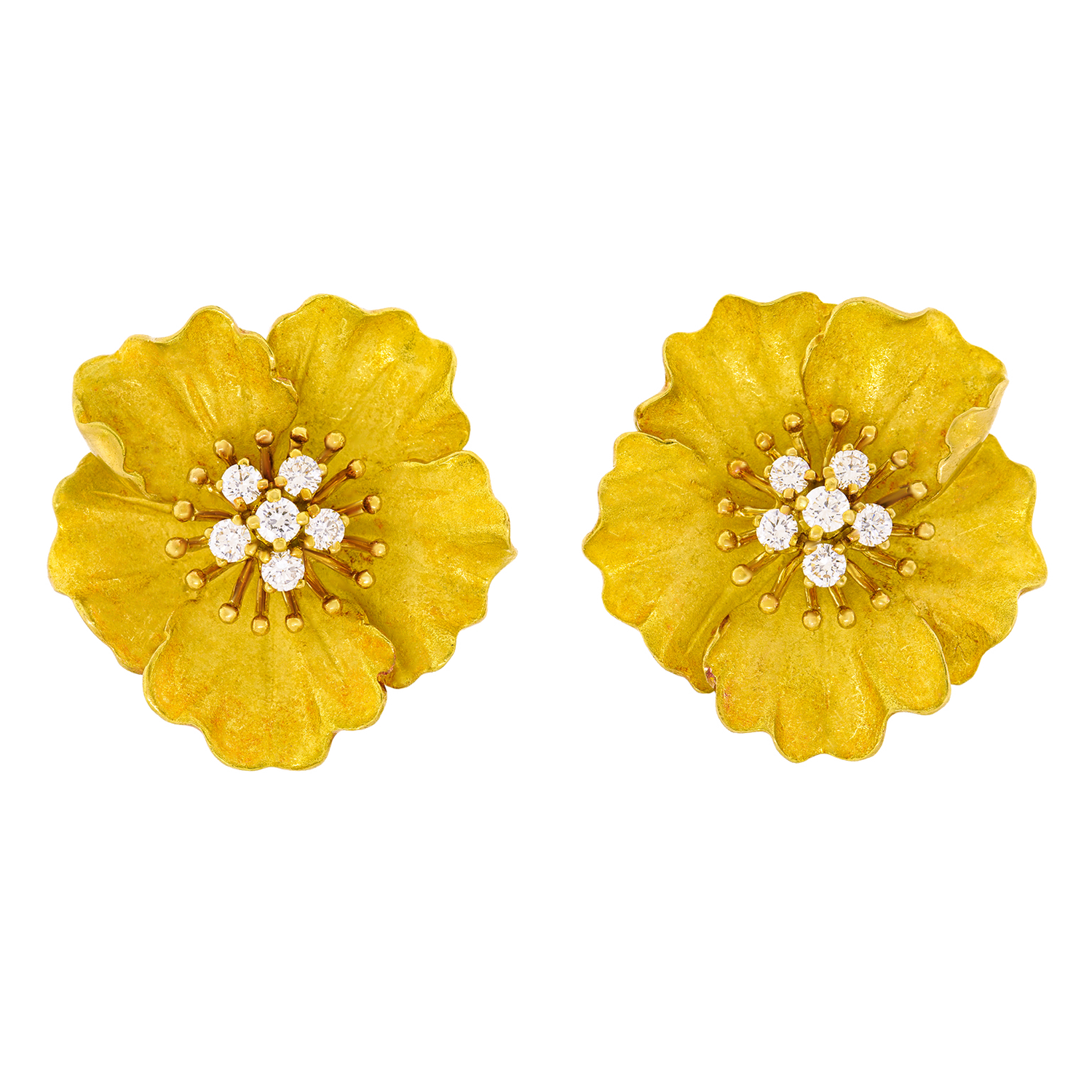 Circa 1990s, 18k, by Tiffany & Co., American. This cheerful pair of flower earrings from Tiffany's American Perennials collection effortlessly goes from the garden party to the cocktail party. The look is classic good taste, perfect in any moment of fashion. Naturalistic in design (alpine rose), the textured petals are accented by .65 carats of brilliant white diamonds (G color VS clarity). Beautifully made, they are in excellent condition. Noted; comes in the original Tiffany box.