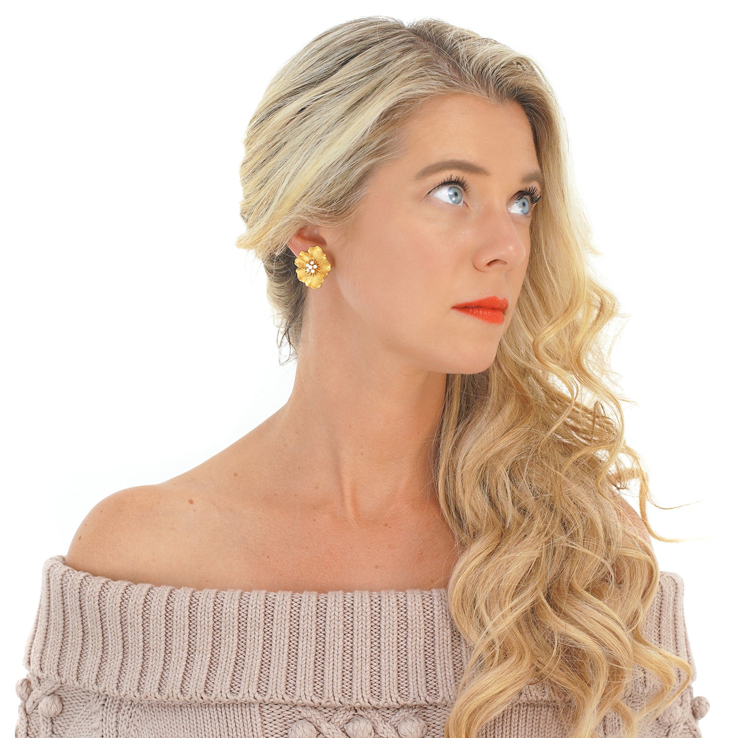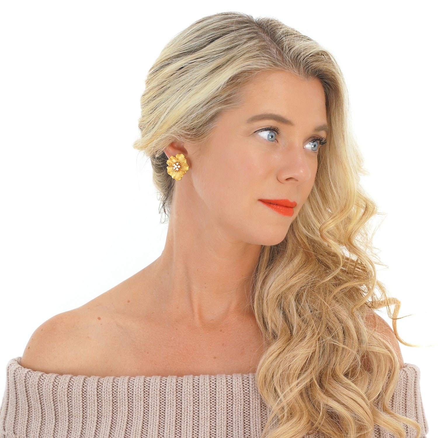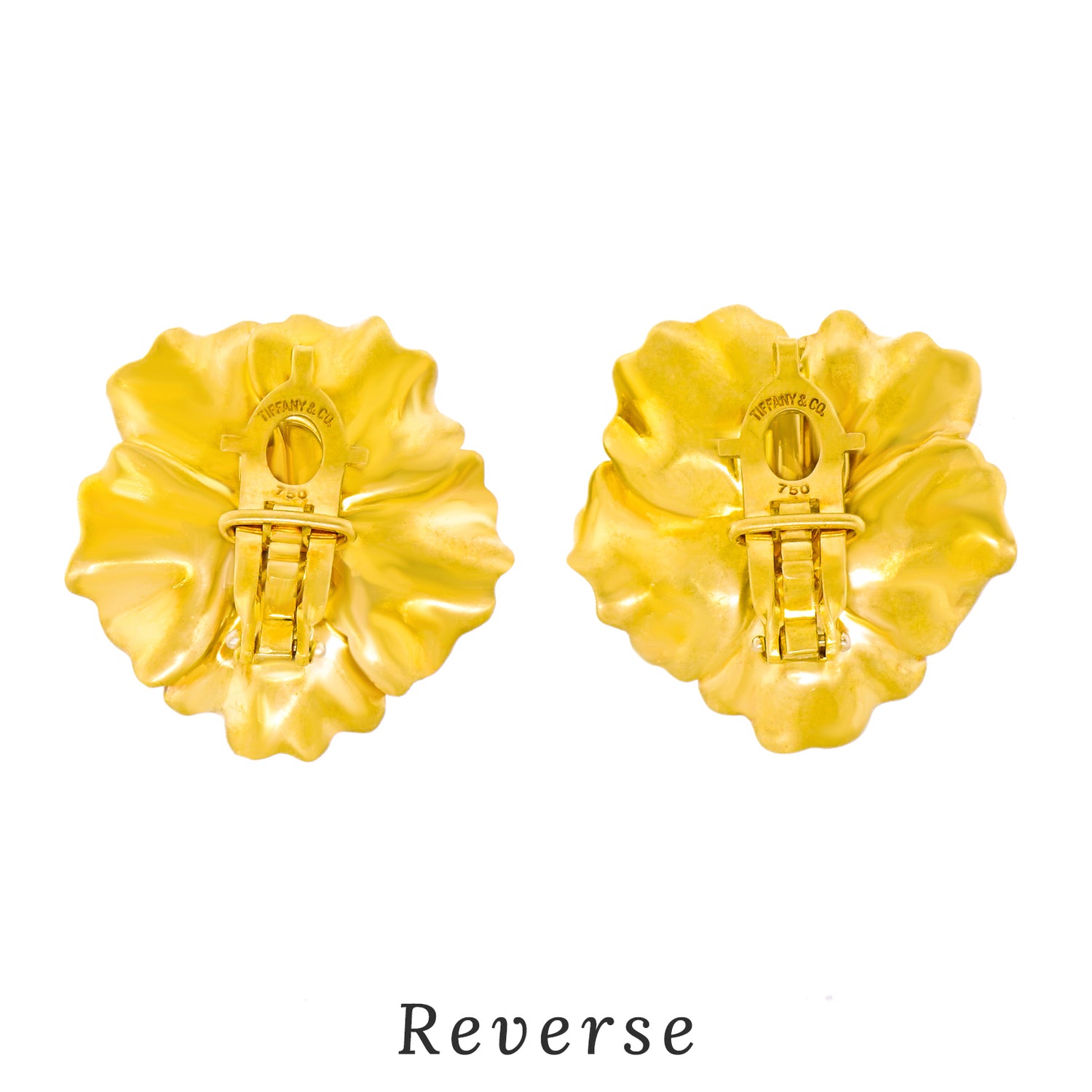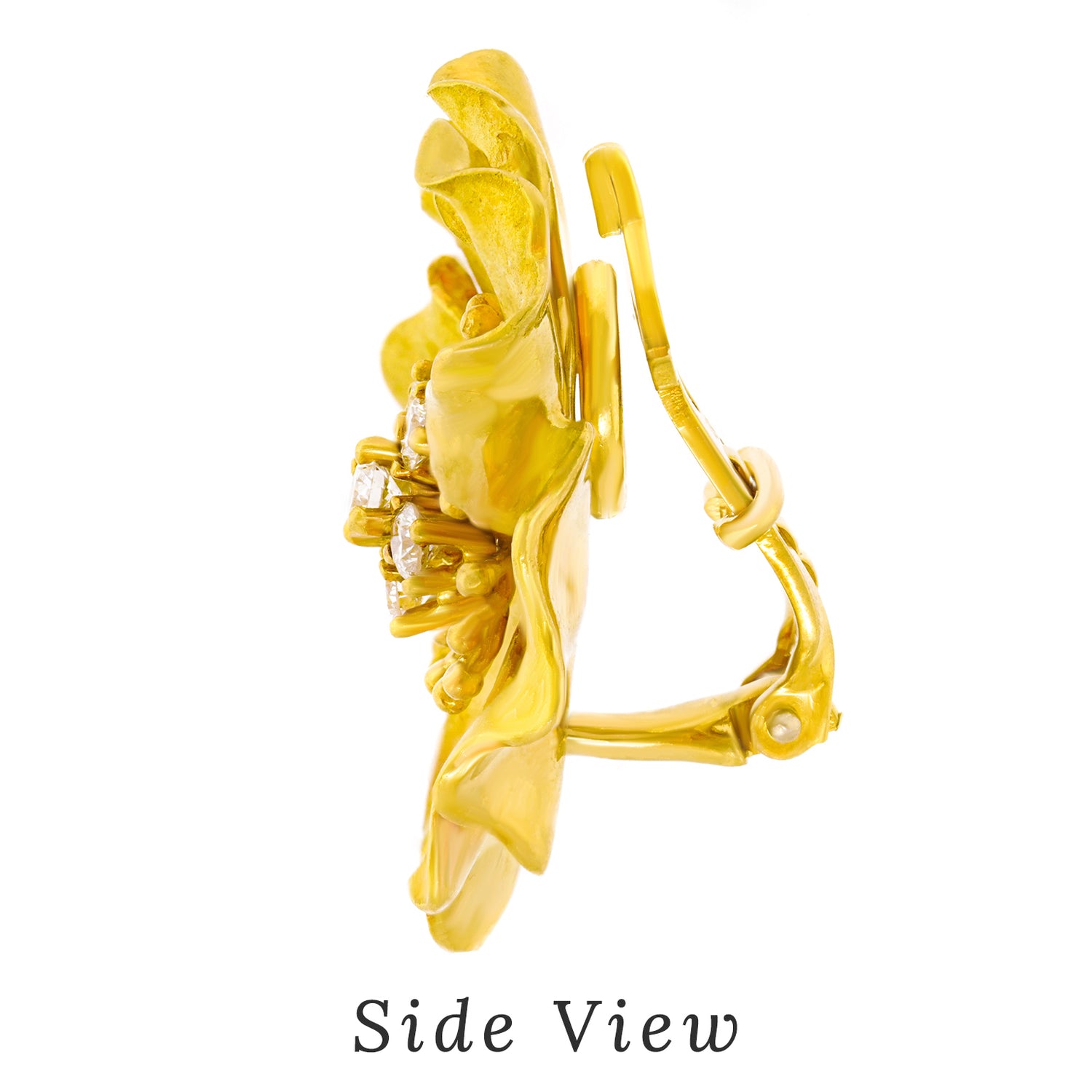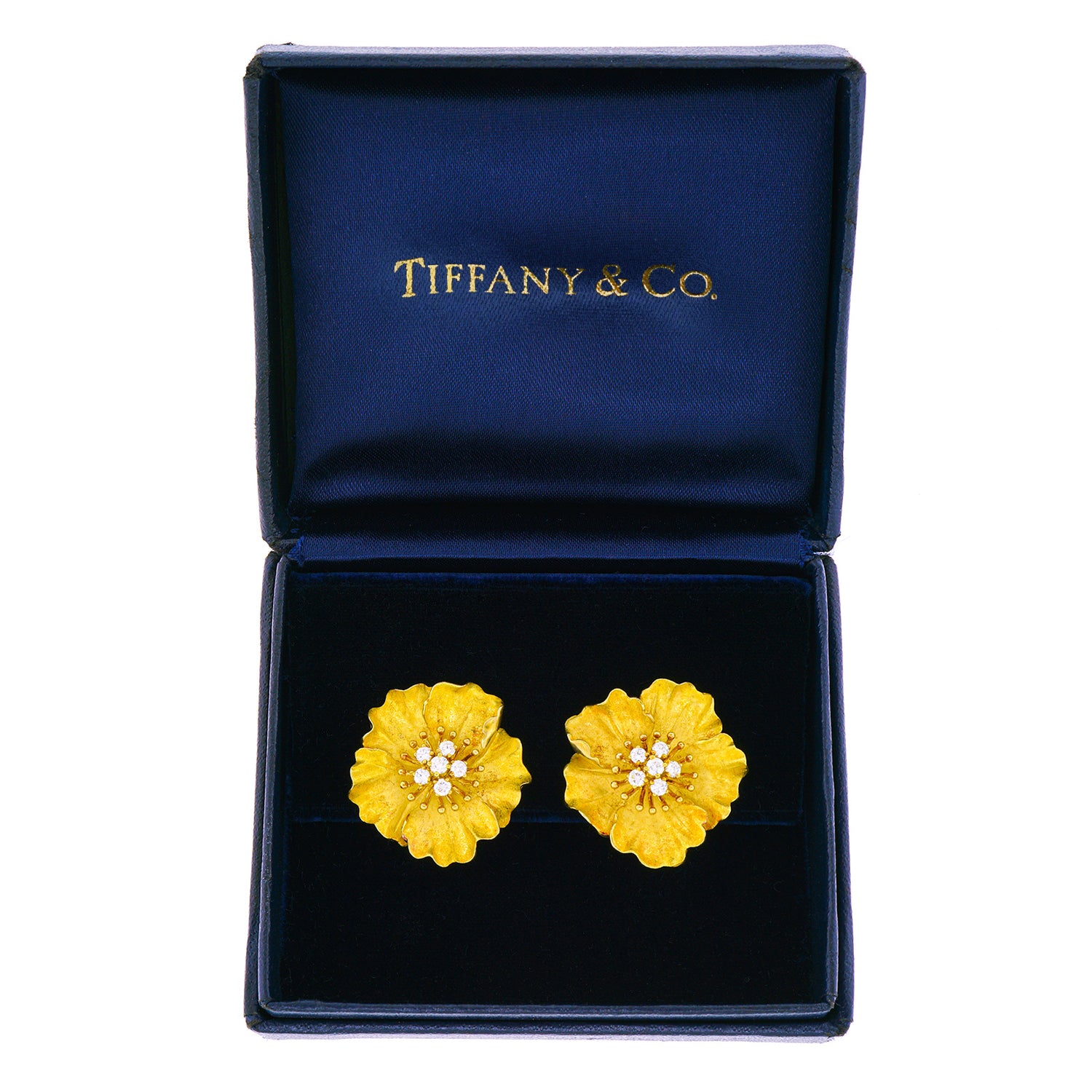 Circa 1990s, 18k, by Tiffany & Co., American. This cheerful pair of flower earrings from Tiffany's American Perennials collection effortlessly goes from the garden party to the cocktail party. The look is classic good taste, perfect in any moment of fashion. Naturalistic in design (alpine rose), the textured petals are accented by .65 carats of brilliant white diamonds (G color VS clarity). Beautifully made, they are in excellent condition. Noted; comes in the original Tiffany box.