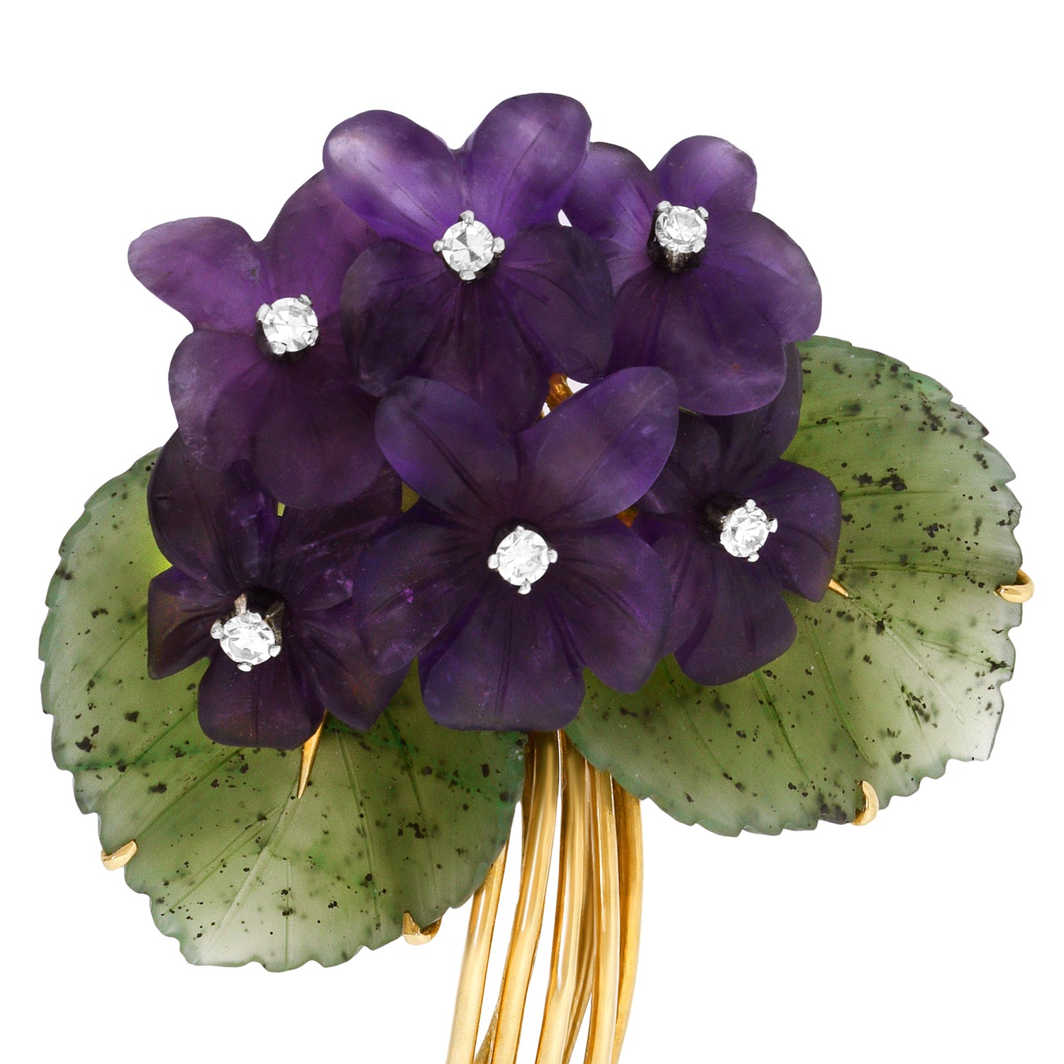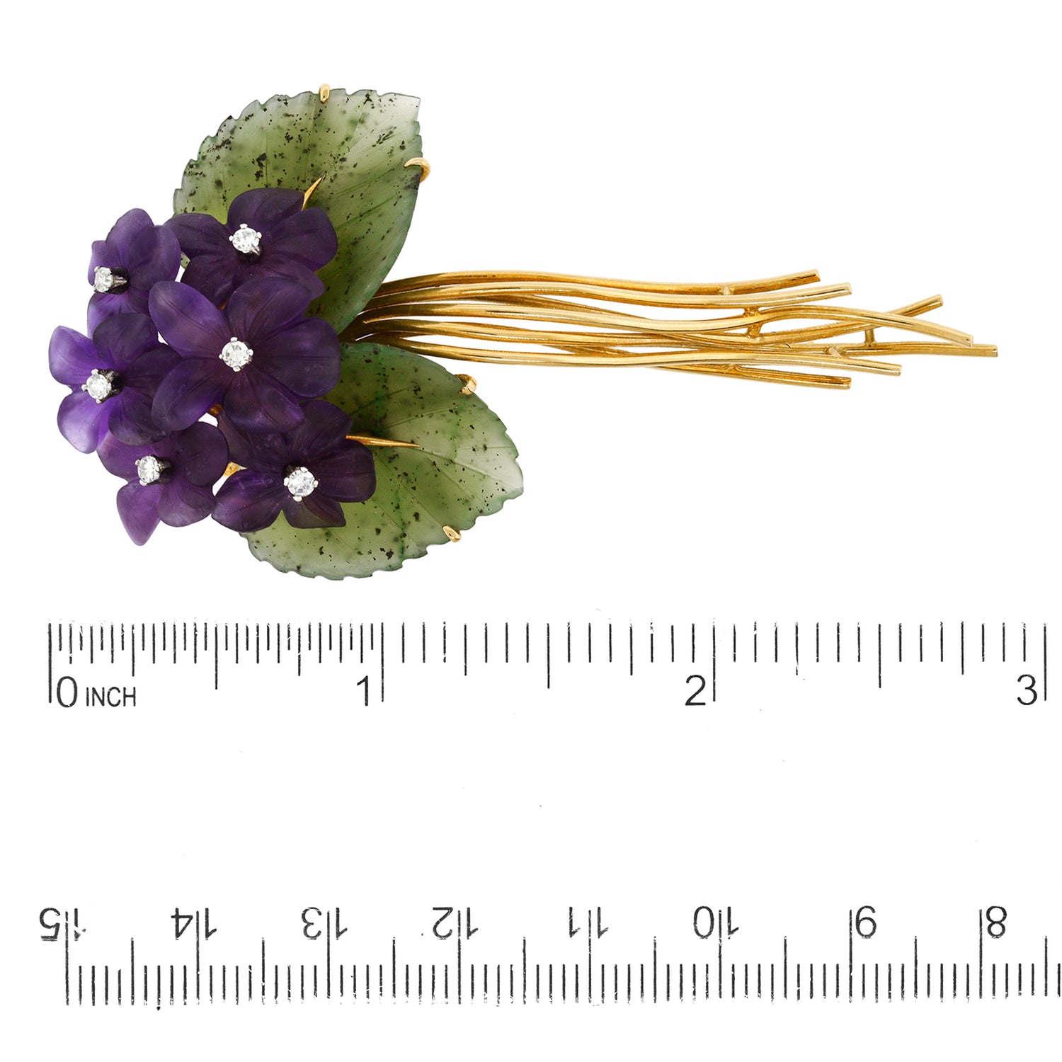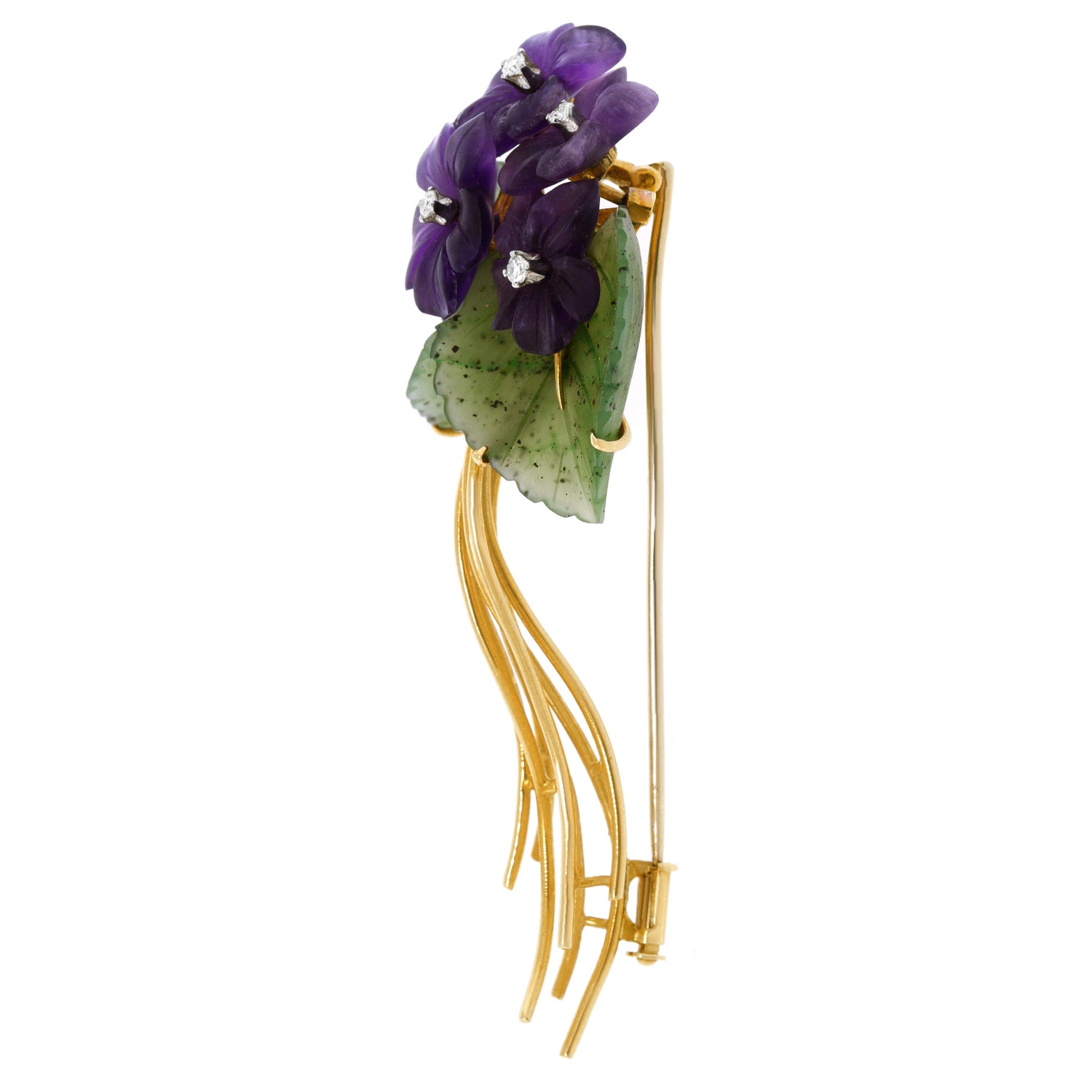 Circa 1920s, 18k, Swiss. Spring has sprung for this lovely brooch! Vivid amethyst flowers cheerily open in full bloom, each enhanced by a brilliant diamond. The lush jade leaves and gold stem complete the floral narrative. Fine-quality carving and meticulous construction are found throughout. Excellent condition.