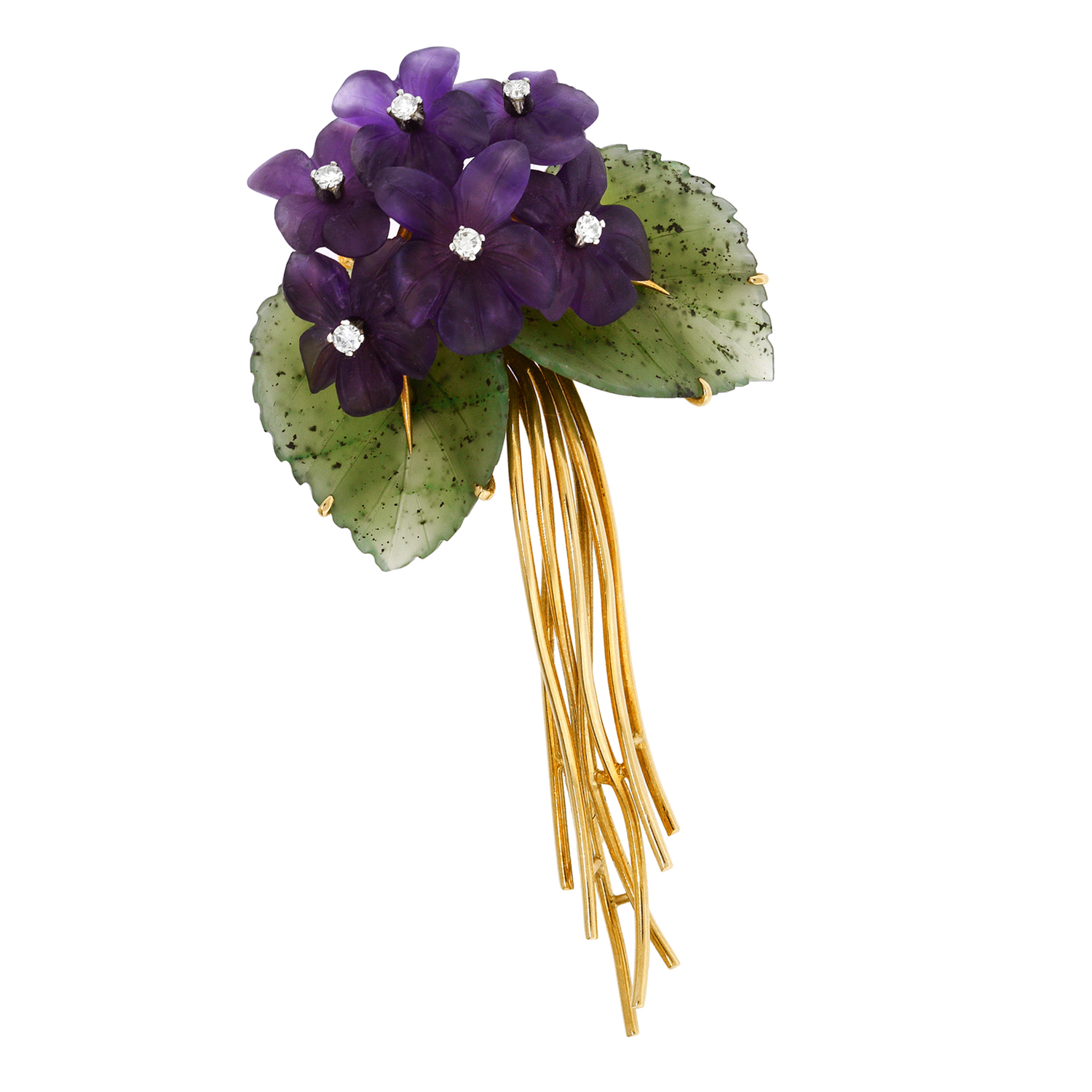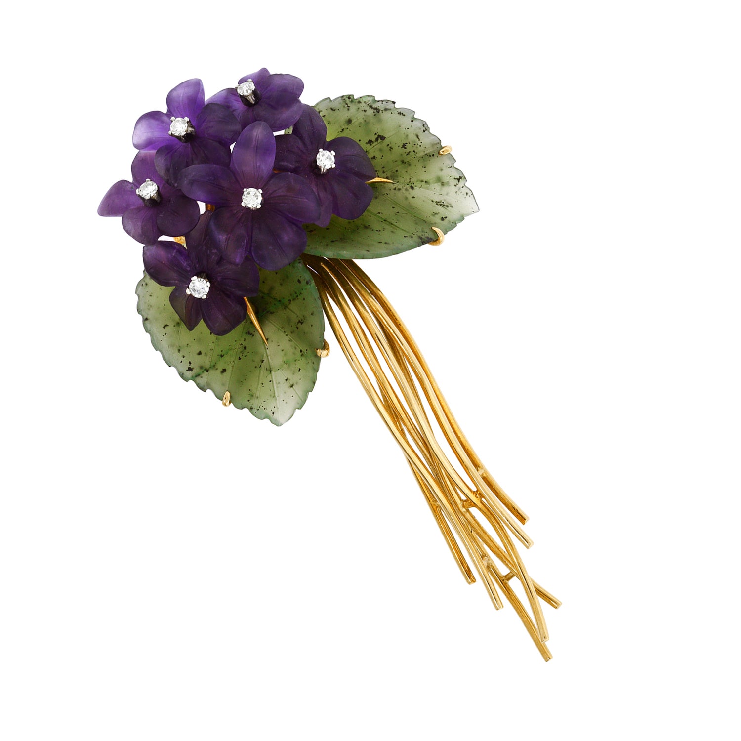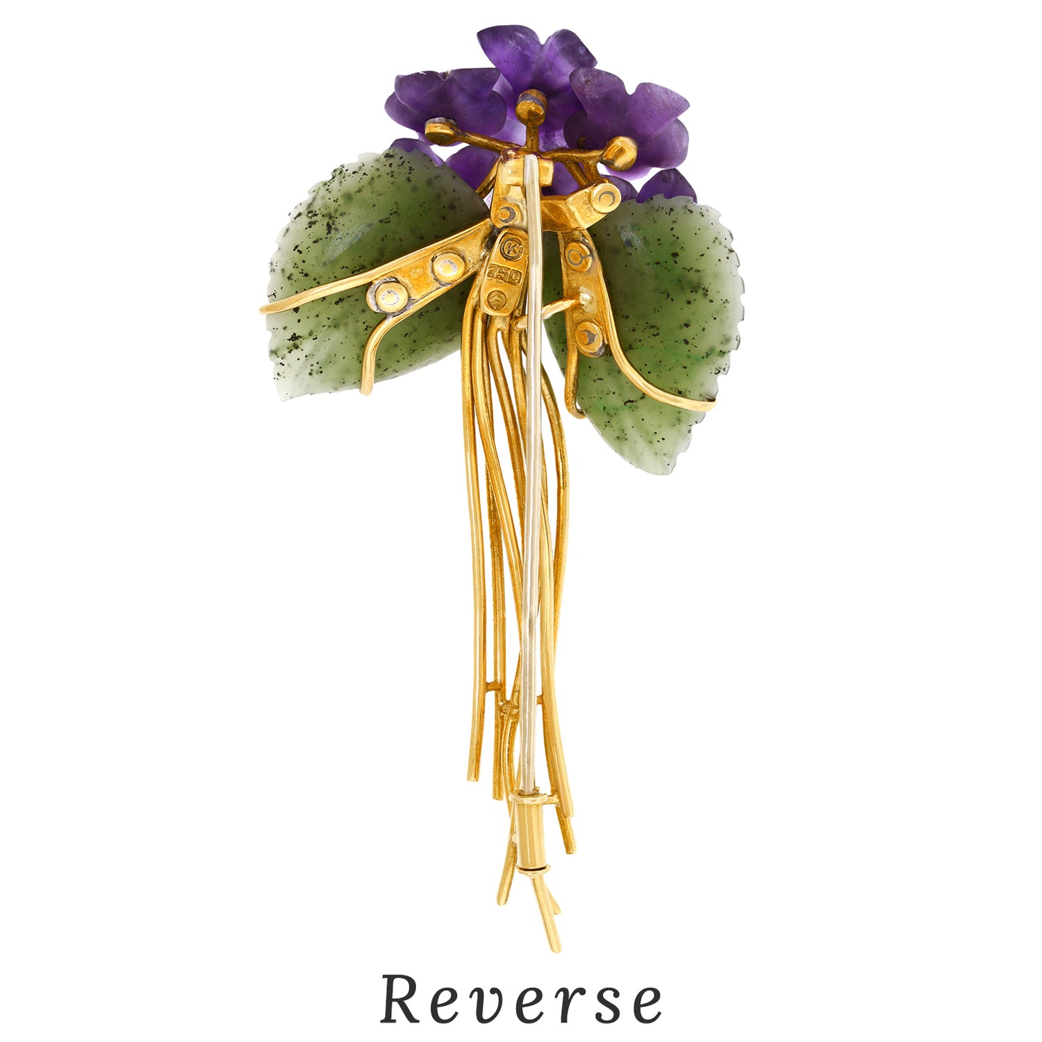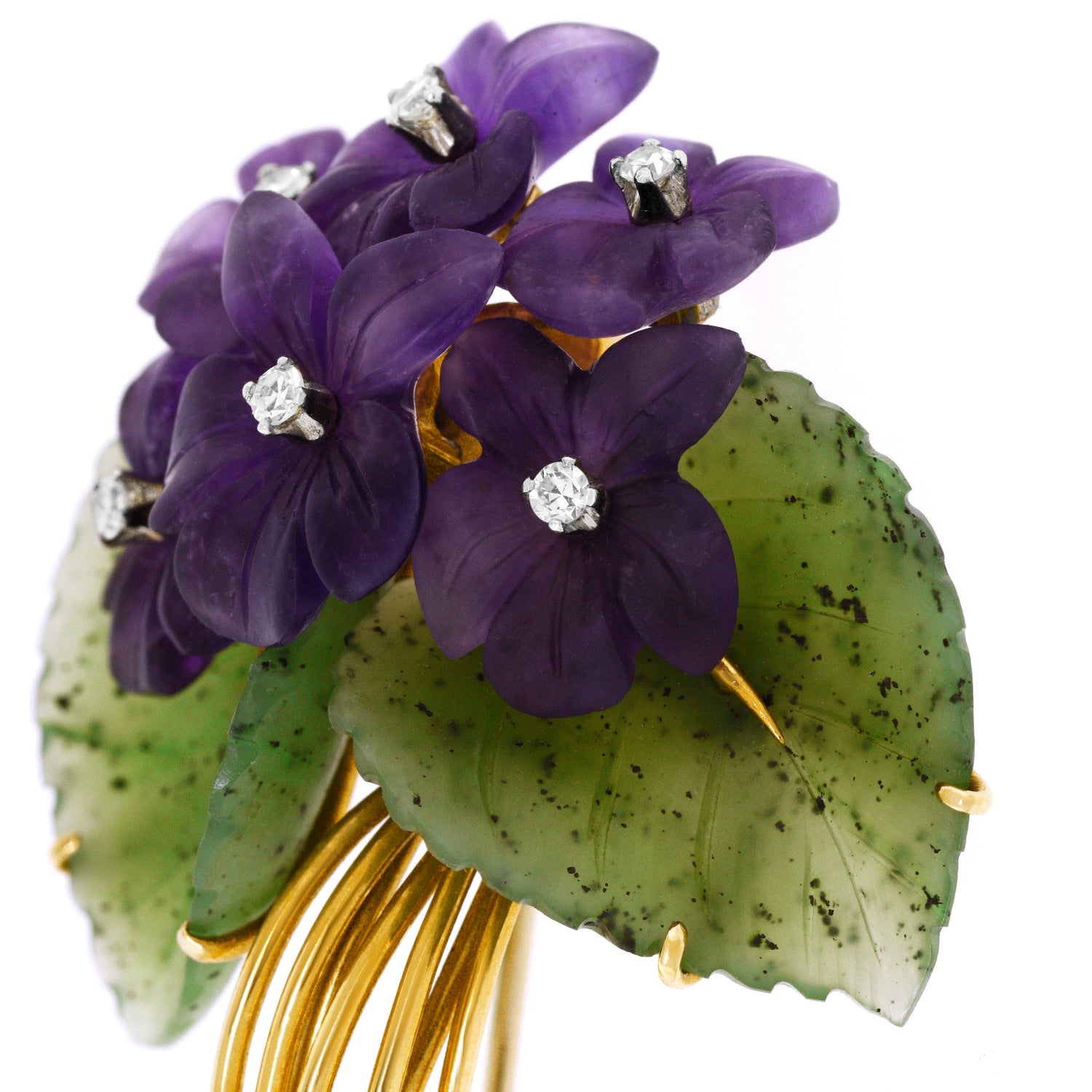 Circa 1920s, 18k, Swiss. Spring has sprung for this lovely brooch! Vivid amethyst flowers cheerily open in full bloom, each enhanced by a brilliant diamond. The lush jade leaves and gold stem complete the floral narrative. Fine-quality carving and meticulous construction are found throughout. Excellent condition.