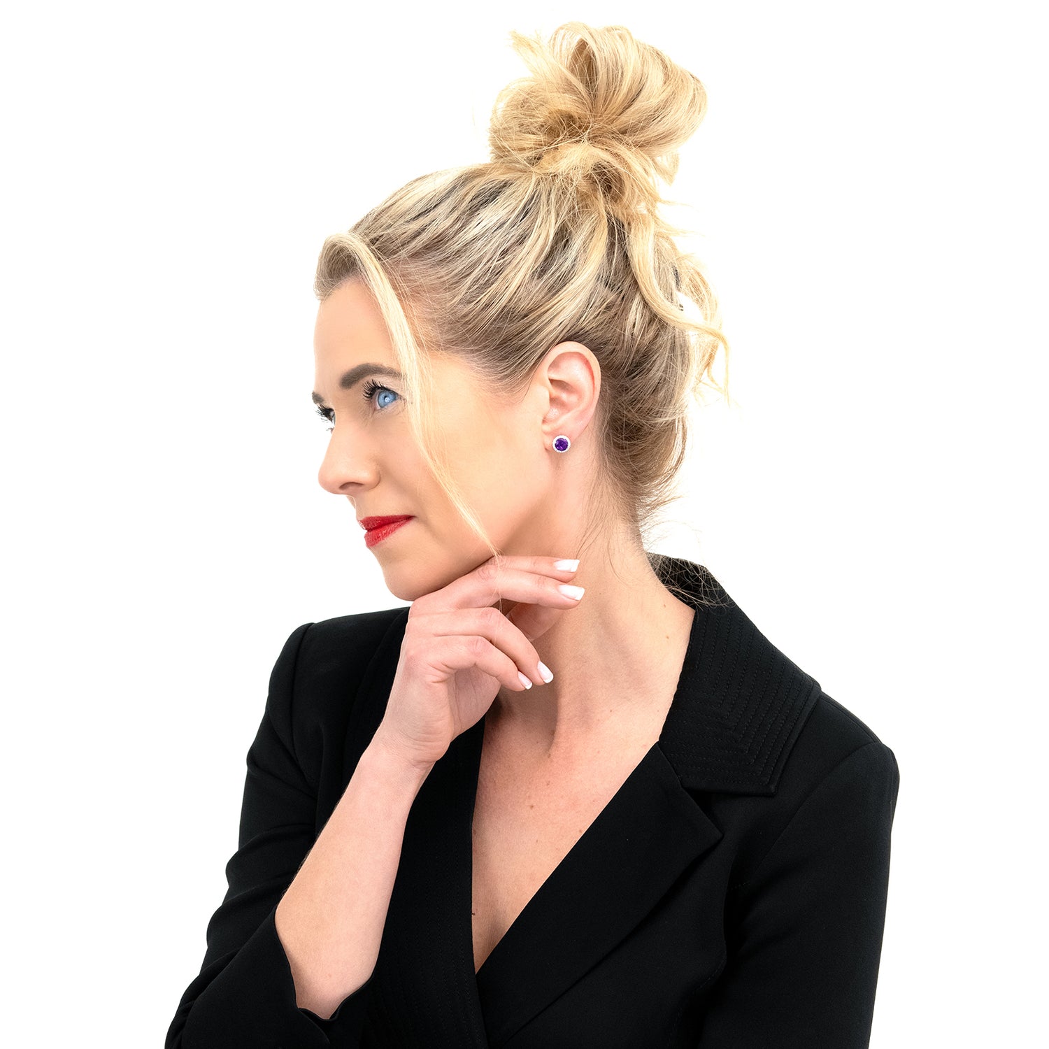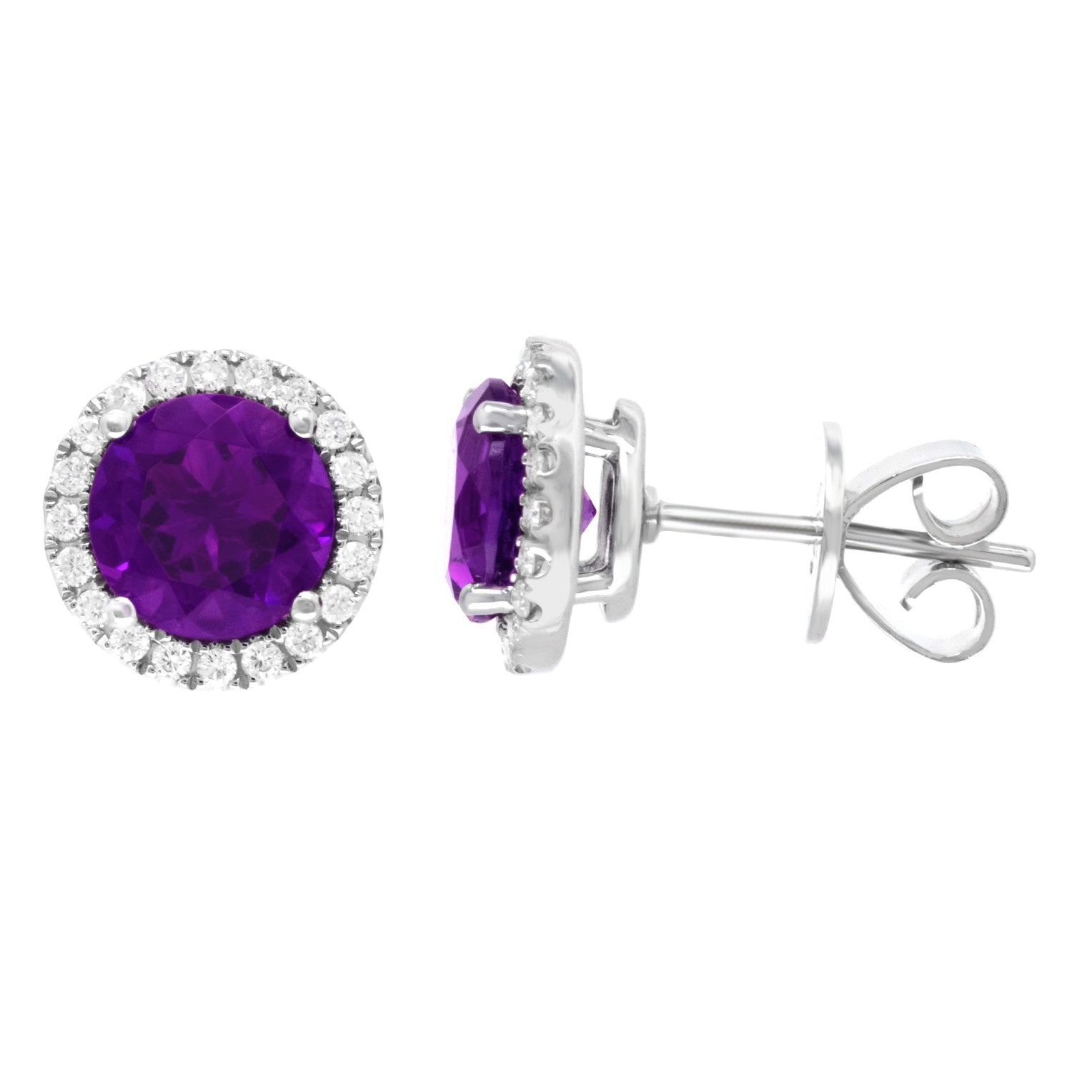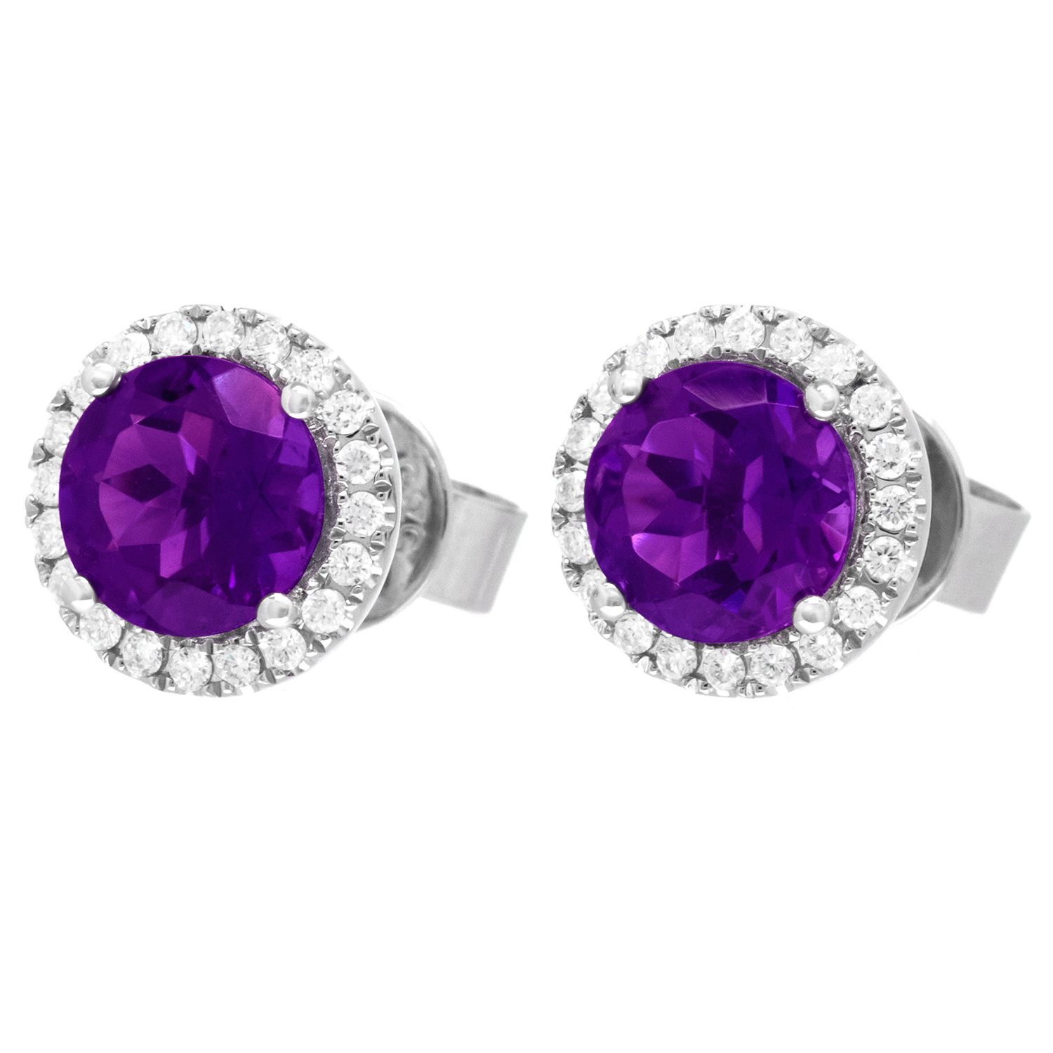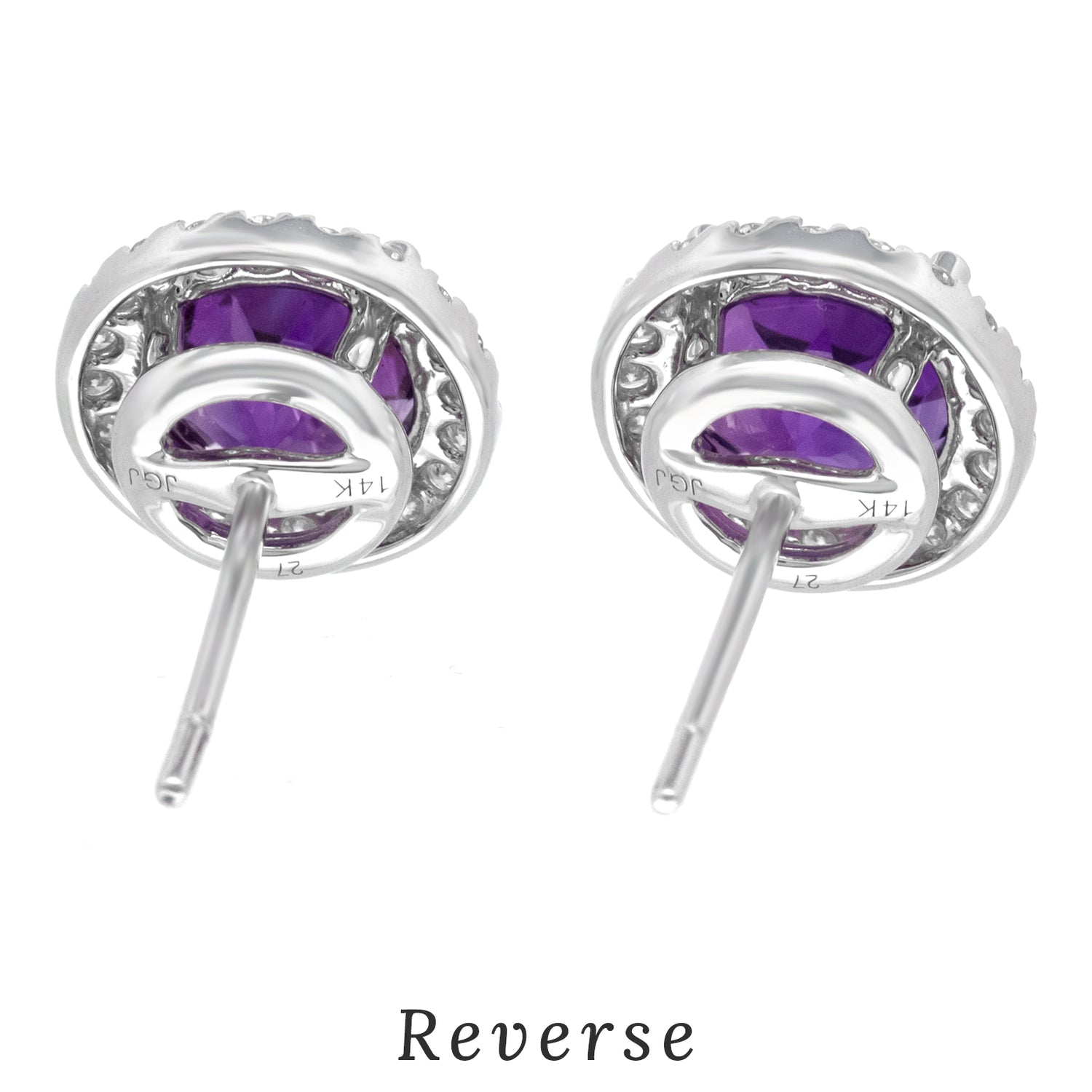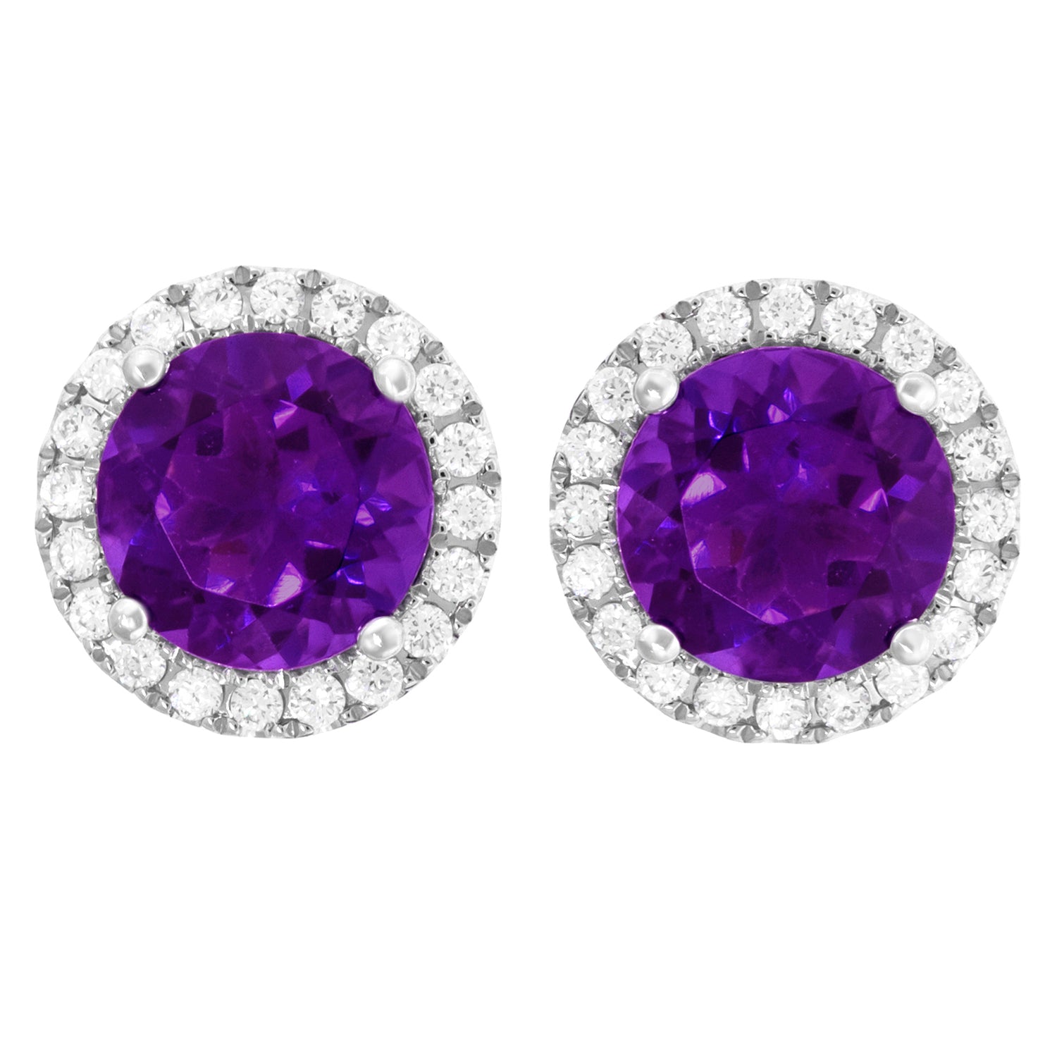 Circa 2000s, 14k, American. These vivid purple amethyst earrings are fabulous! Gorgeous color surrounded by brilliant white diamonds (.25cttw H color VS clarity) makes this classic style perfectly modern. Finely fabricated in 14k white gold, featuring 2.50 carats of amethyst, they are in excellent condition.