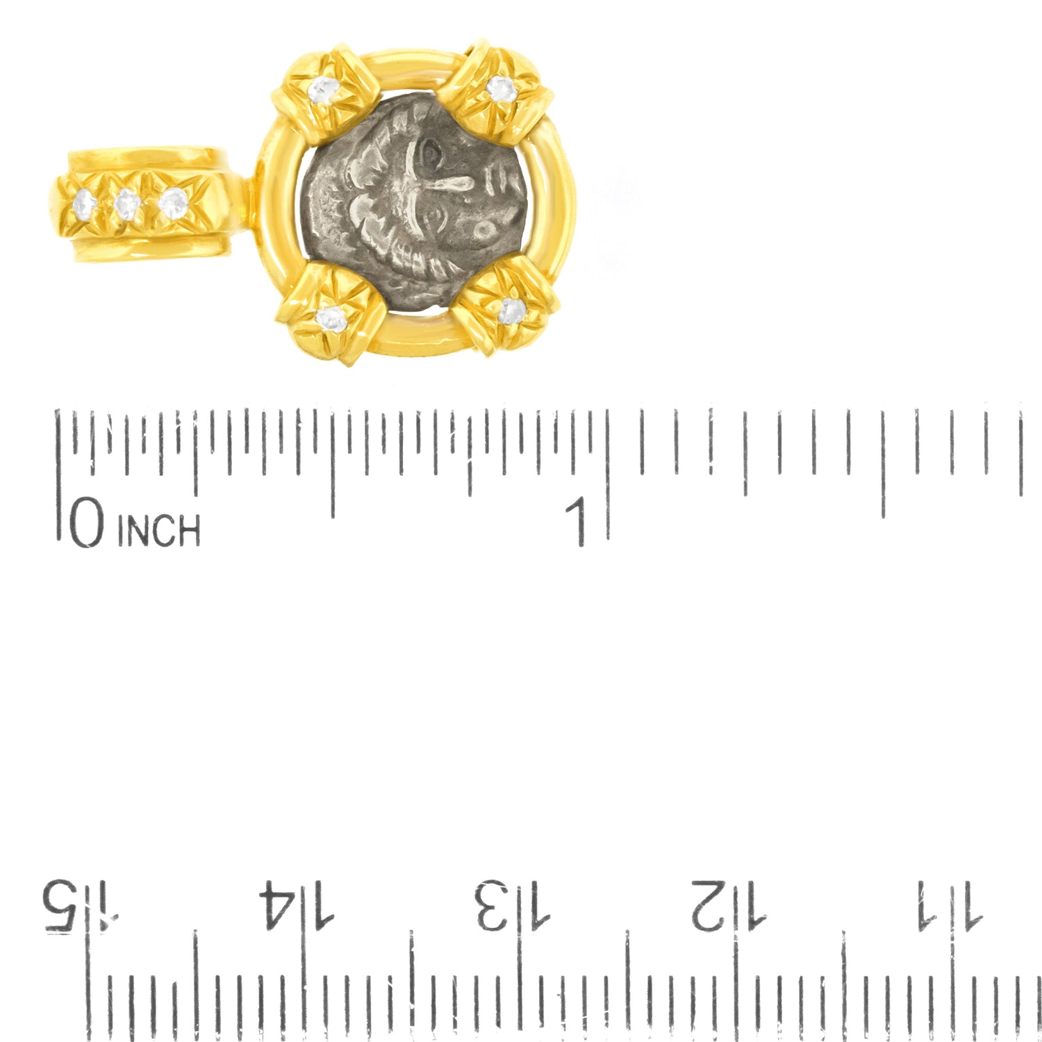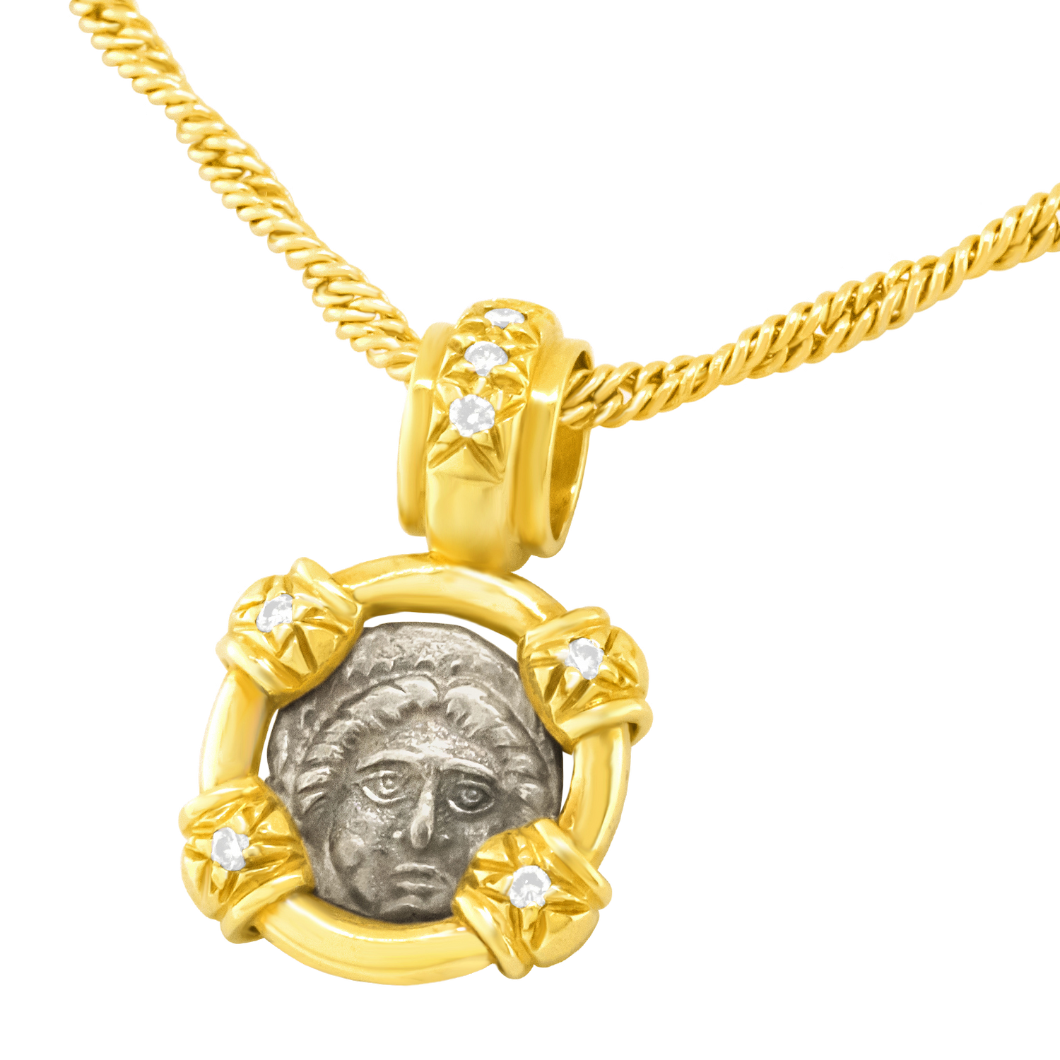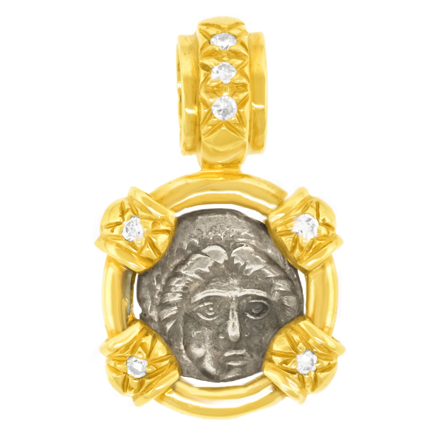 Circa 1980s, 18k, American. The heavy diamond-set gold frame is the perfect foil for this delightfully diminutive silver coin from the ancient kingdoms of Greece. A perfect everyday, everywhere pendant, this piece adds a stylish vintage look to any ensemble. I'm crazy about this pendant worn as the top necklace in a multiples moment of fashion. Overbuilt and set with brilliant white diamonds this jewel is in excellent condition.