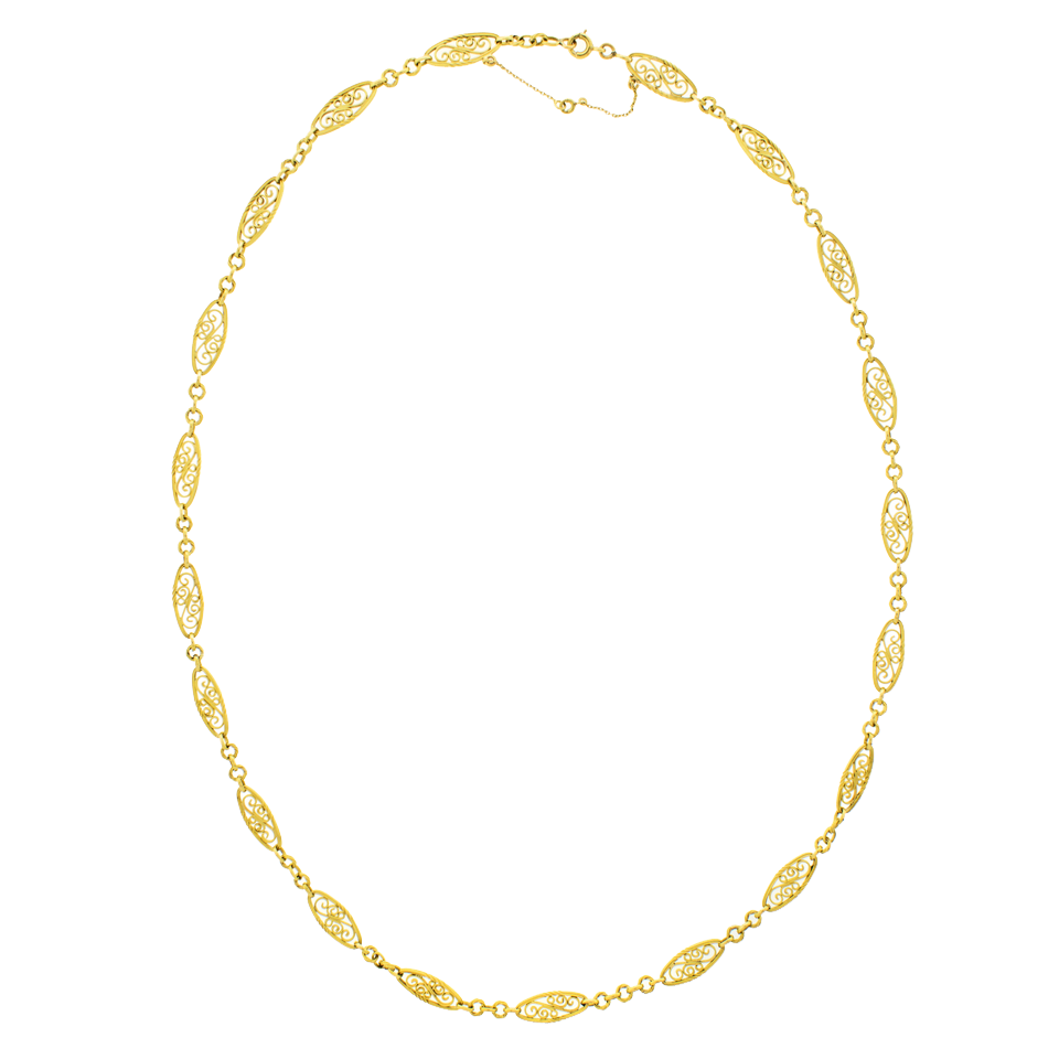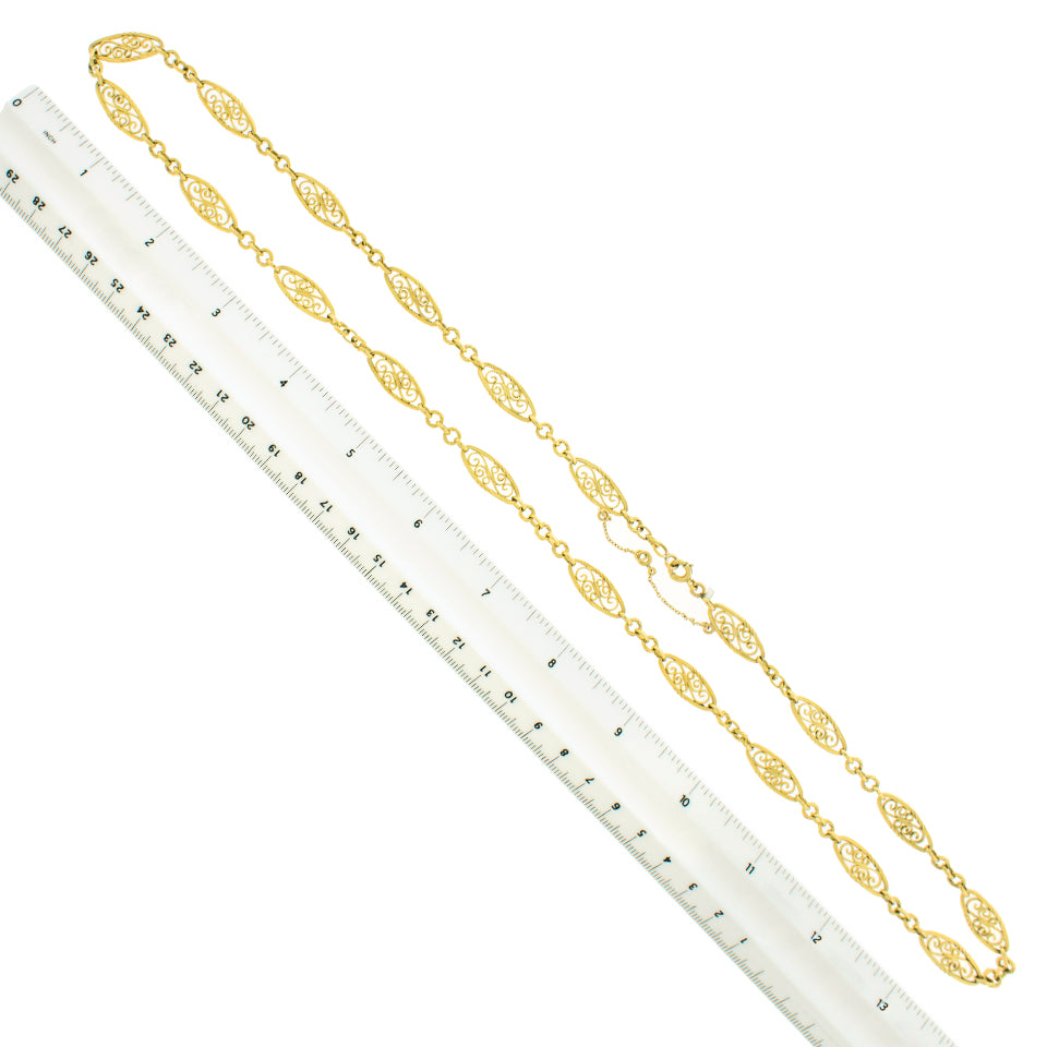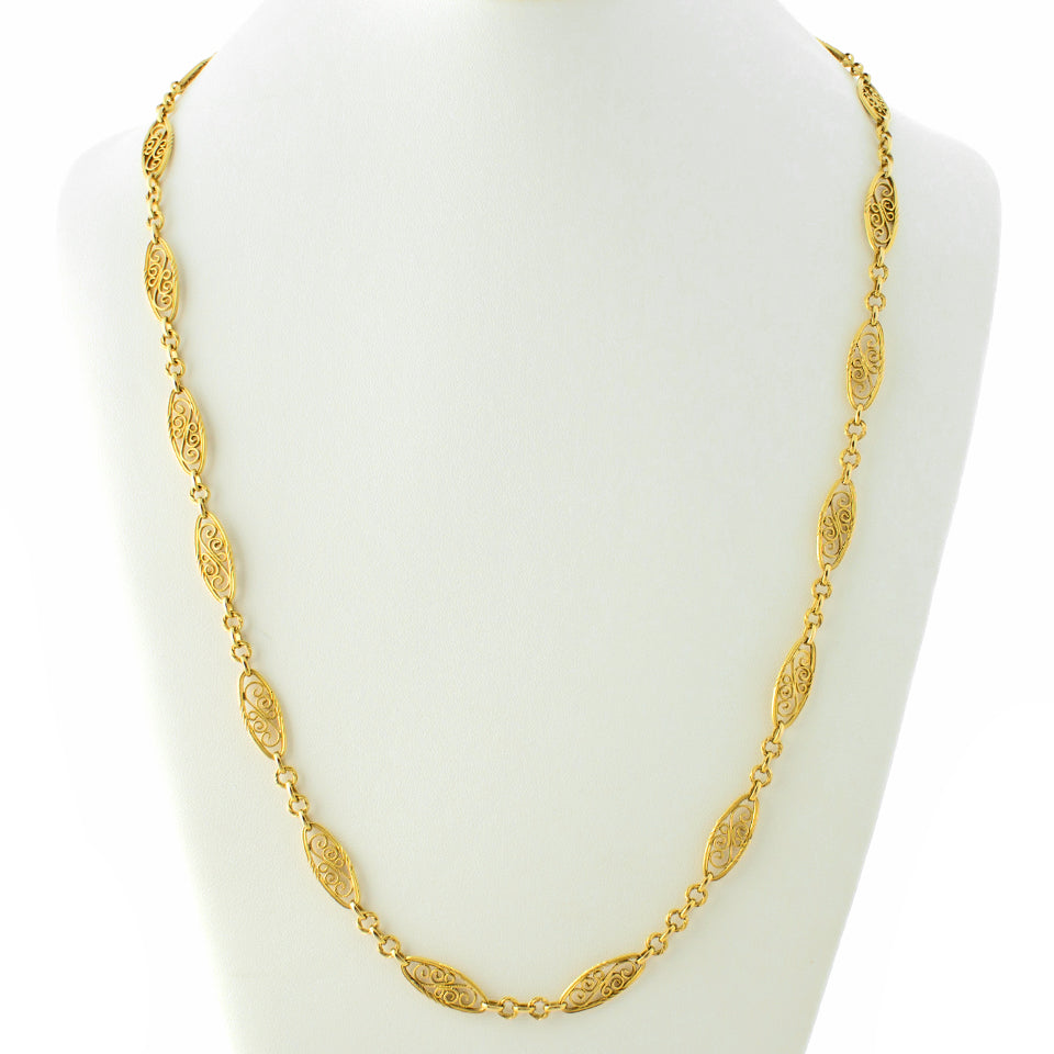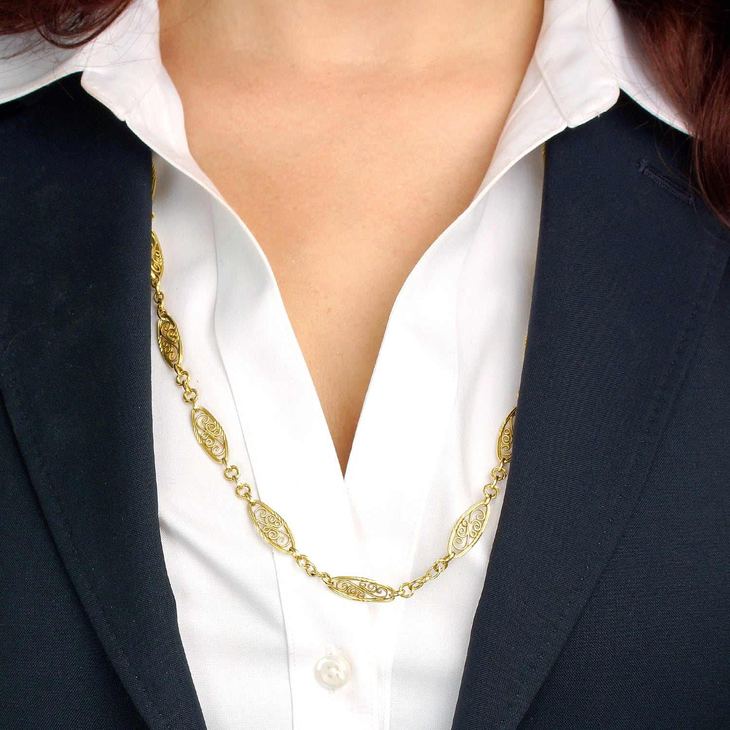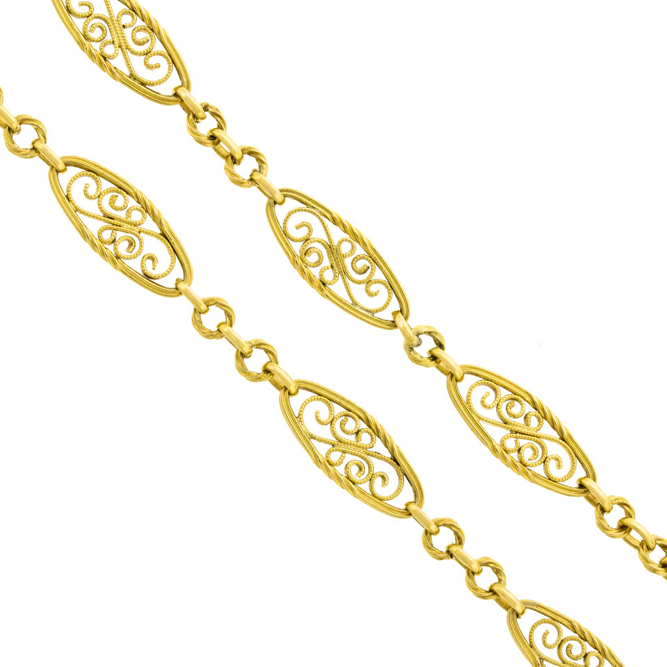 Circa 1890s, 18k, French. Featuring fine detail and superb construction, this antique French necklace has a stylish town and country look. The oval elements are handmade scrolled filigree, and the delicate connecting links are thoughtfully twisted for added visual appeal. This chain is 28 inches long, fabricated in eighteen-karat yellow gold, and in excellent condition.