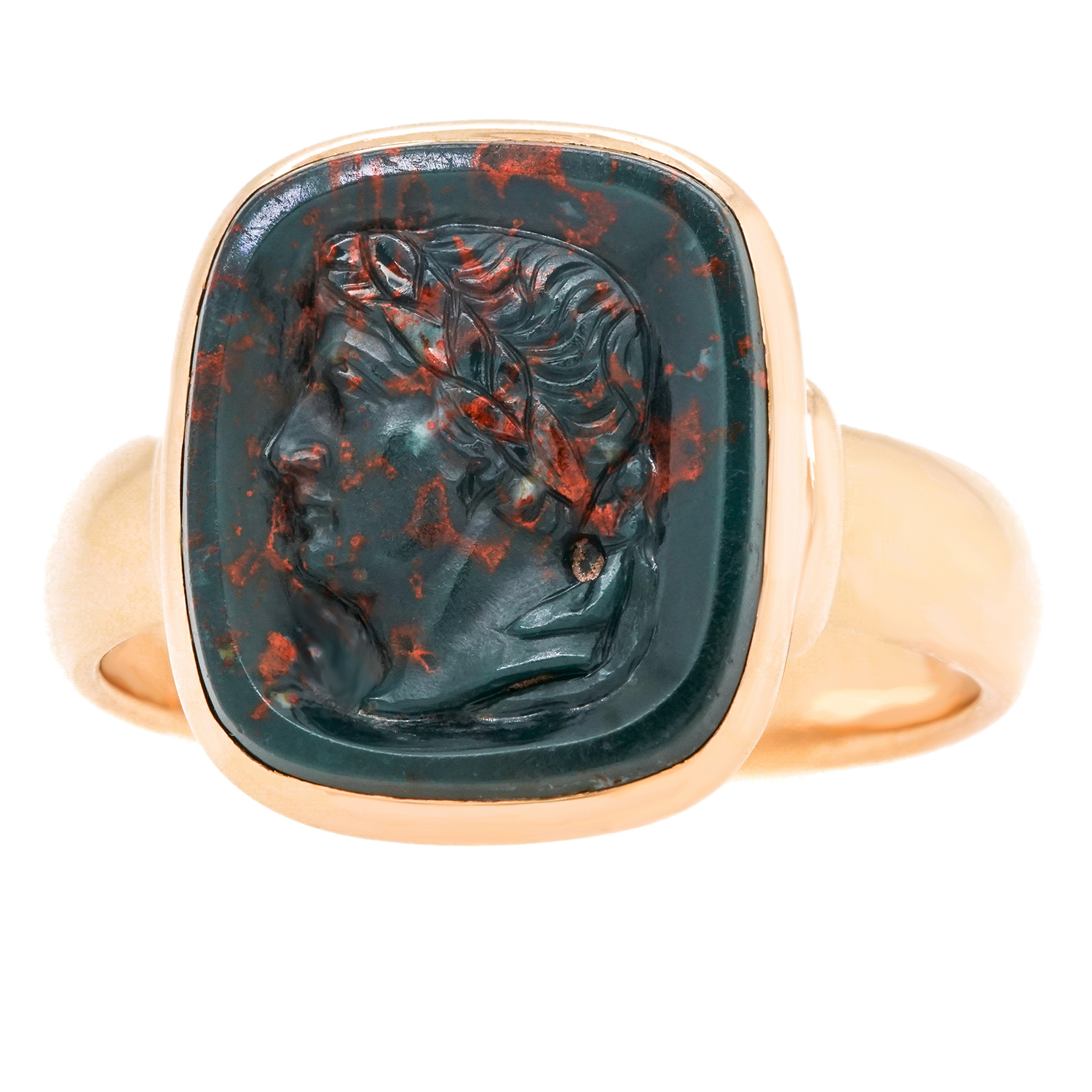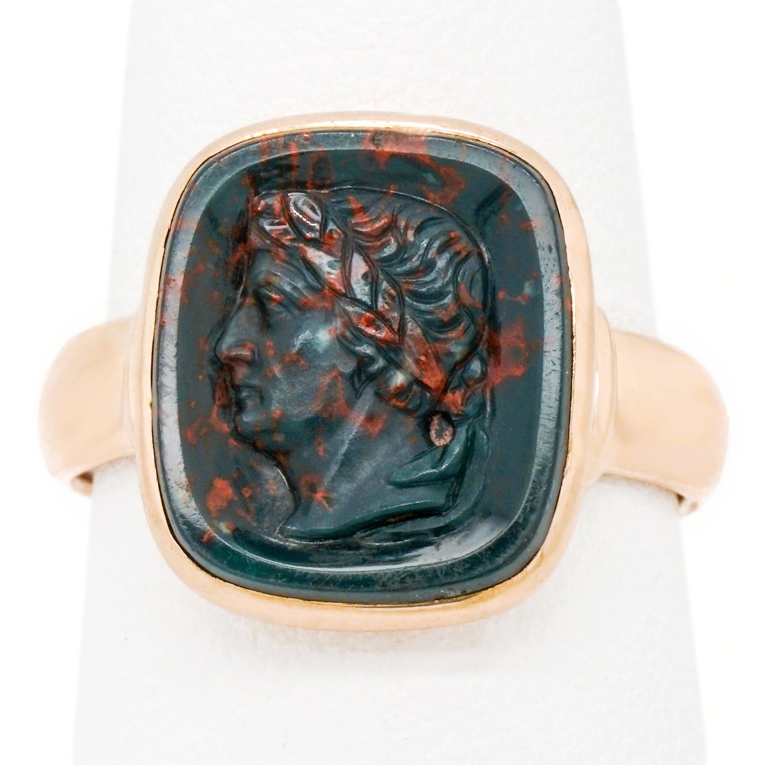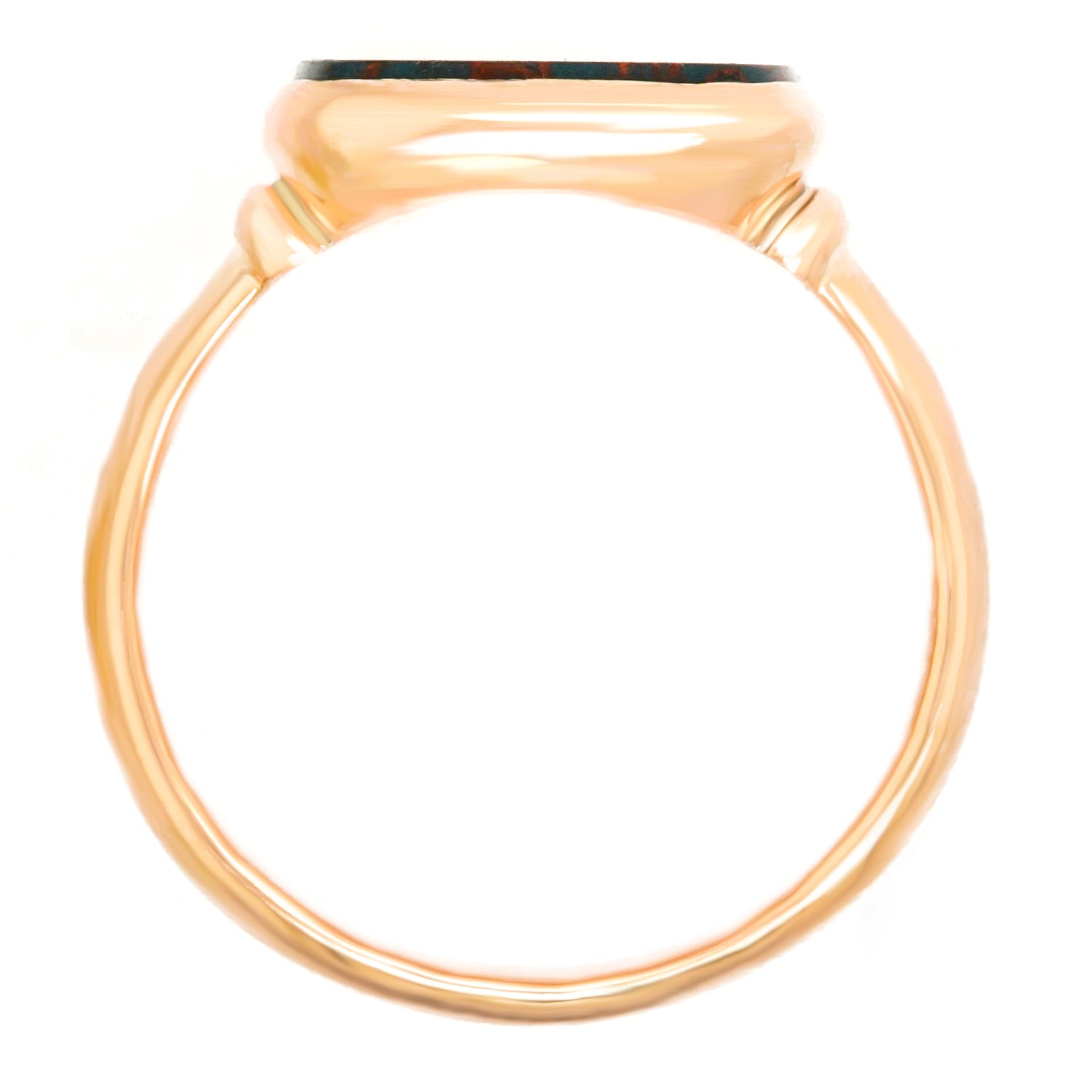 Circa 1890s, 14k, American.  Featuring a fine cameo cut bloodstone, the scale and proportions of this Architectural Revival signet ring are perfectly balanced. The look is vintage chic does antique town and country style!  Well-made in polished fourteen-karat gold, it is in excellent condition.