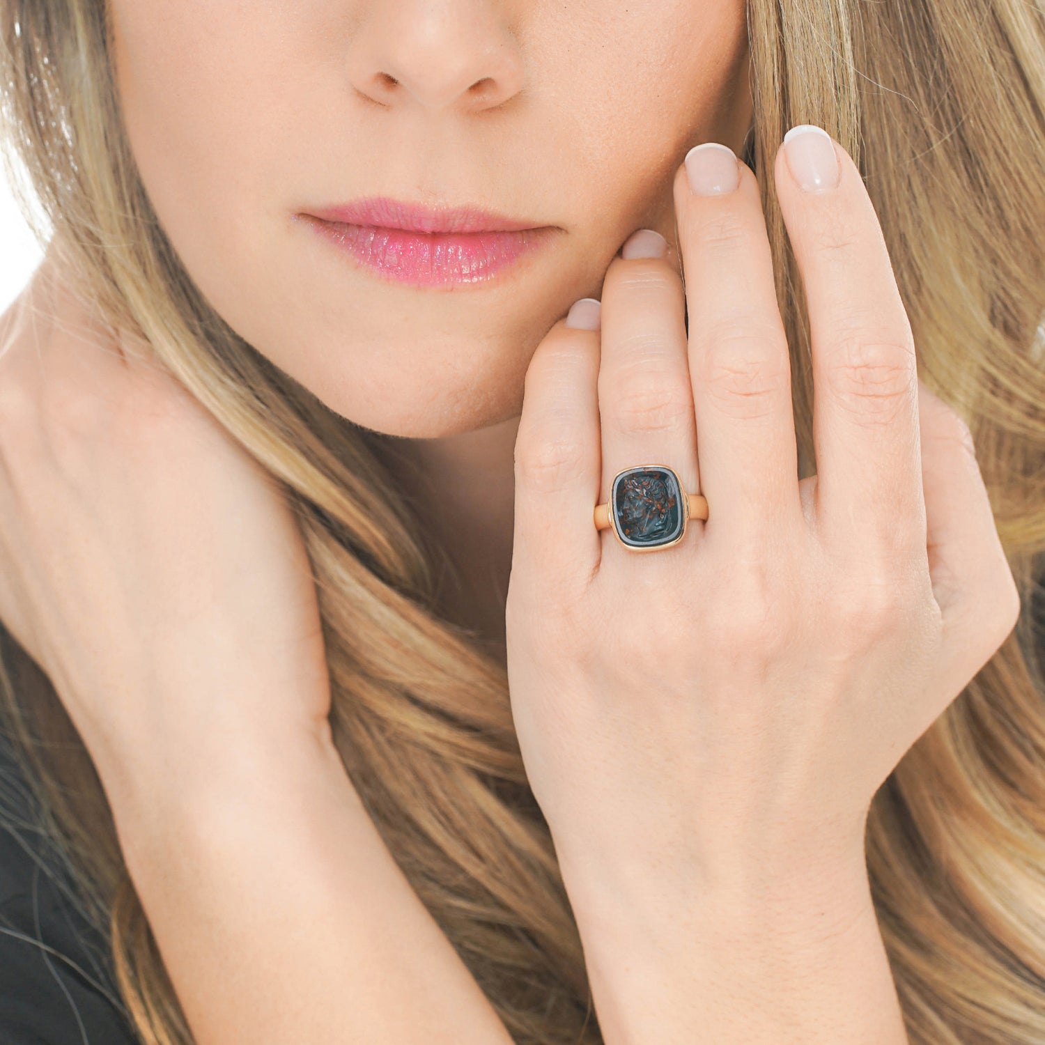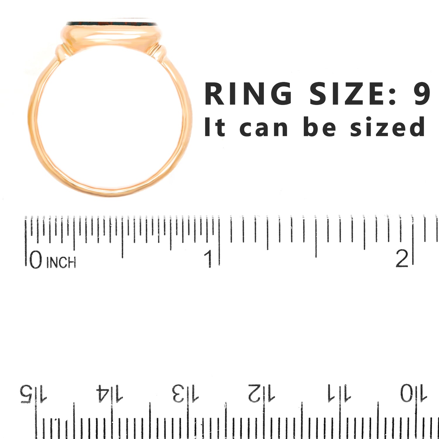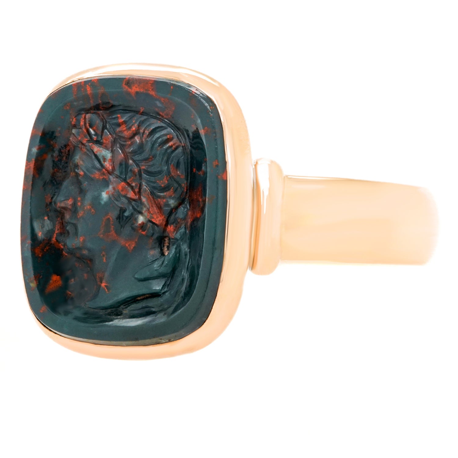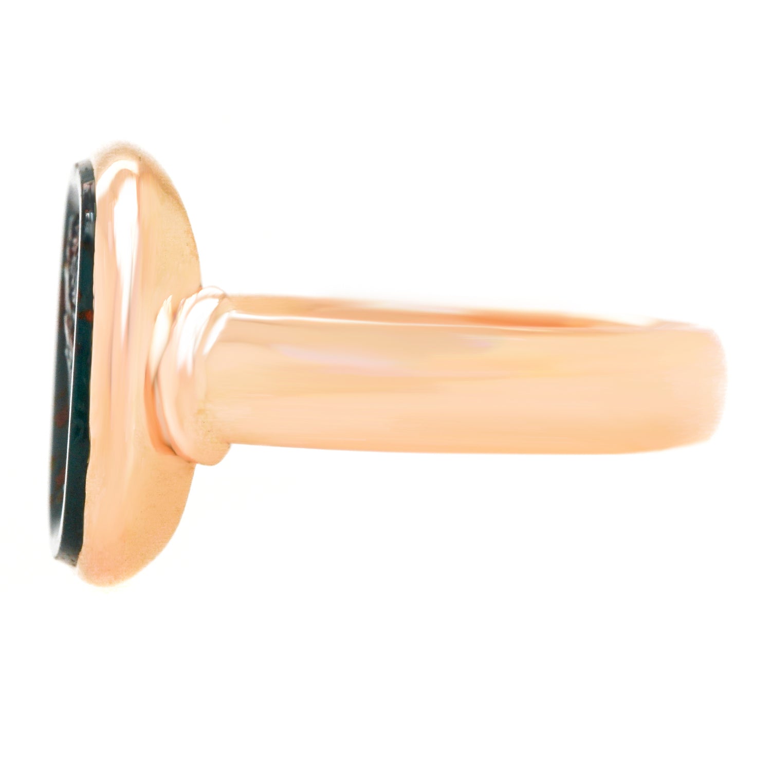 Circa 1890s, 14k, American.  Featuring a fine cameo cut bloodstone, the scale and proportions of this Architectural Revival signet ring are perfectly balanced. The look is vintage chic does antique town and country style!  Well-made in polished fourteen-karat gold, it is in excellent condition.