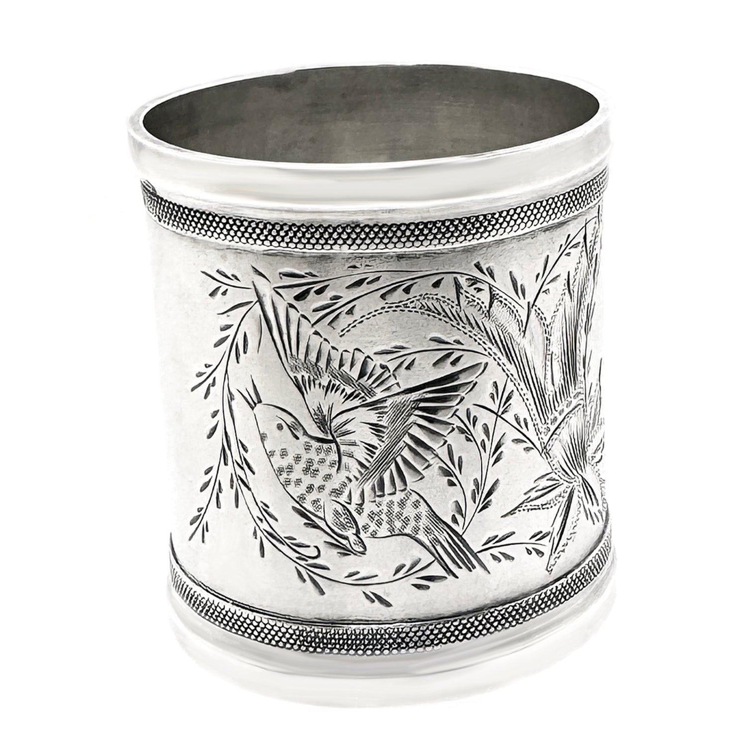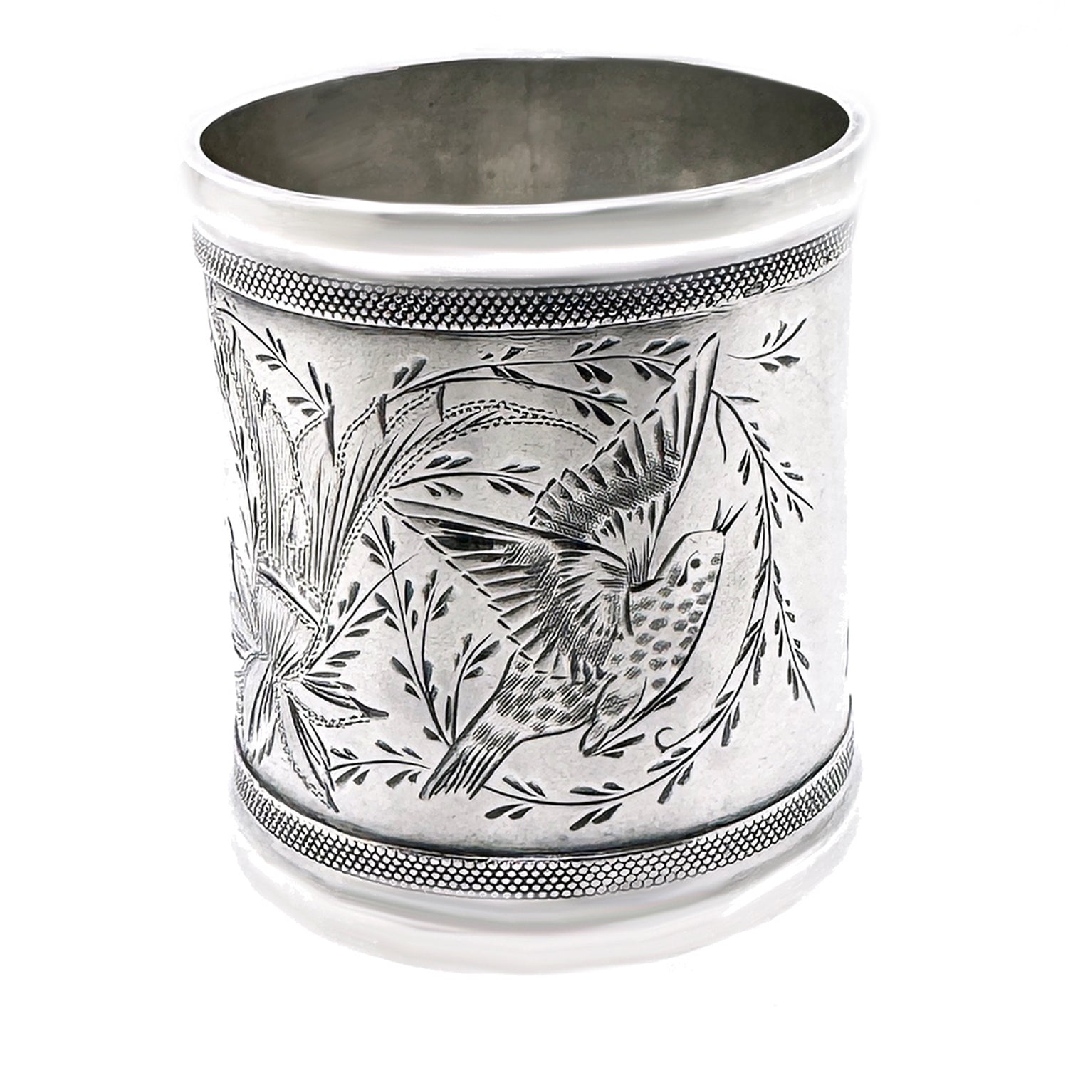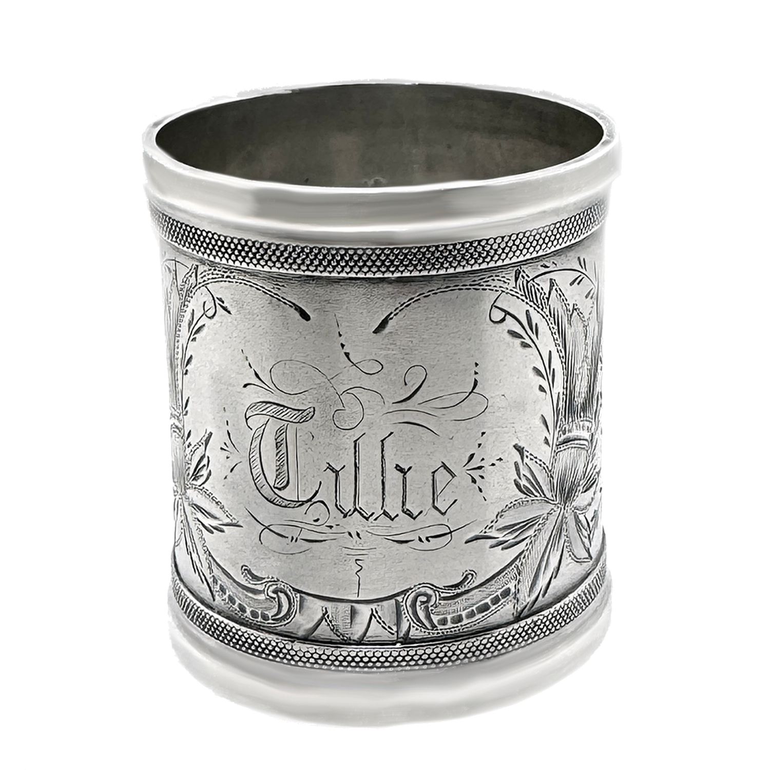 Circa 1880, Vansant & Co., Philadelphia. Brite cut and engine-turned sterling napkin ring inscribed "Tillie." Excellent condition.