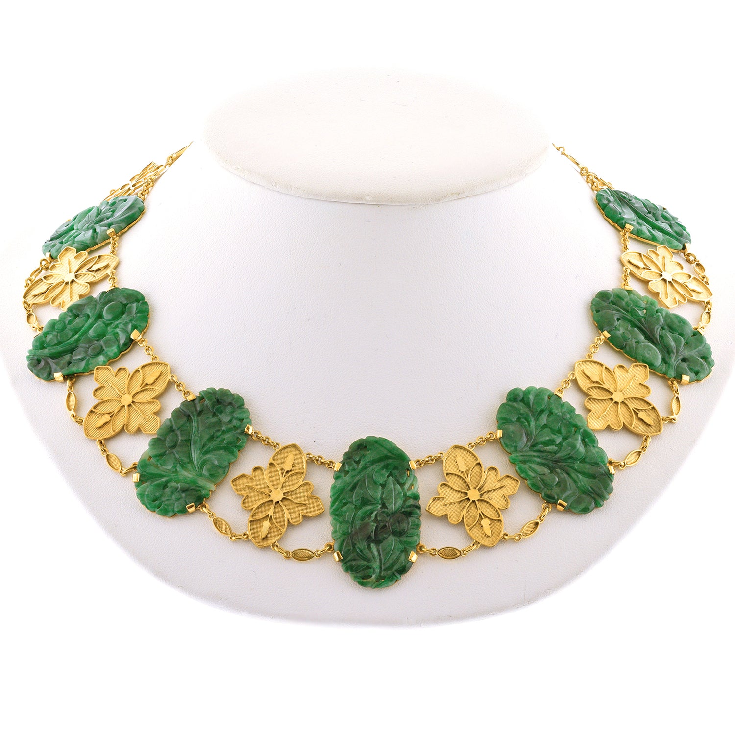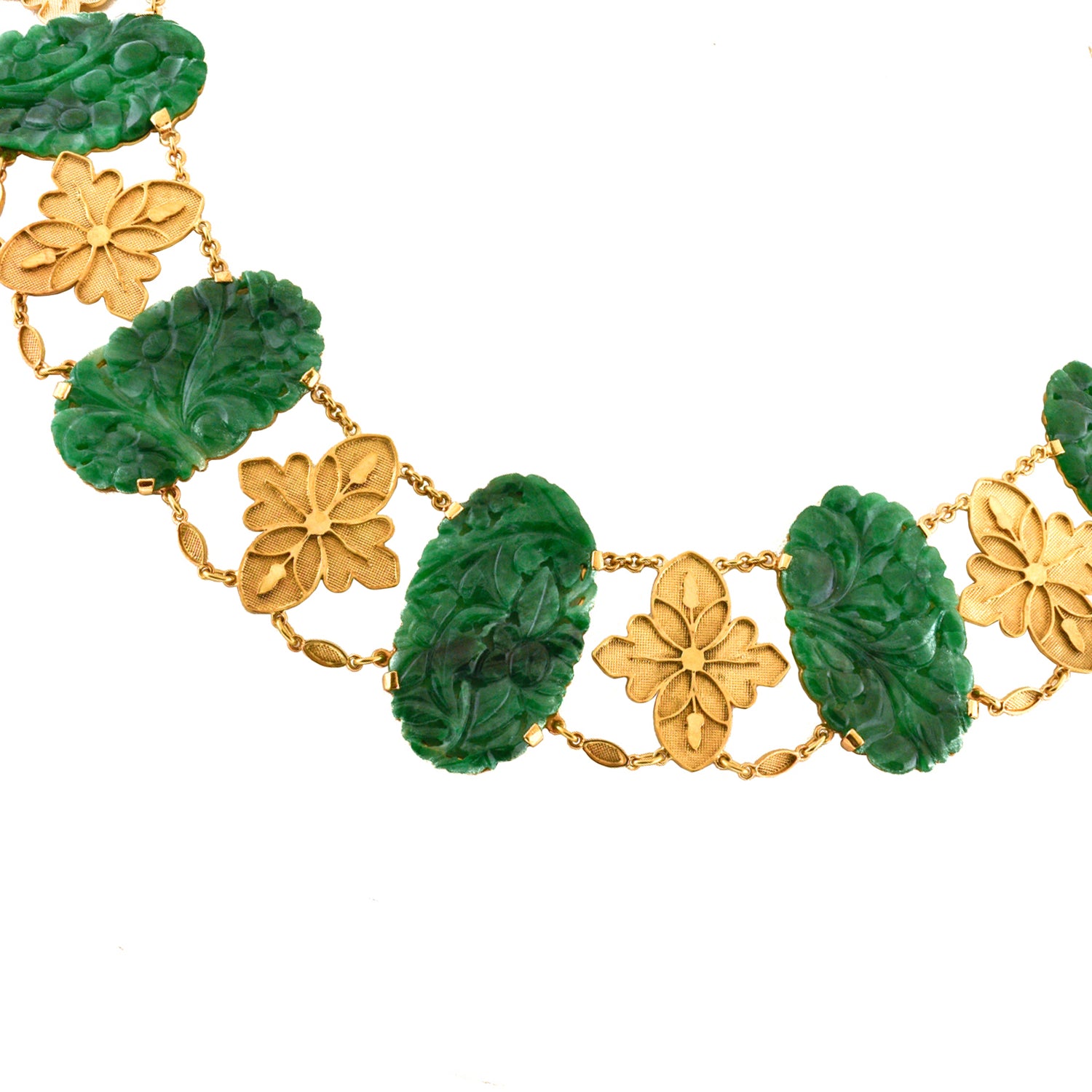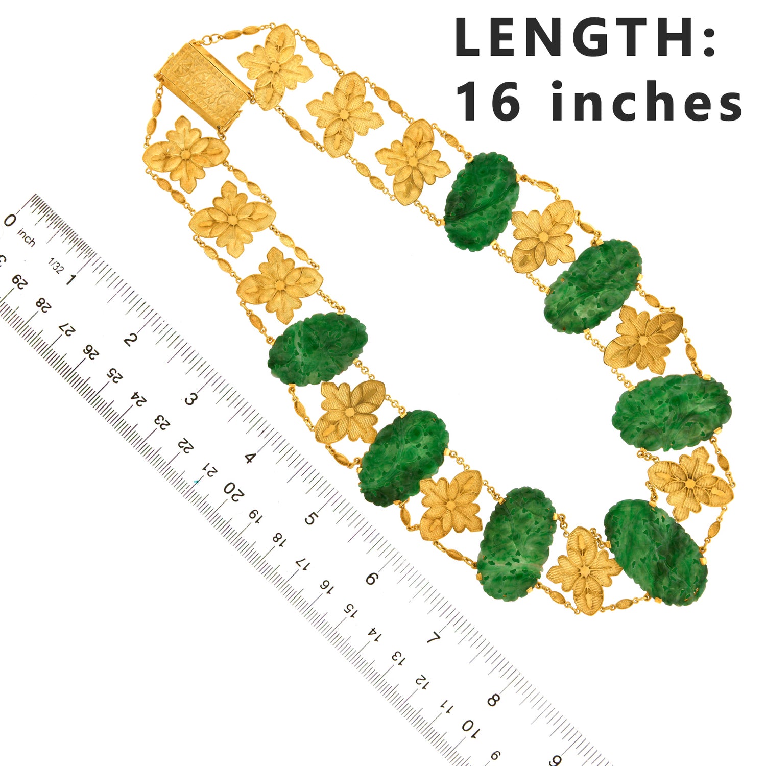 Circa 1880s-1890s, 14k. This magnificent antique necklace features sumptuous gold-work set with beautiful antique Chinese carved jade. The look is vintage chic at its Victorian best. Handmade and one-of-a-kind, this would have been a very fashionable necklace 150 years ago. Today it is an antique find that adds character, soul, and romance to contemporary looks. Meticulously made, it is in excellent condition.