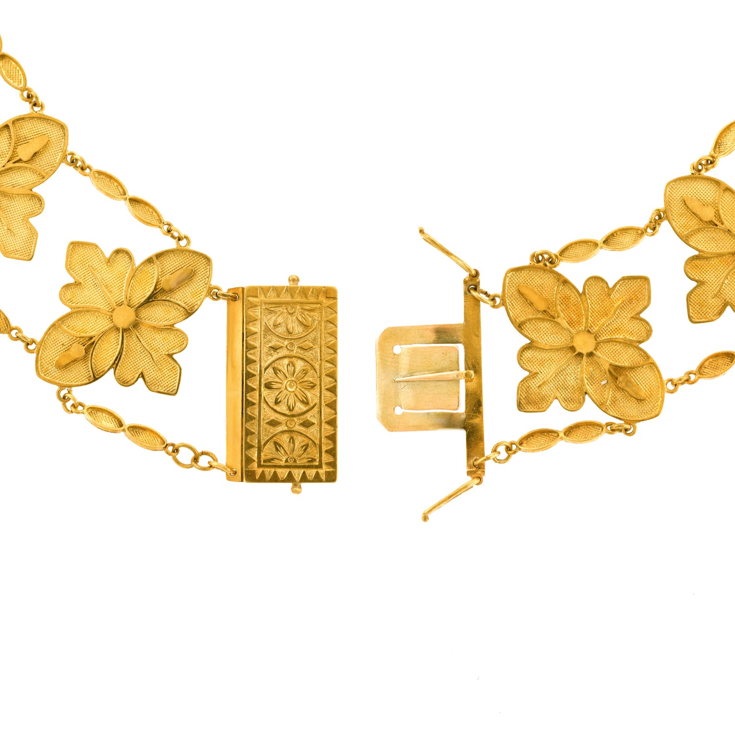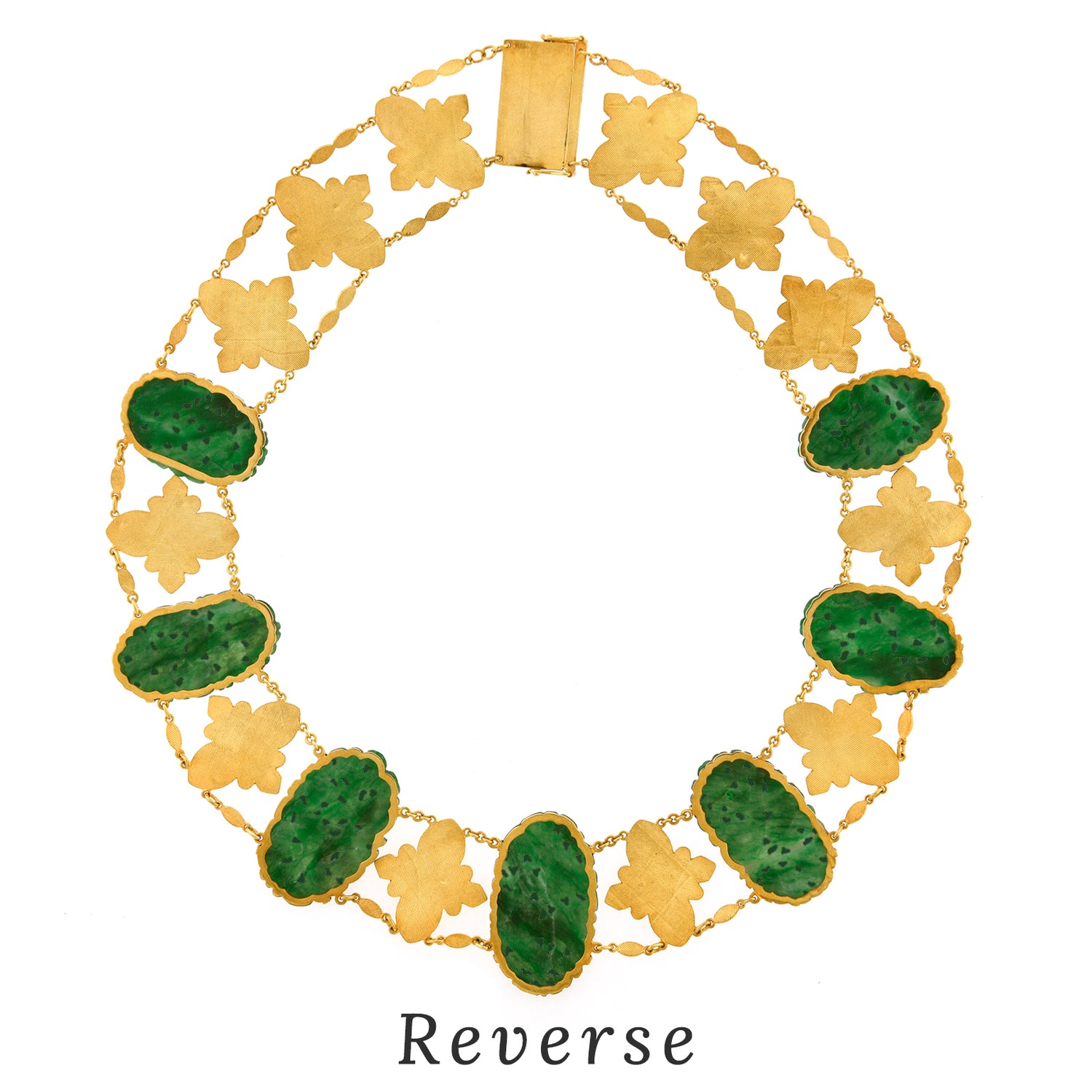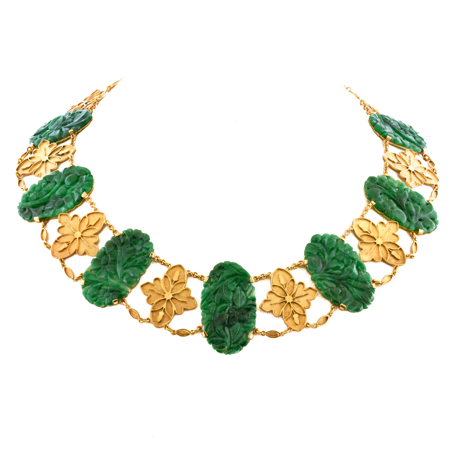 Circa 1880s-1890s, 14k. This magnificent antique necklace features sumptuous gold-work set with beautiful antique Chinese carved jade. The look is vintage chic at its Victorian best. Handmade and one-of-a-kind, this would have been a very fashionable necklace 150 years ago. Today it is an antique find that adds character, soul, and romance to contemporary looks. Meticulously made, it is in excellent condition.