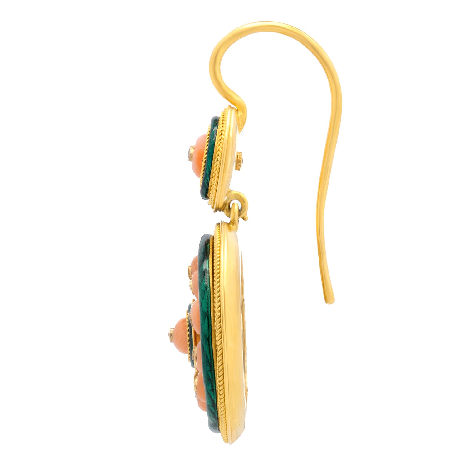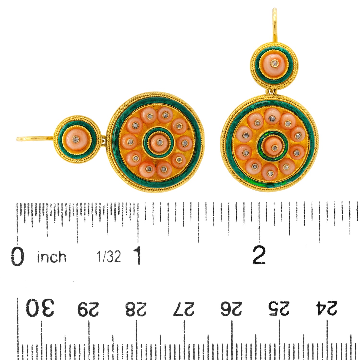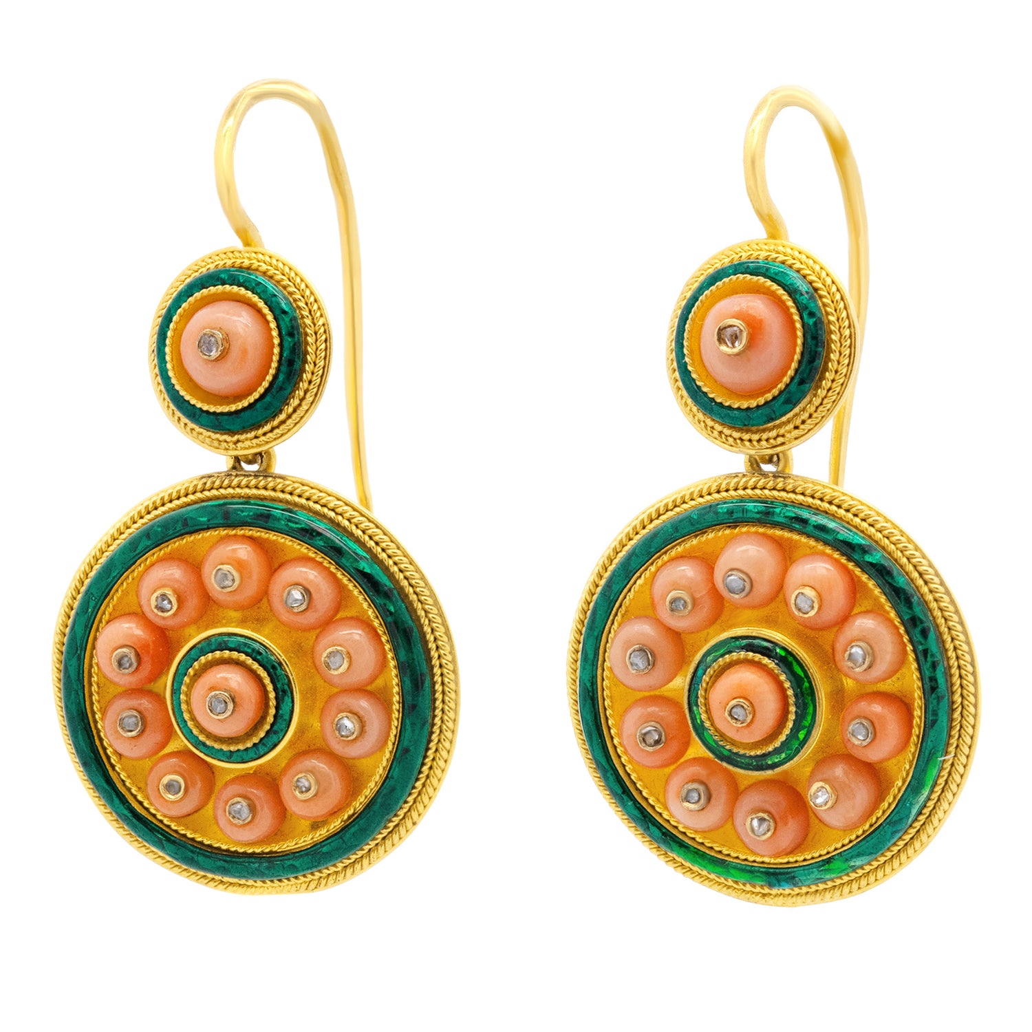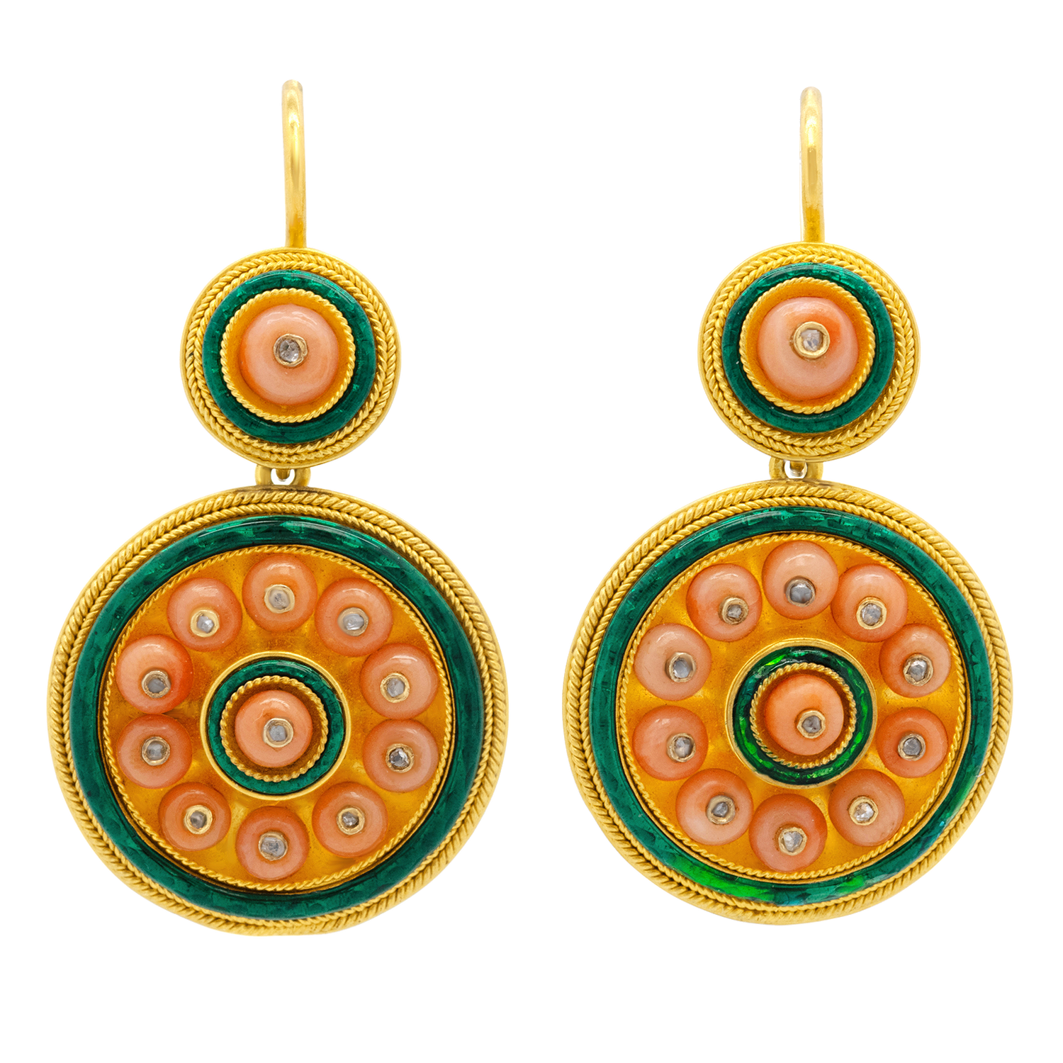 Circa 1880s, 18k. These antique earrings are authentic fashion from almost 150 years ago! Gorgeous coral beads surmounted by diamonds are surrounded by two lush green enamel circles. With subtle flirty movement, these earrings catch the eye! Superb design, quality materials, and meticulous construction complete the look. Excellent condition.