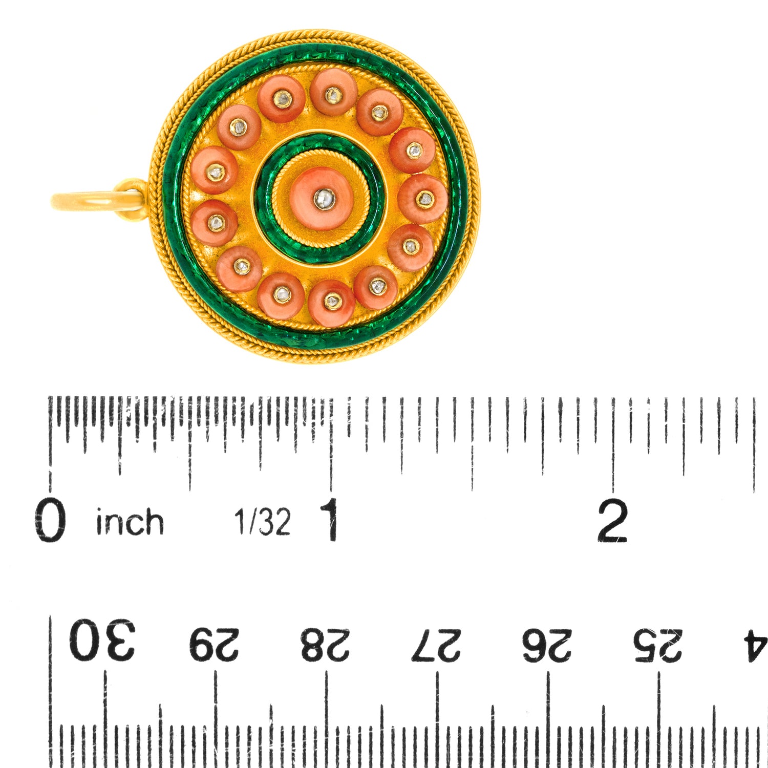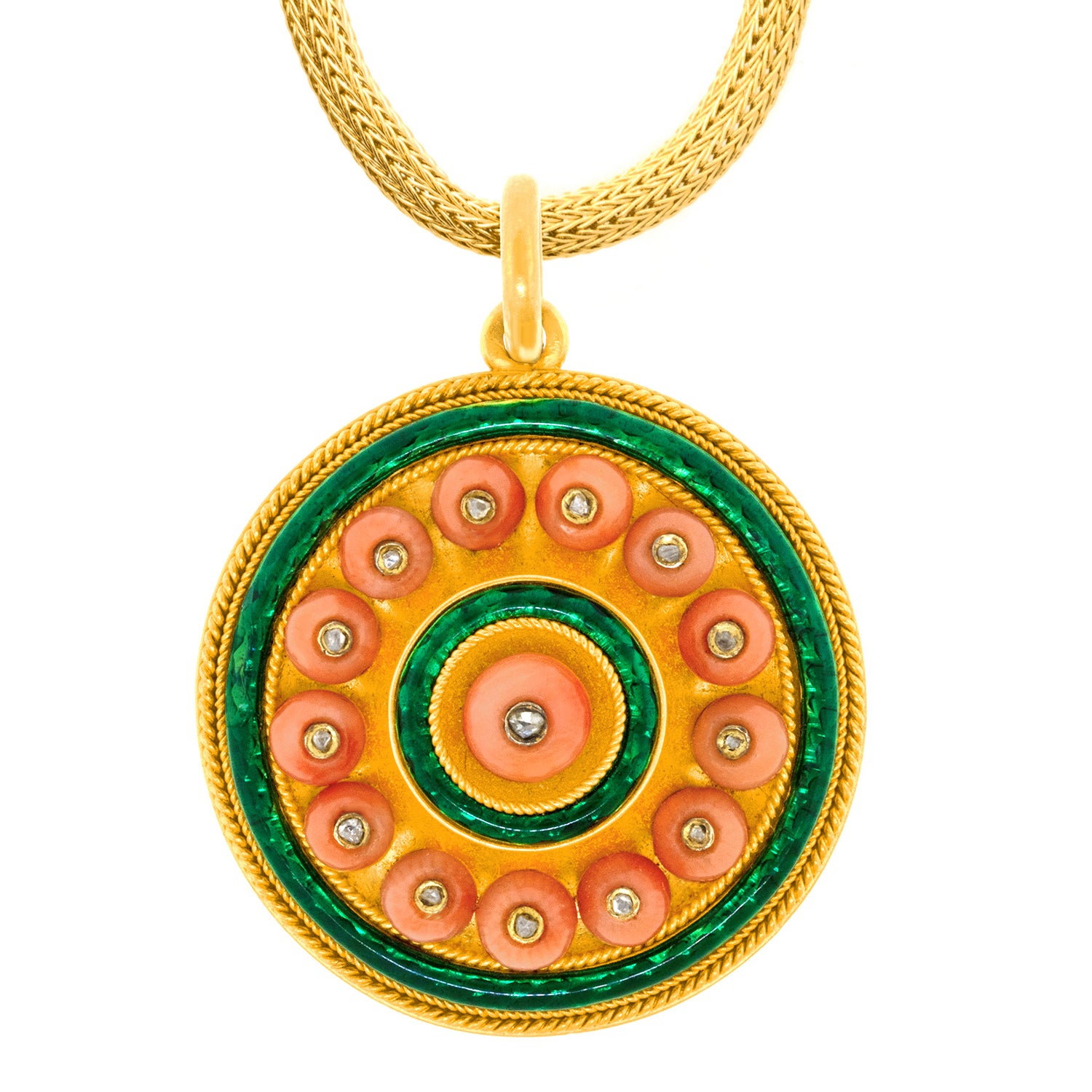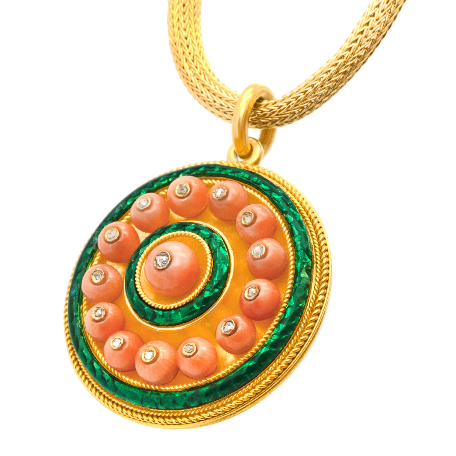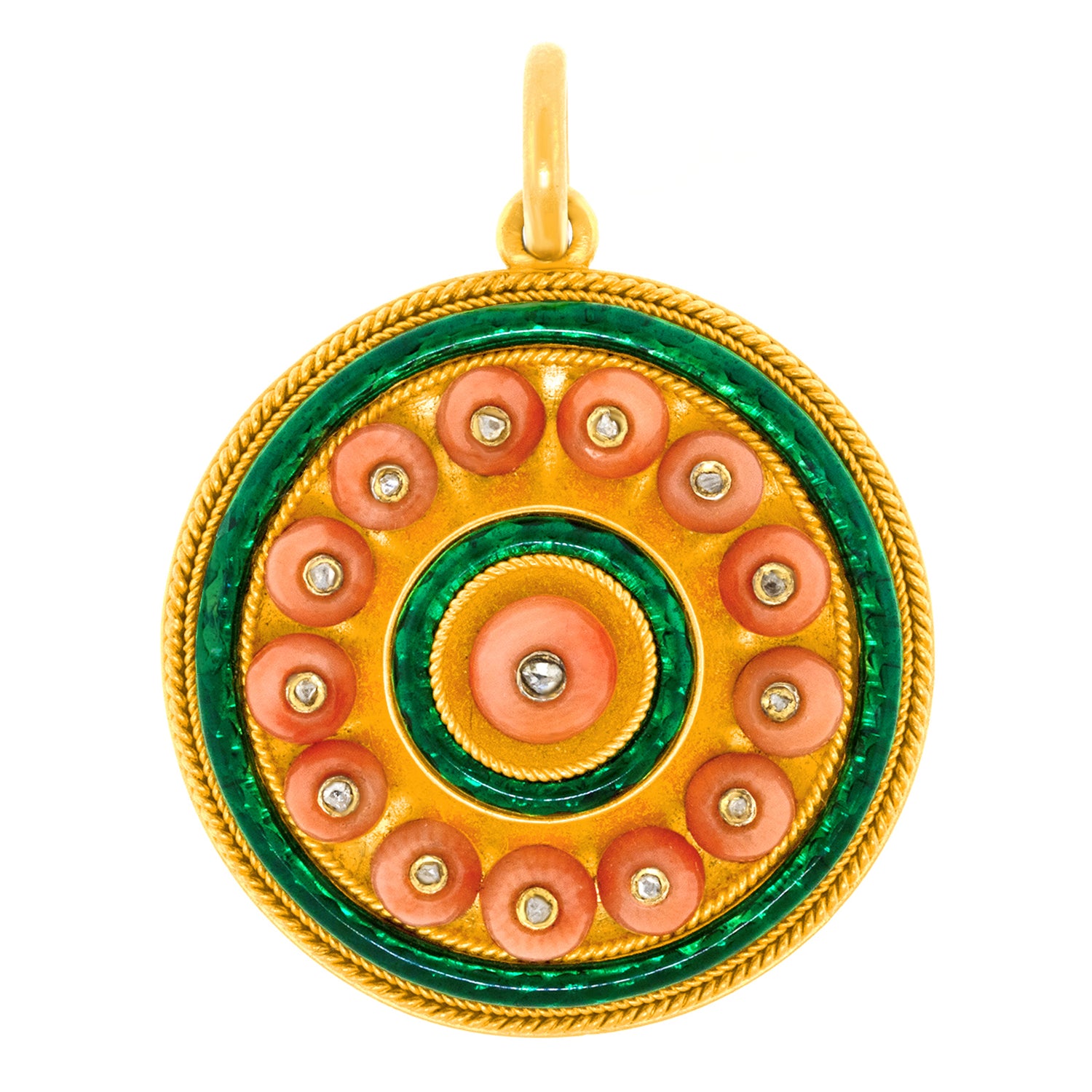 Circa 1880s, 18k. This antique pendant is authentic fashion from almost 150 years ago! Gorgeous coral beads surmounted by diamonds are surrounded by lush green enamel. Superb design, quality materials, and fine construction complete the look. Excellent condition.