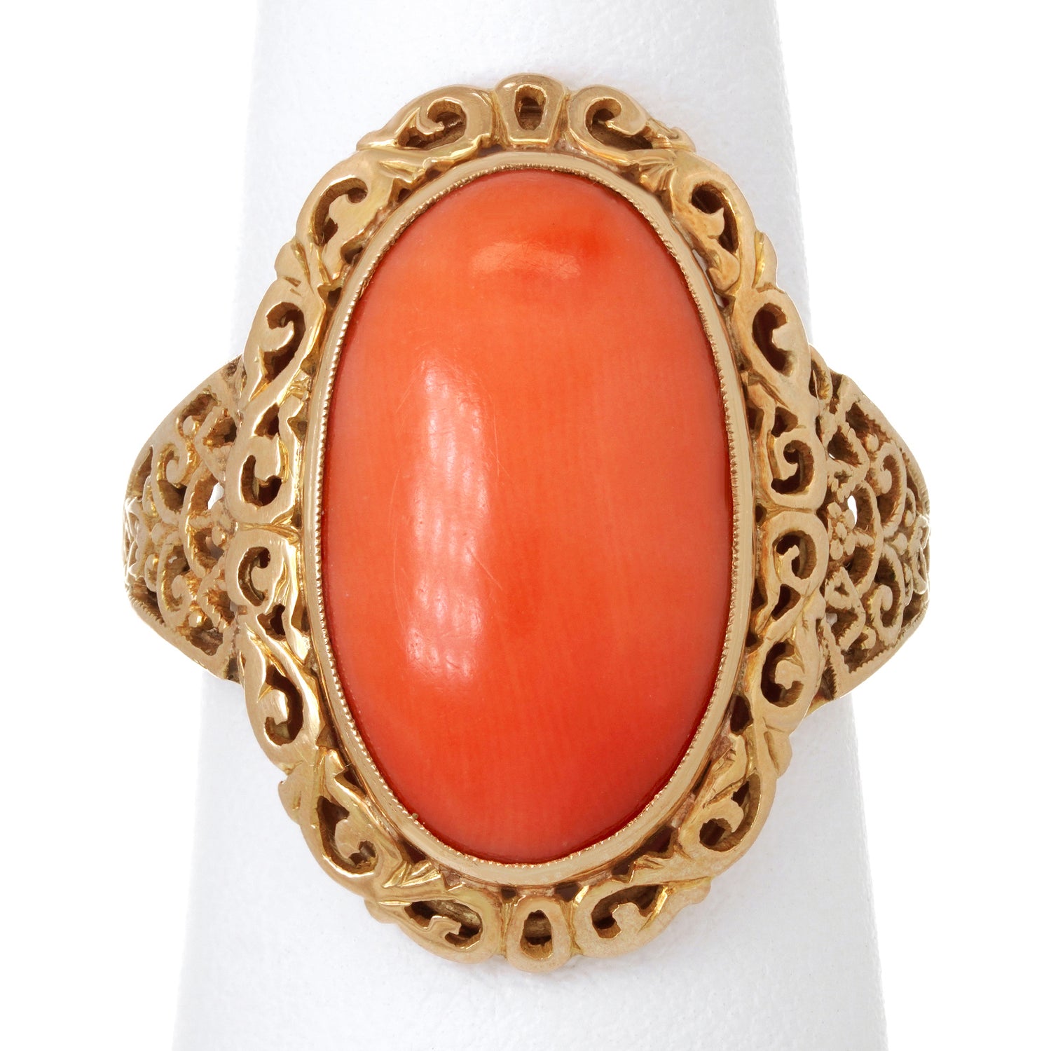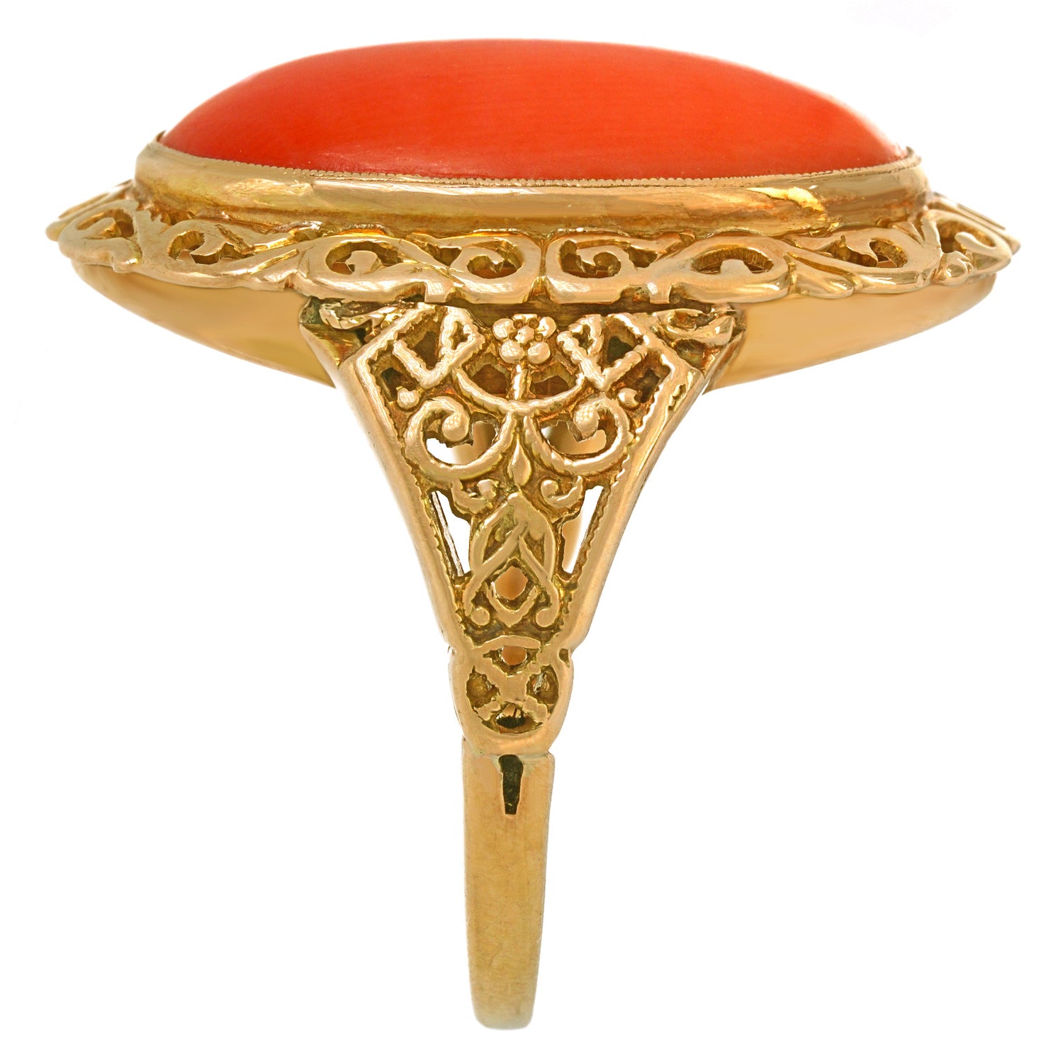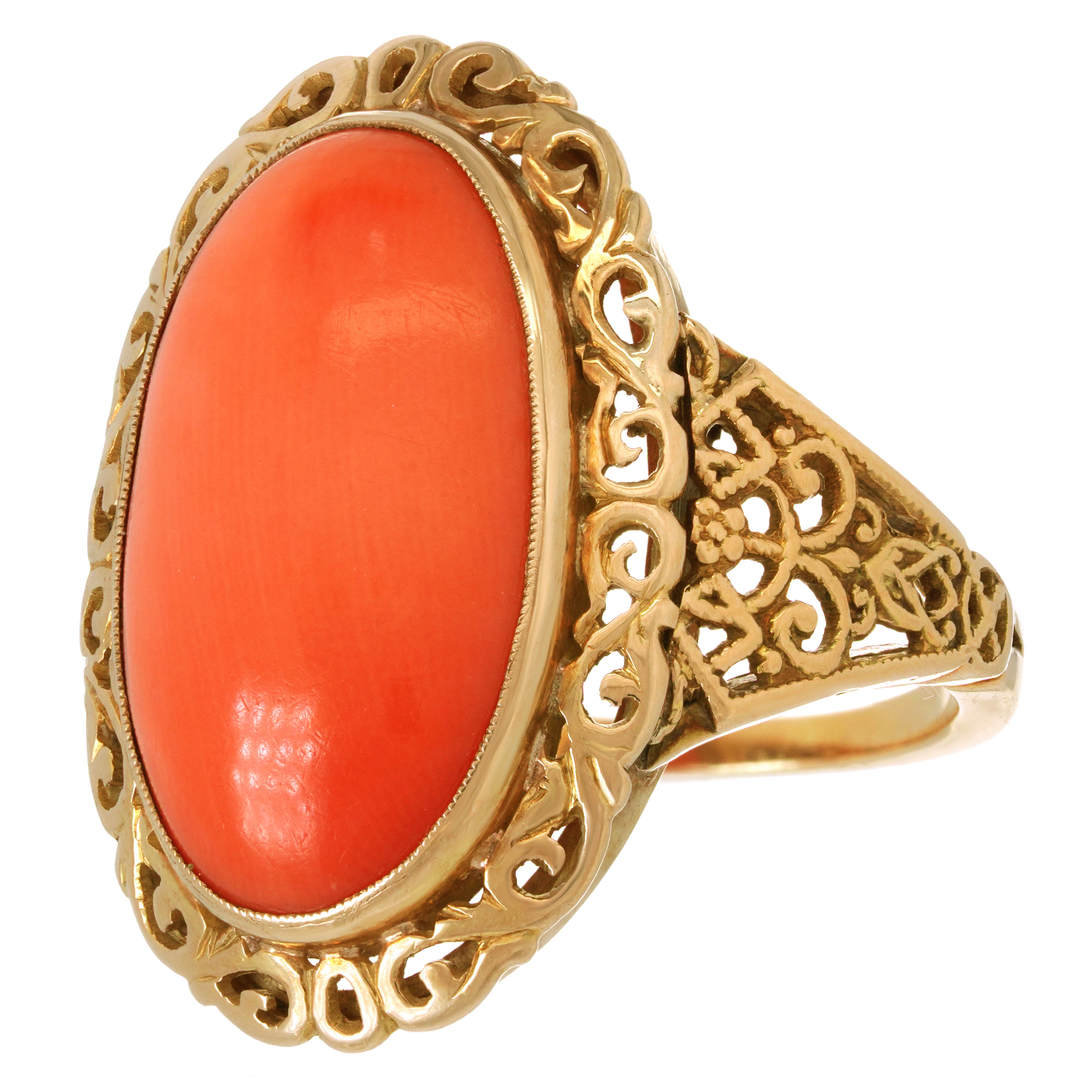 Circa 1920s, 14k.   With its lush natural coral cabochon and profuse filigree, this fabulous Art Deco ring is all about color and detail. Completely handmade, the look is one-of-a-kind vintage chic.  Excellent condition.