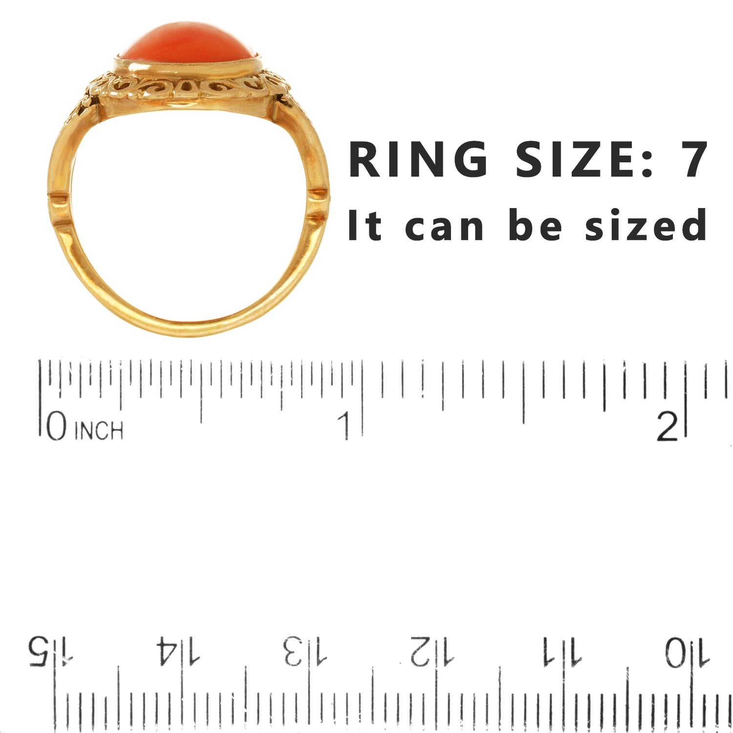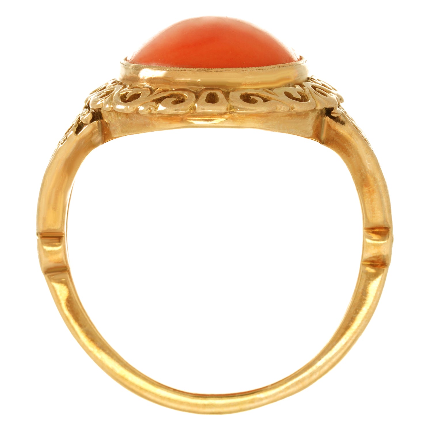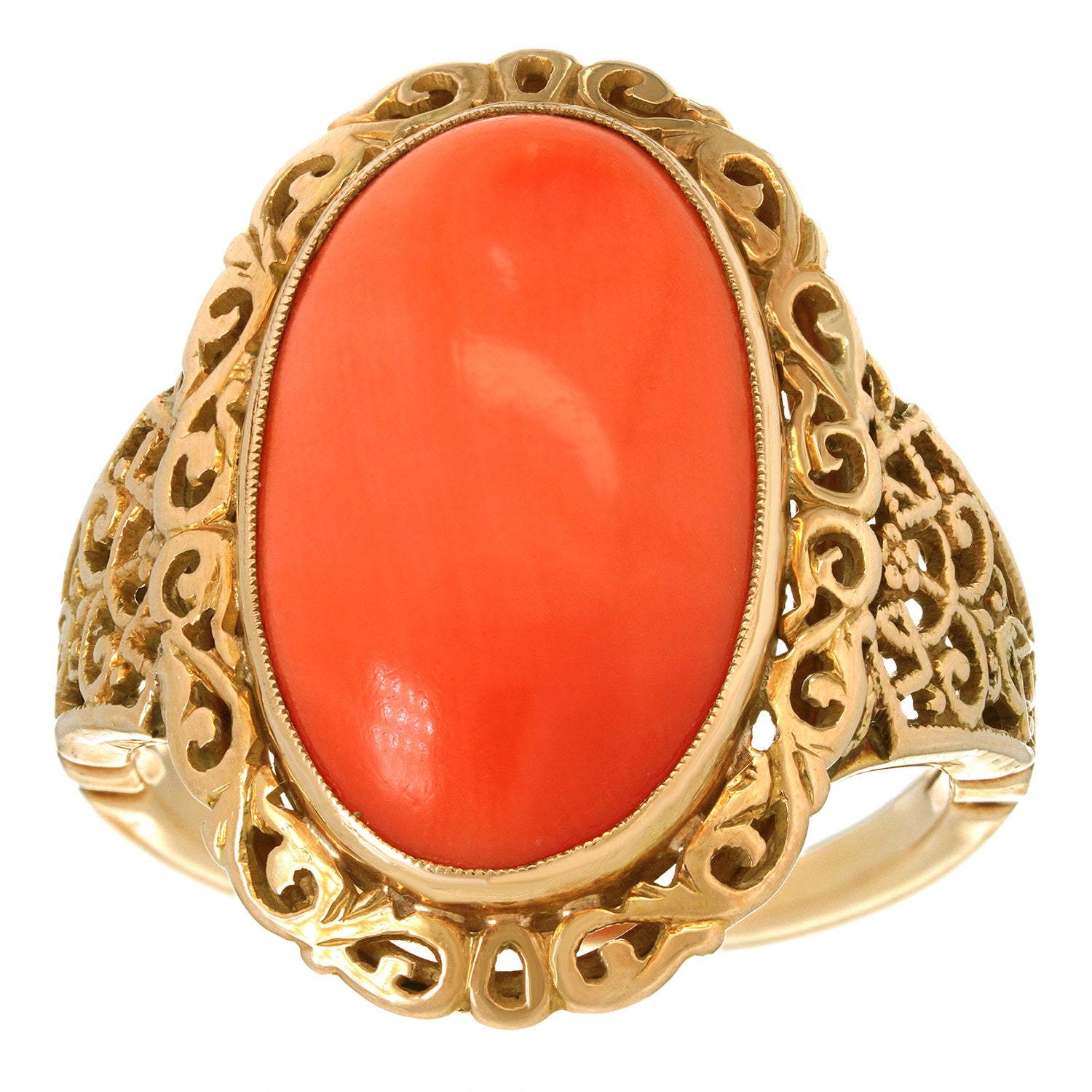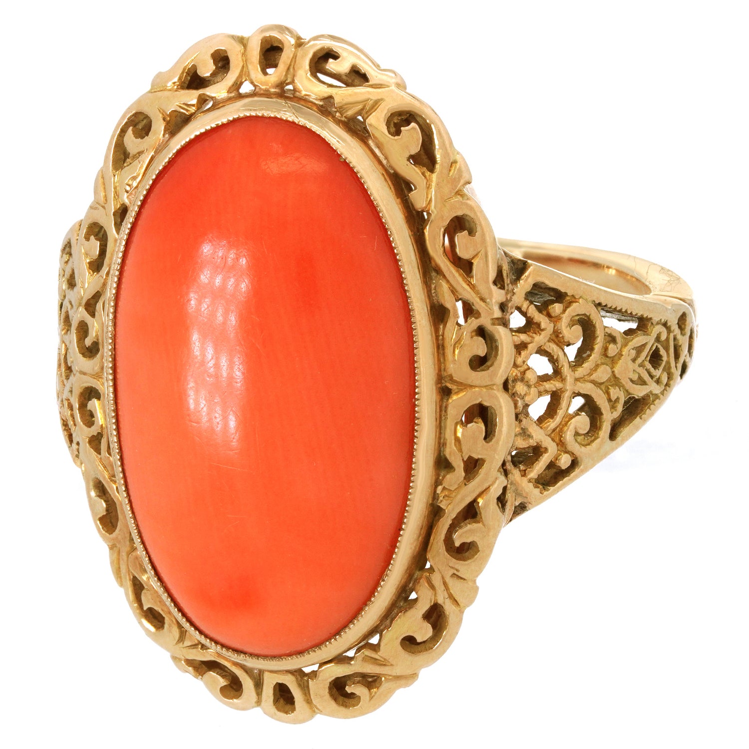 Circa 1920s, 14k.   With its lush natural coral cabochon and profuse filigree, this fabulous Art Deco ring is all about color and detail. Completely handmade, the look is one-of-a-kind vintage chic.  Excellent condition.