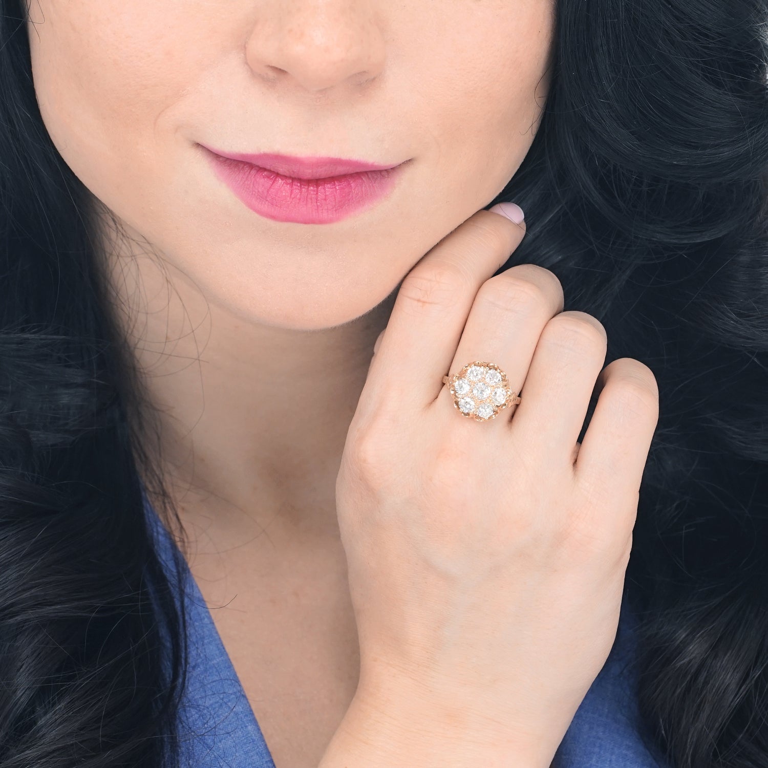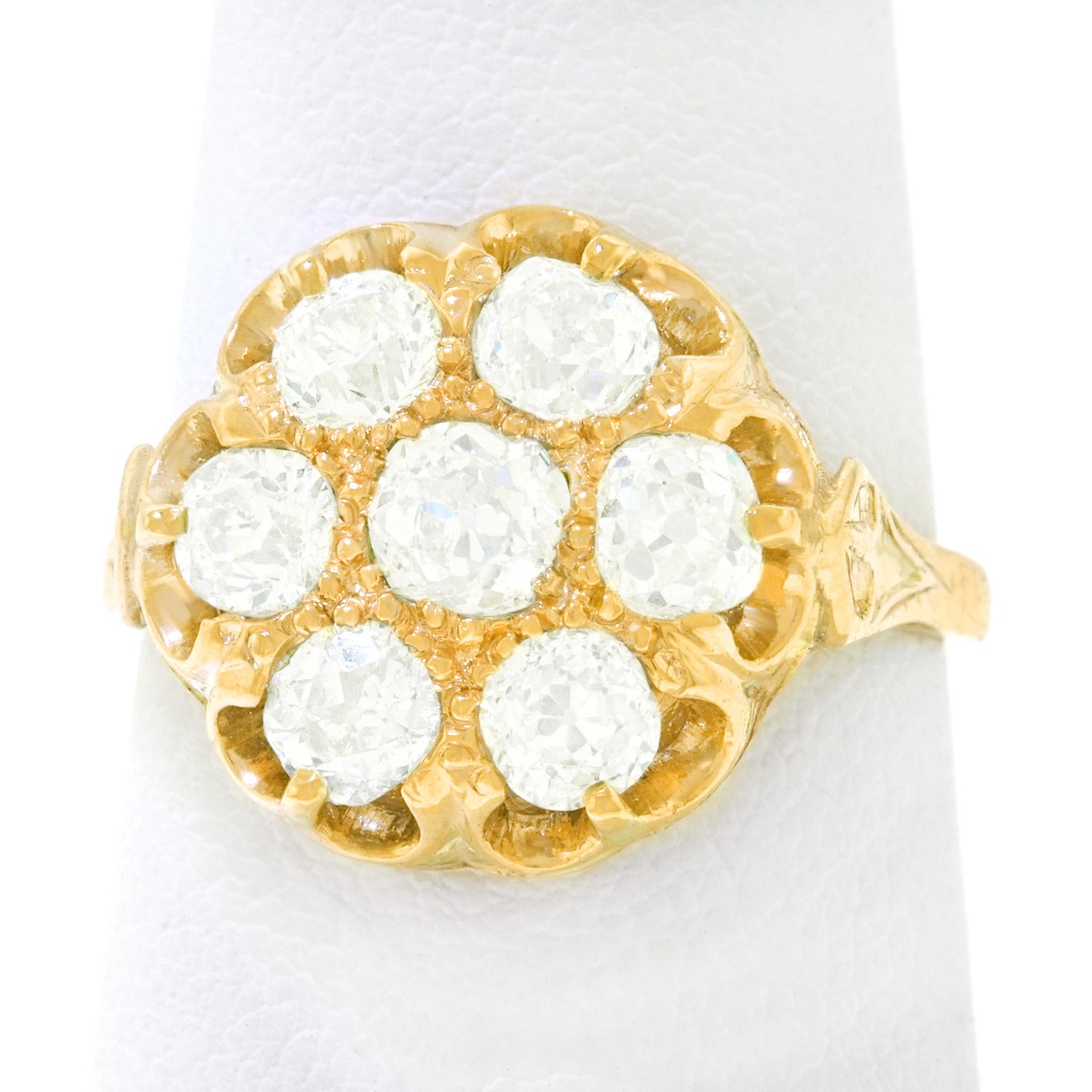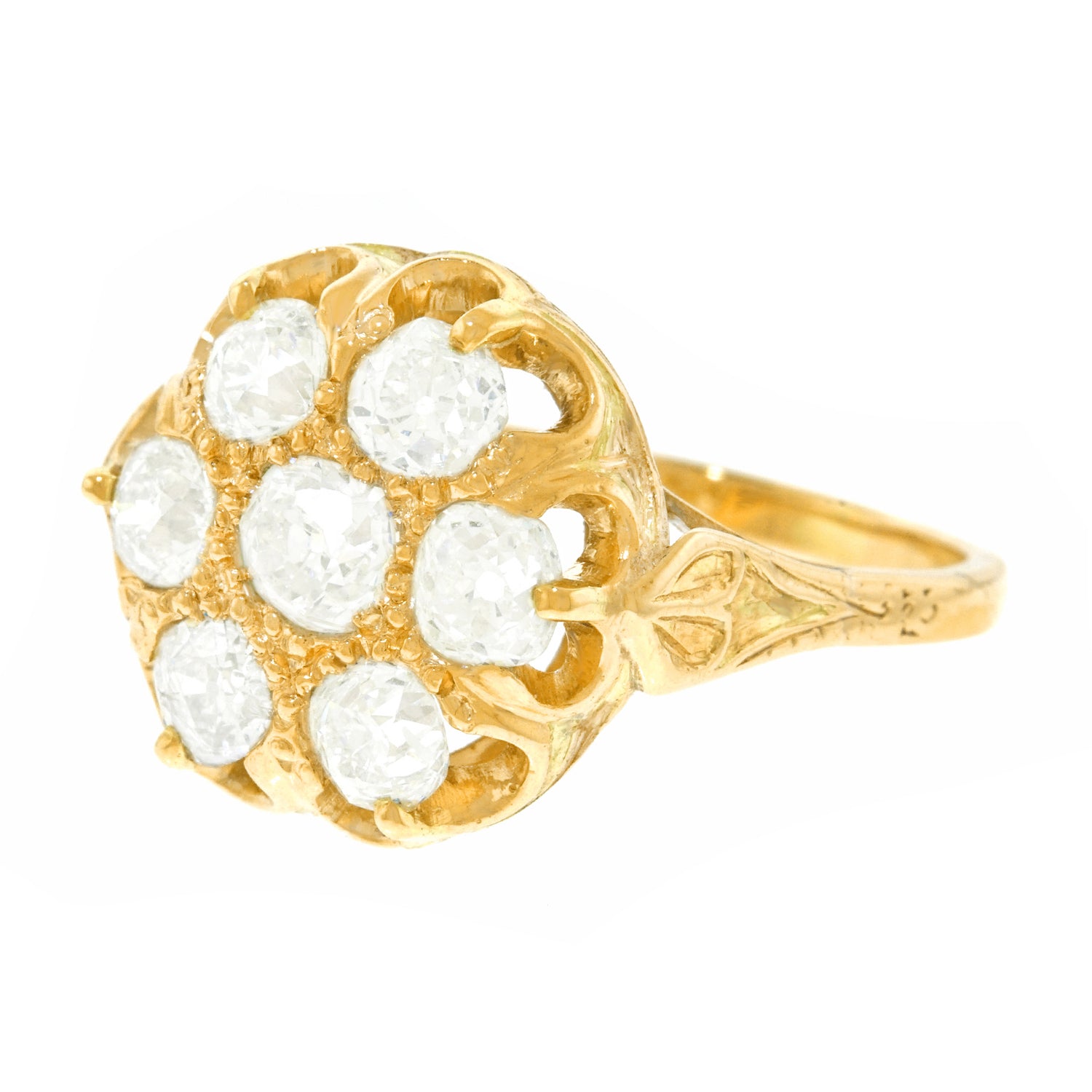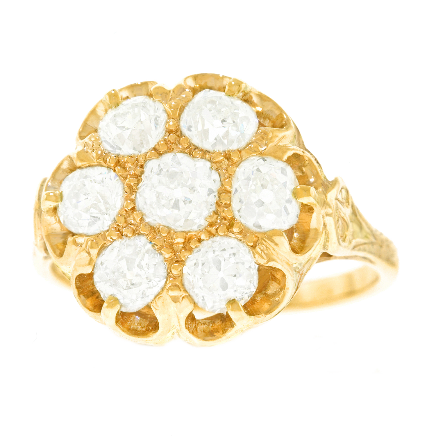 Circa 1880s, 14k, American.  This romantic candlelight ring is set with 2.0 carats of brilliant white mine-cut diamonds (H-I color, SI1 clarity). The old cuts catch the light and reflect back broad prismatic shafts, much as one sees when a candle flickers. Vintage chic at its antique best, this ring is a superb accessory. Finely fabricated, it is in excellent condition.