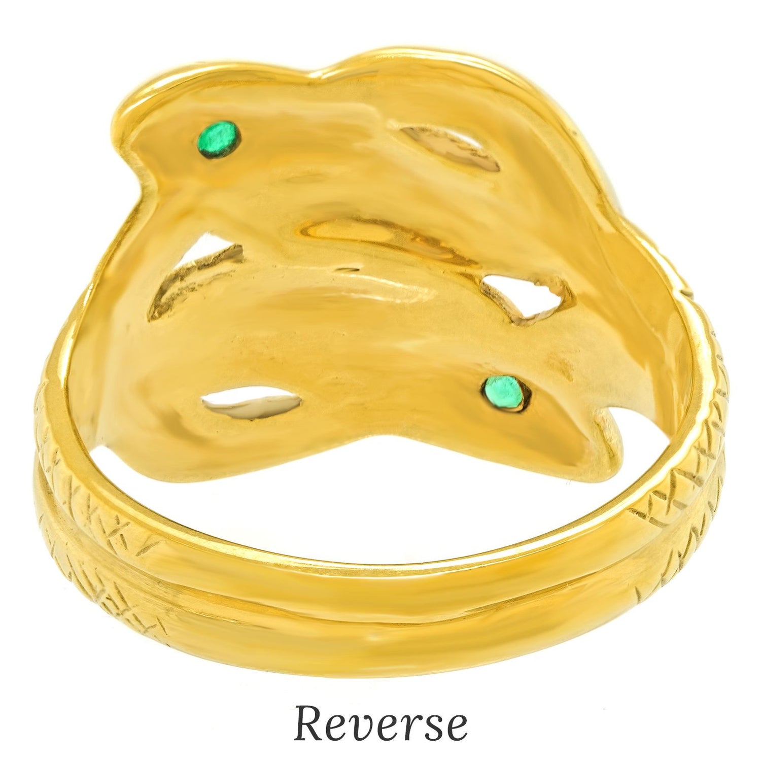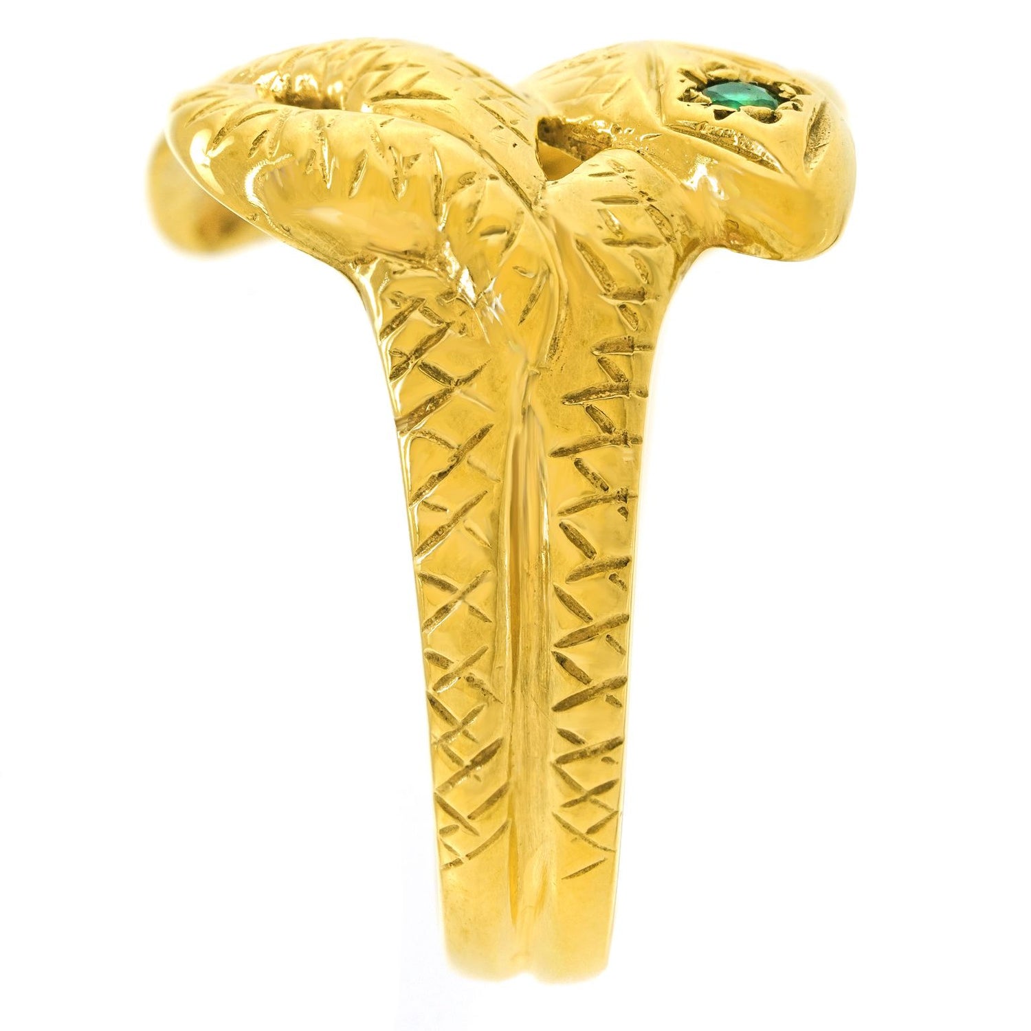Circa 1890s, 14k. This enticing Victorian double snake ring's distinctive look brings ancient mysticism to our everyday. Finely made in fourteen-karat yellow gold, the look is vintage chic at its antique best. Our snakes have fine hand engraved details and bright emeralds in their heads! Excellent condition.
