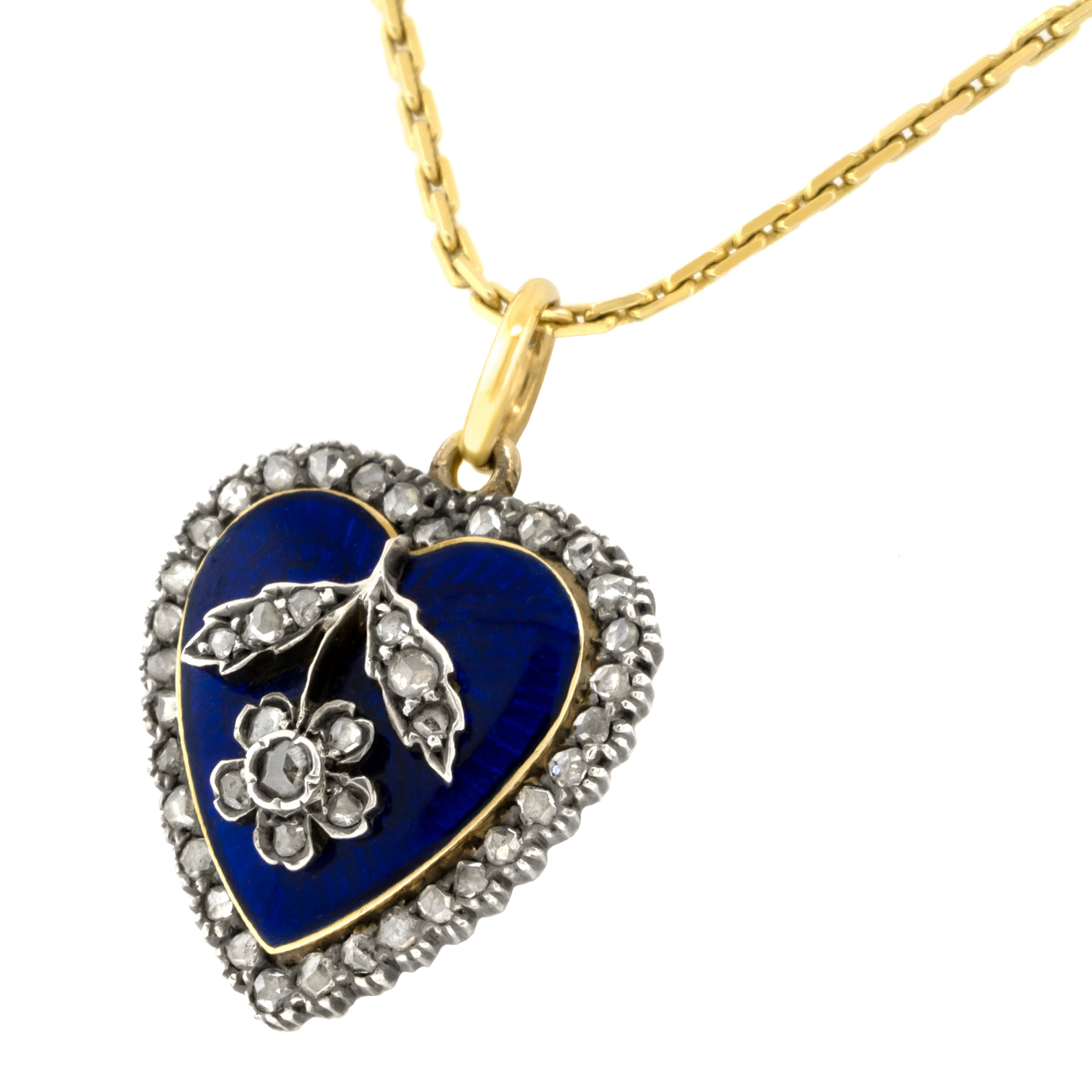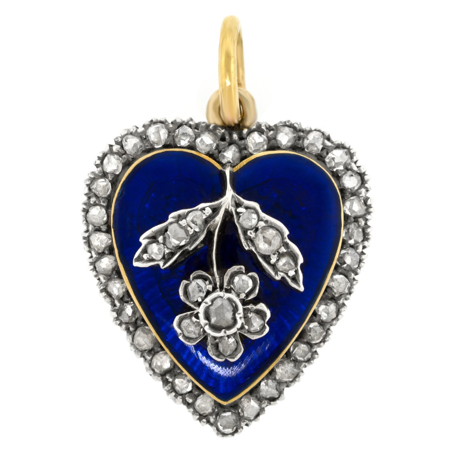Circa 1870s, Silver over Gold (14k). Colorful, charming, and feminine, this Victorian heart pendant is antique chic at its vintage best. Finely fashioned in silver over fourteen-karat gold, beautifully enameled, and set with rose-cut diamonds, it is a lovely and wearable example of 19th-century jewelry. Excellent condition.