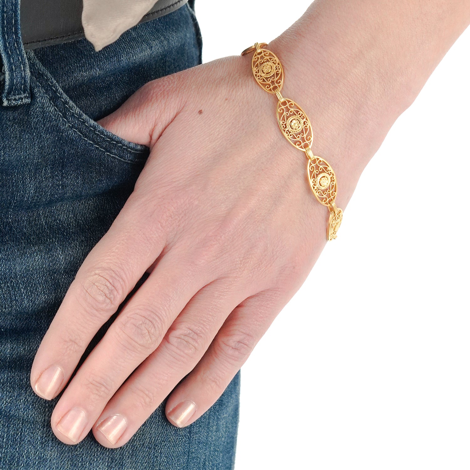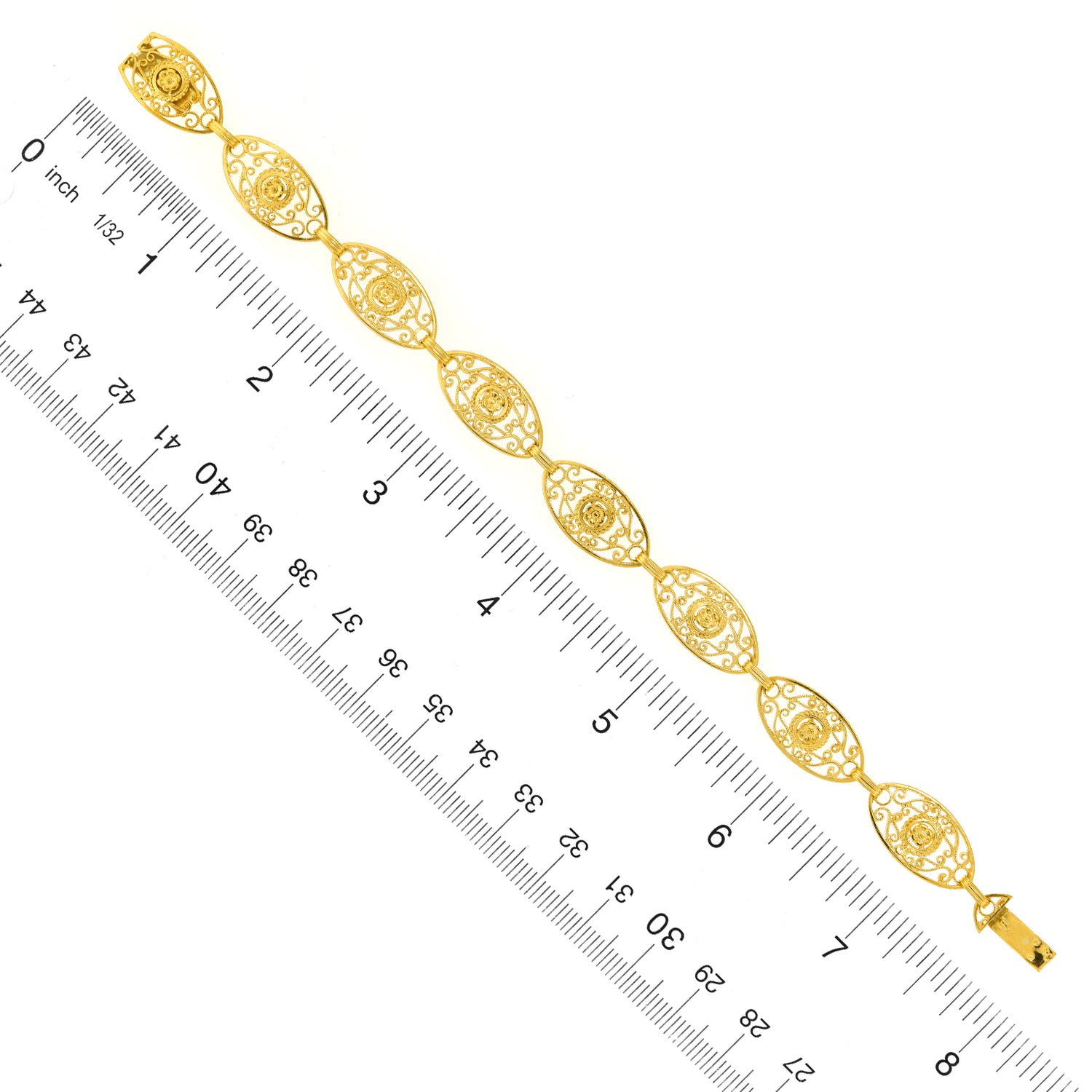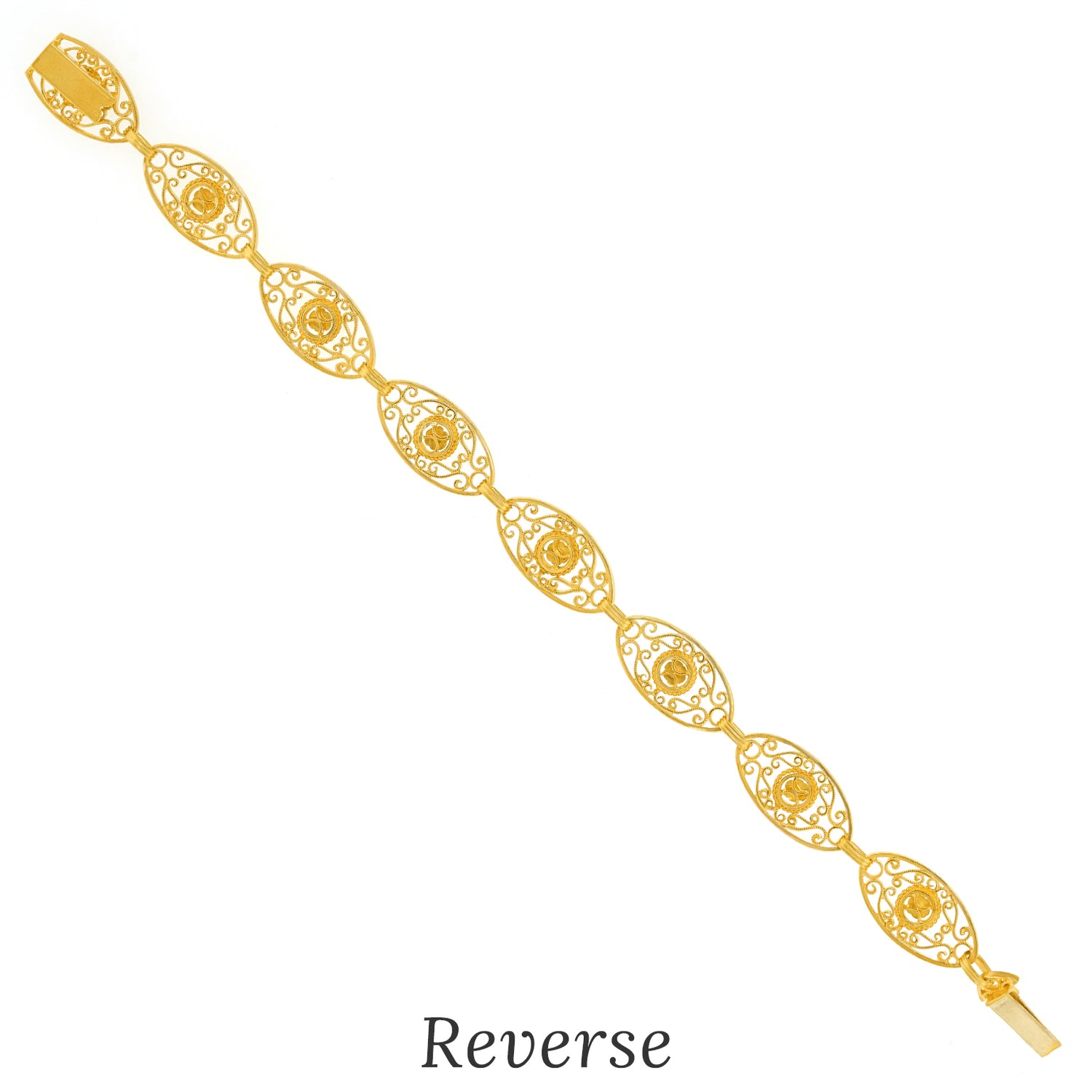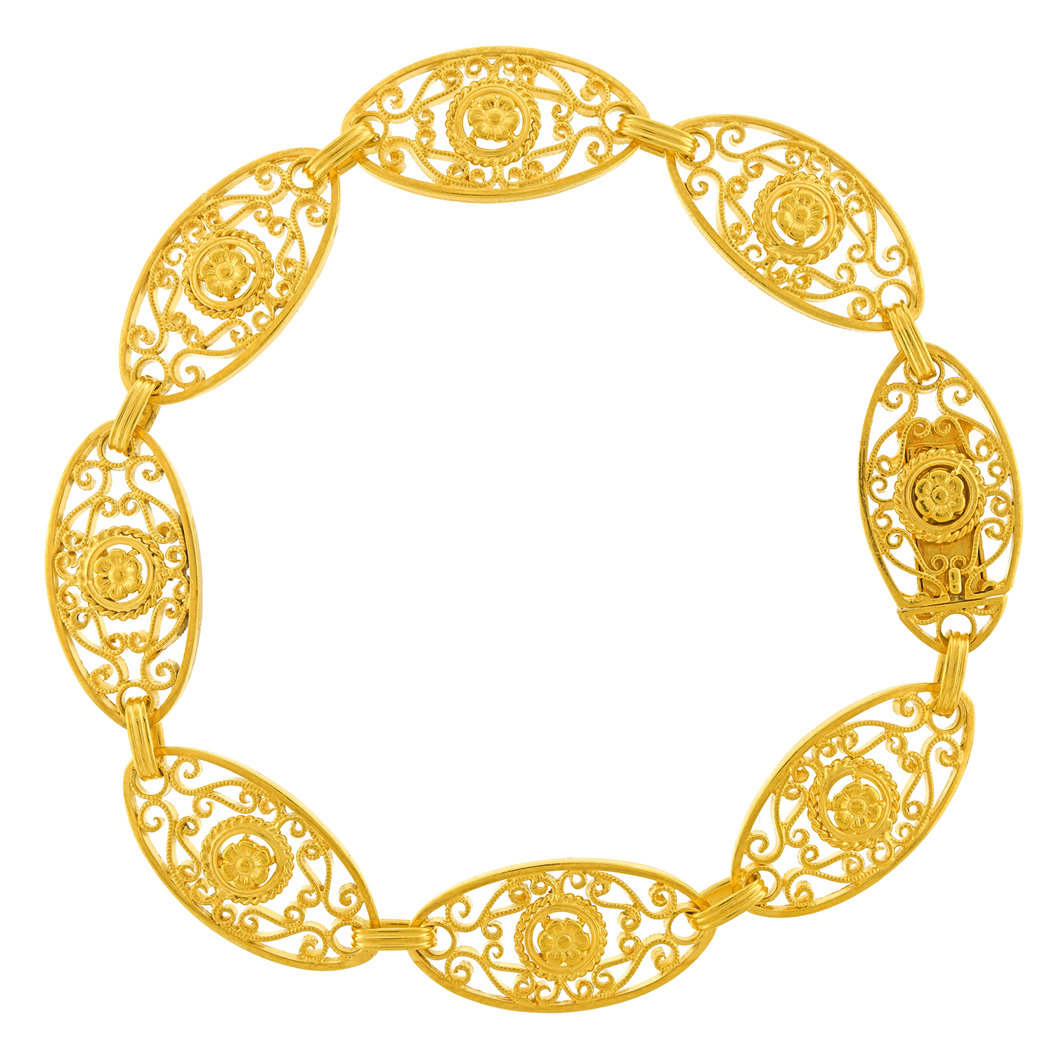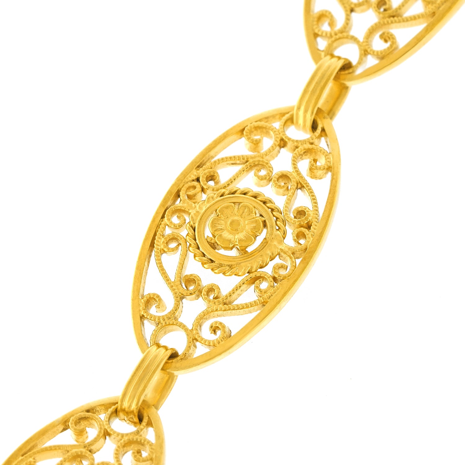 Circa 1880s, 18k, France. This antique bracelet features handmade 18k yellow gold filigree flower motif links. Dressed up or down, the look is Gallic Town and Country at its most Parisian chic. Excellent condition.