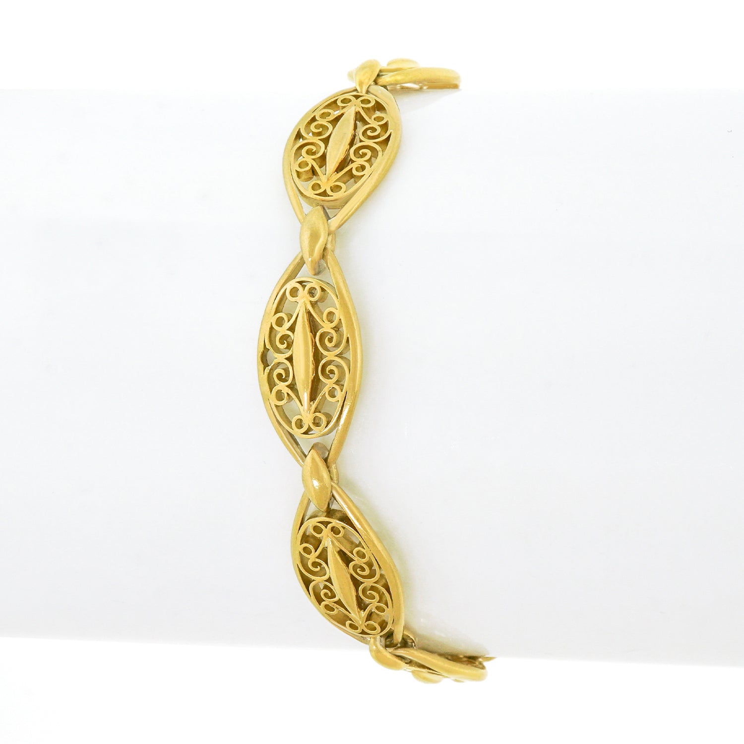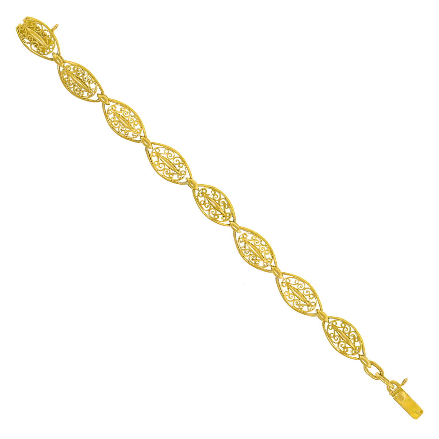 Circa 1880s, 18k, France. This antique French bracelet features stylish handmade filigree elements. Dressed up or down, the look is Gallic Town and Country at its most vintage chic. A versatile accessory, it is perfect on its own, with a watch, or a stack of bracelets. Excellent condition.