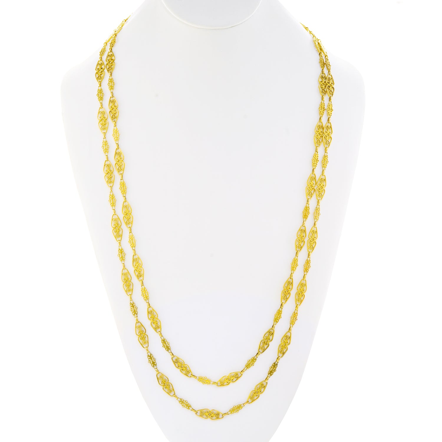 Circa 1880s, 18k, France. This 60-inch-long antique French filigree necklace features stylish handmade filigree elements. Dressed up or down, the look is Gallic Town and Country chic. A very versatile accessory (think multiples), it can be worn long, wrapped once or twice, and/or layered with pearls or other necklaces. Excellent condition.