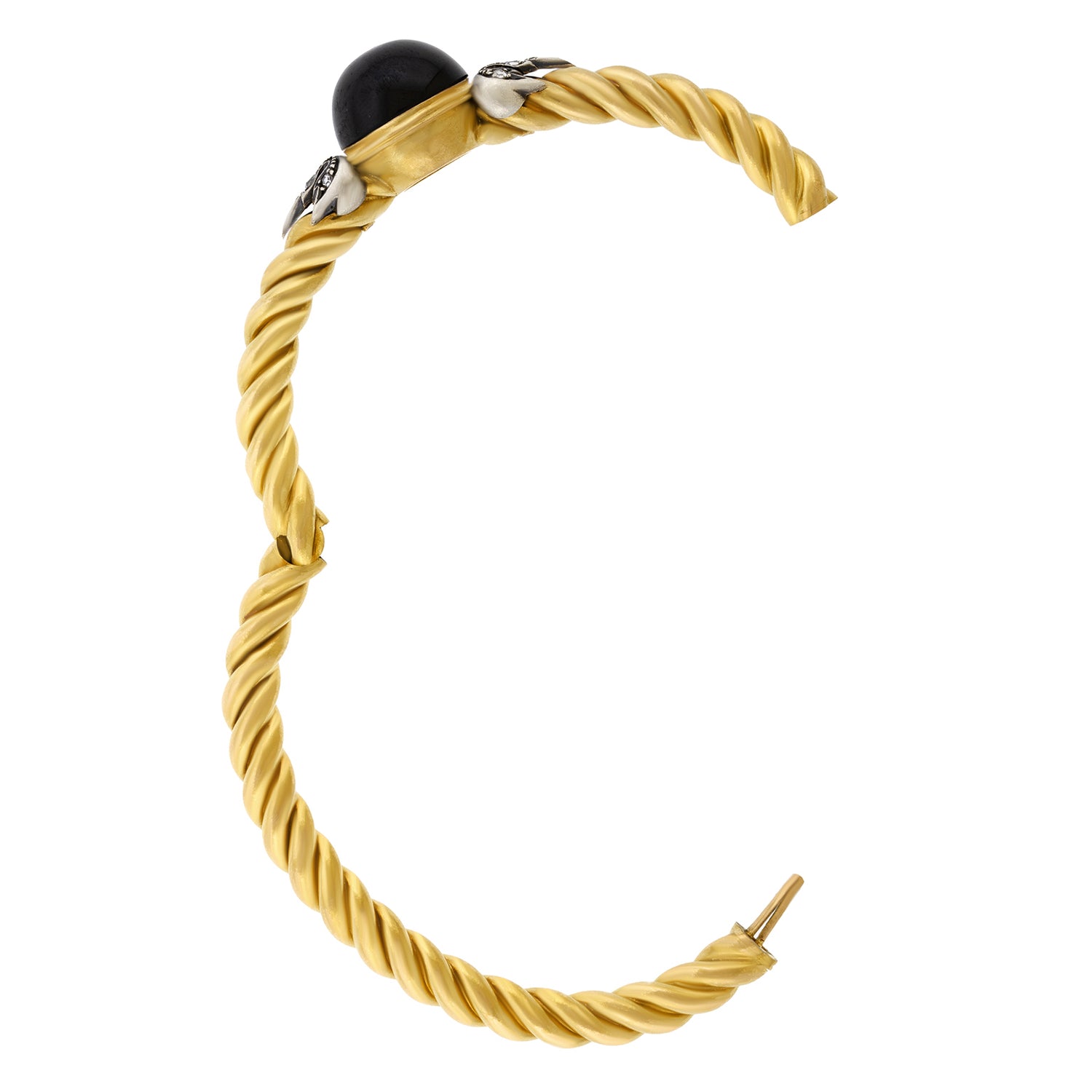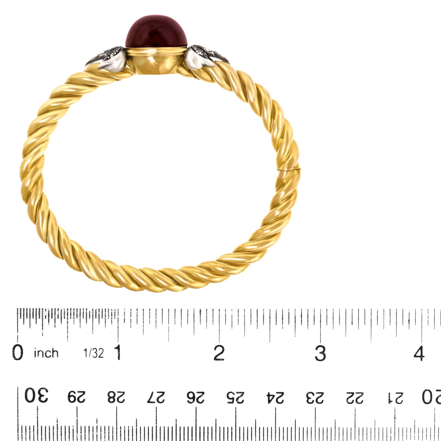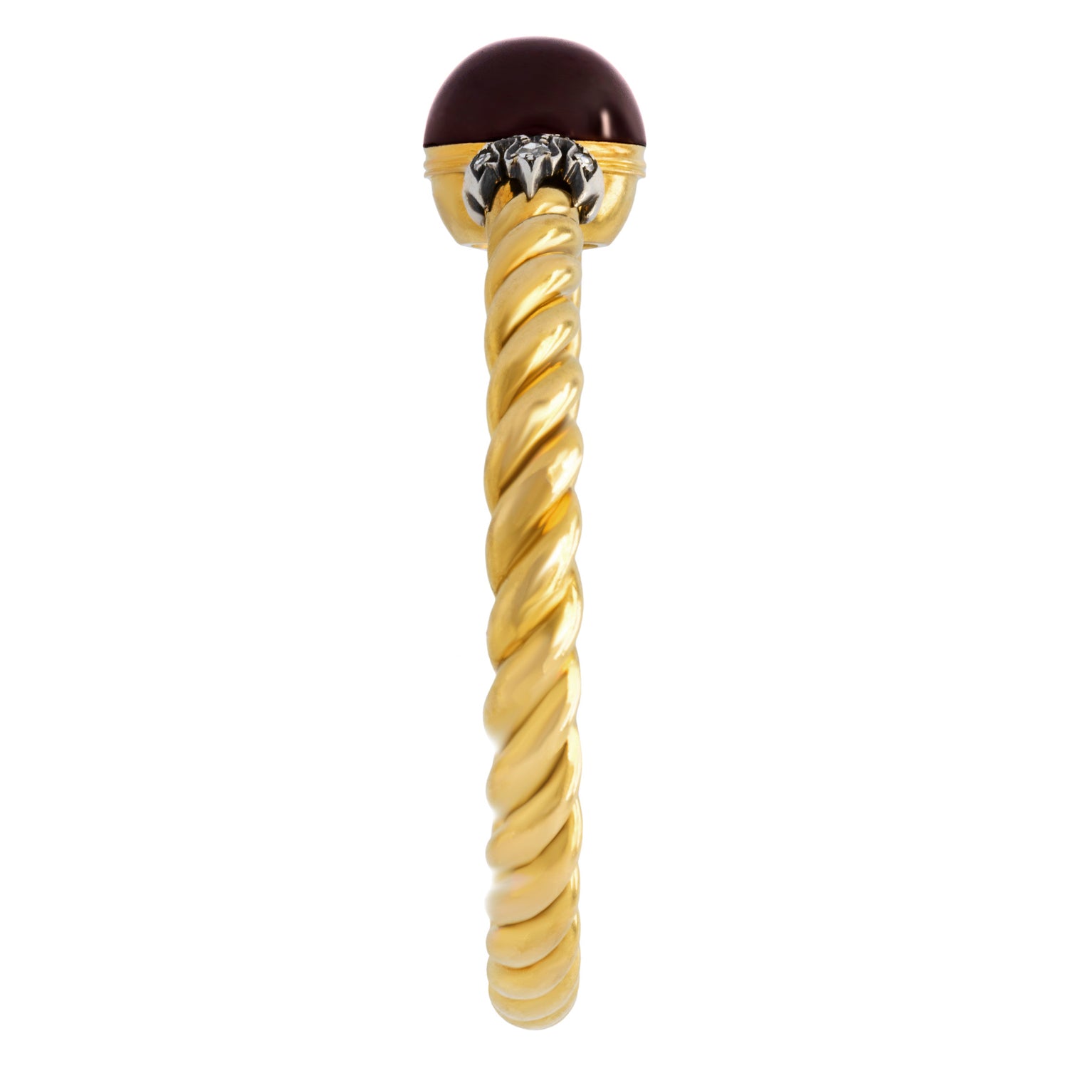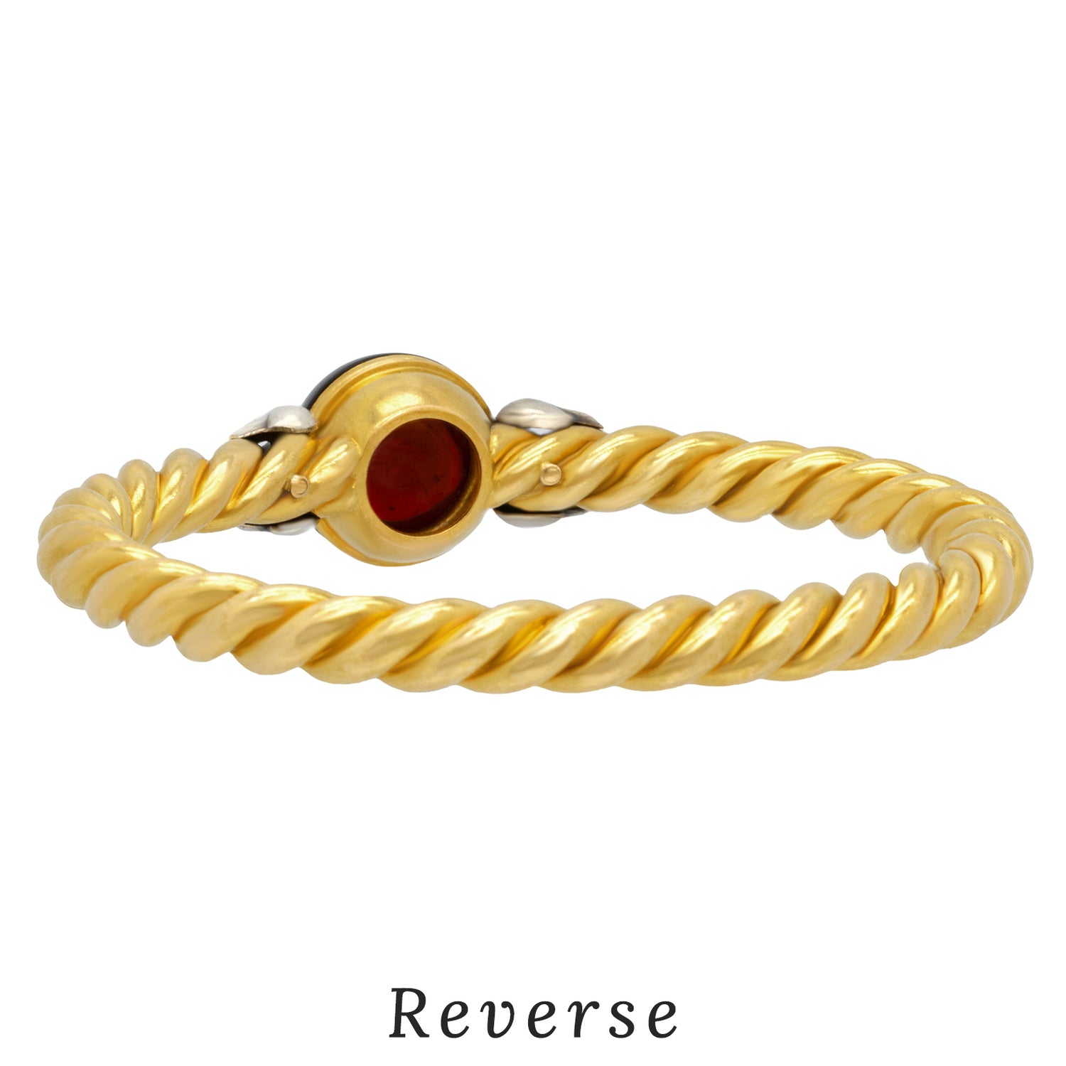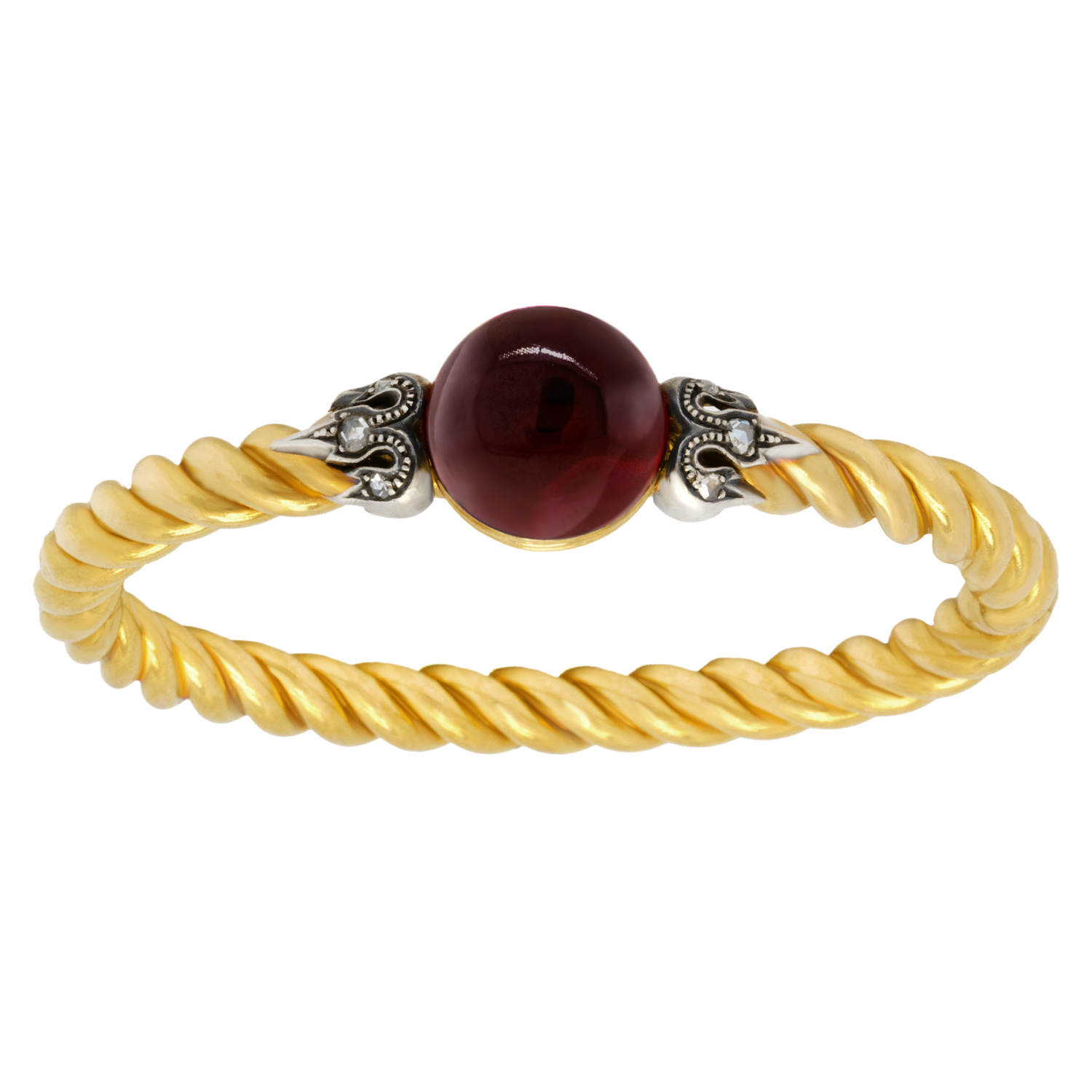 Remarks from Lawrence Jeffrey: “C-A cable twist surmounted by fleur-de-lis holding a smoldering garnet carbuncle… Perfection.”