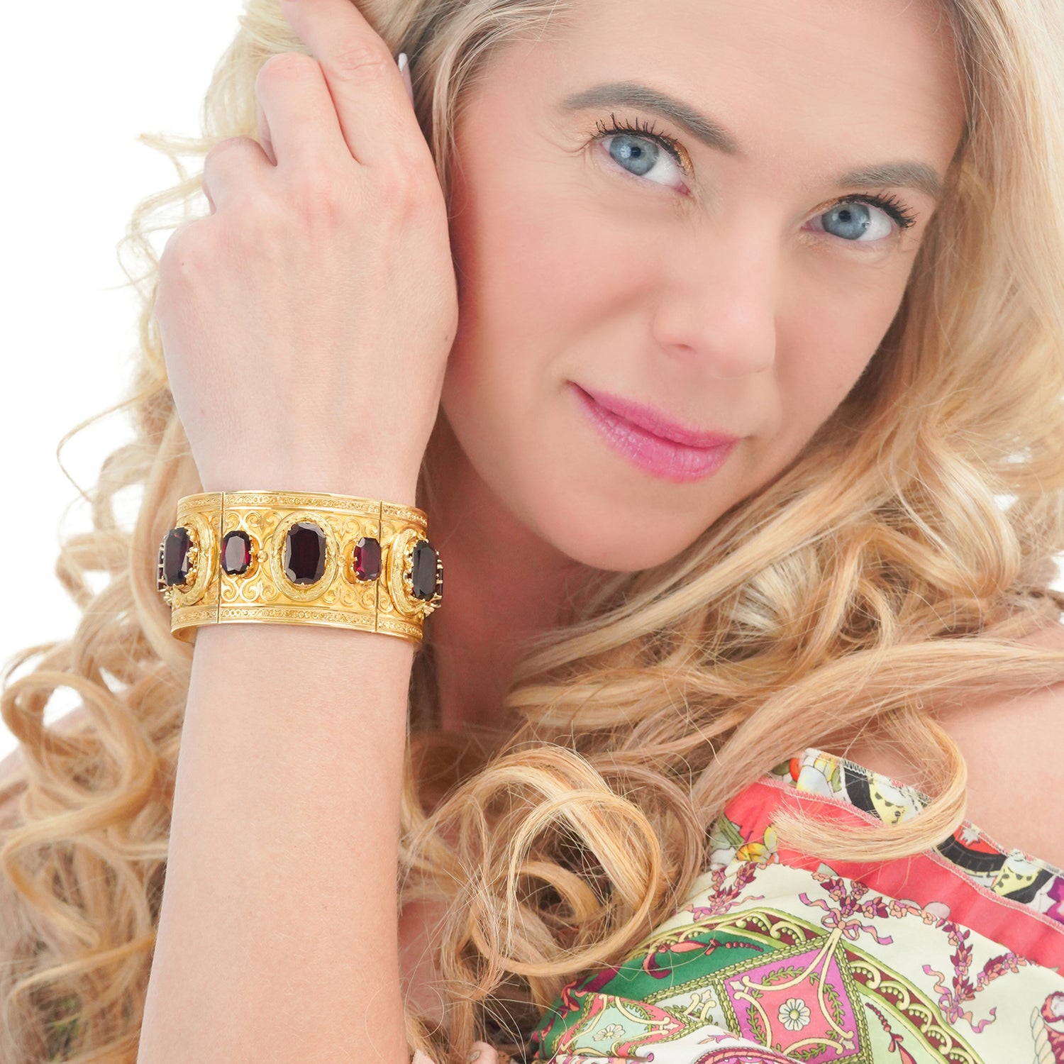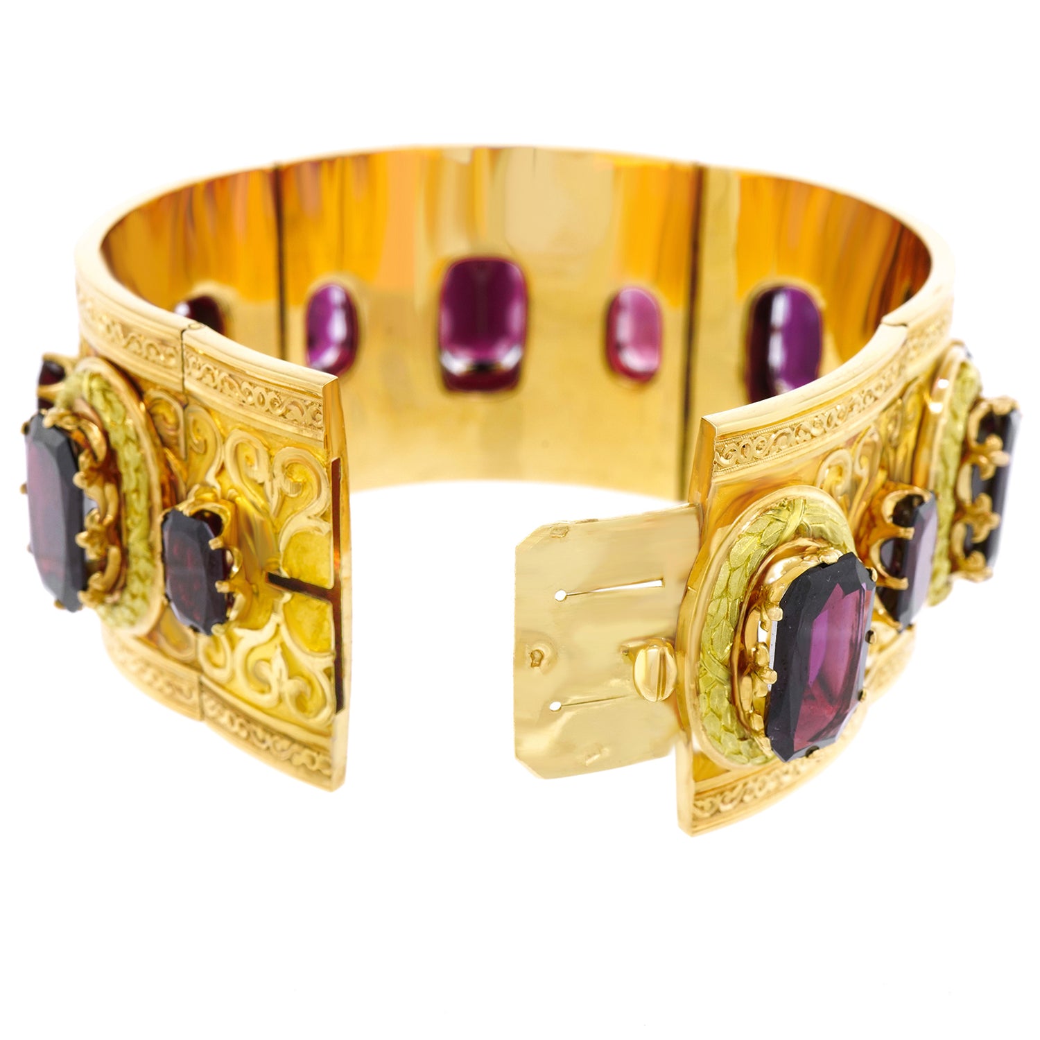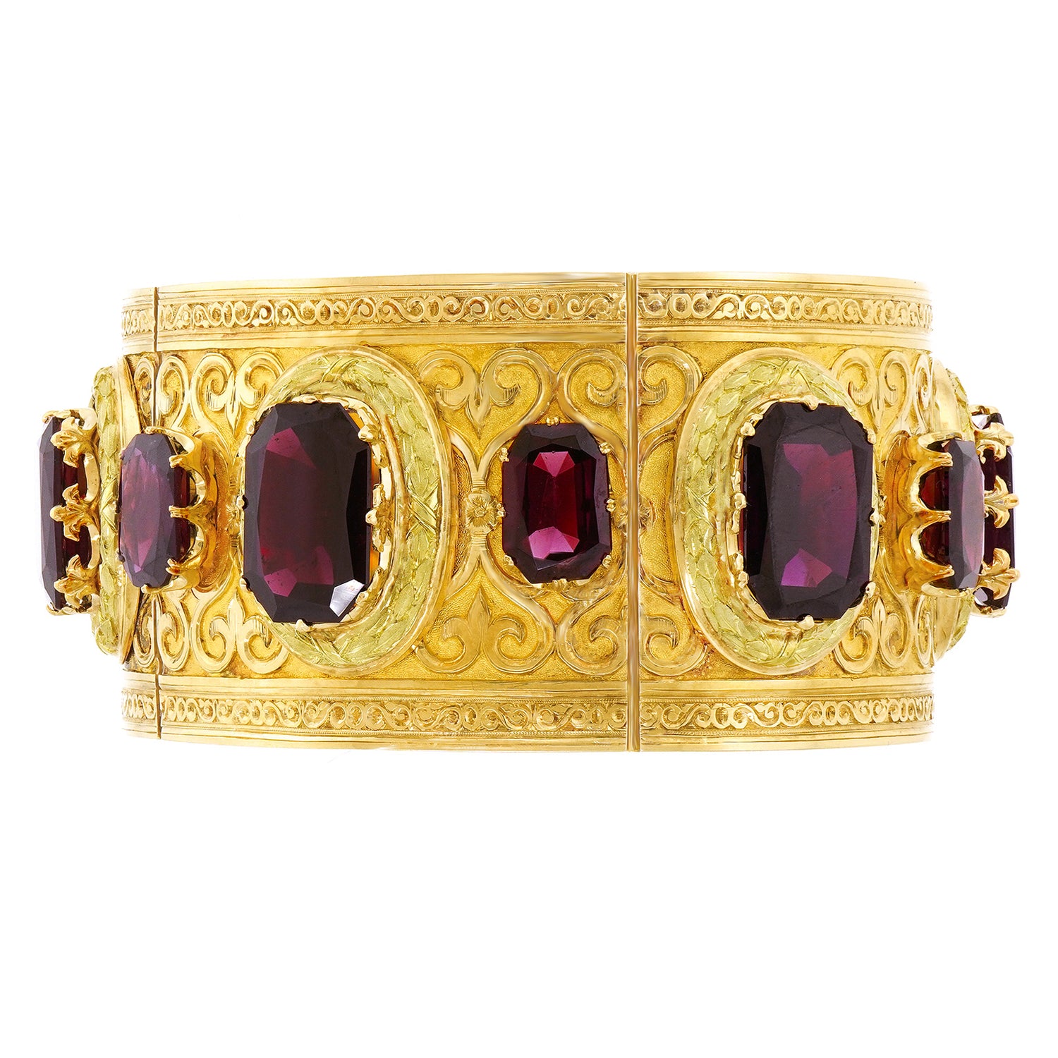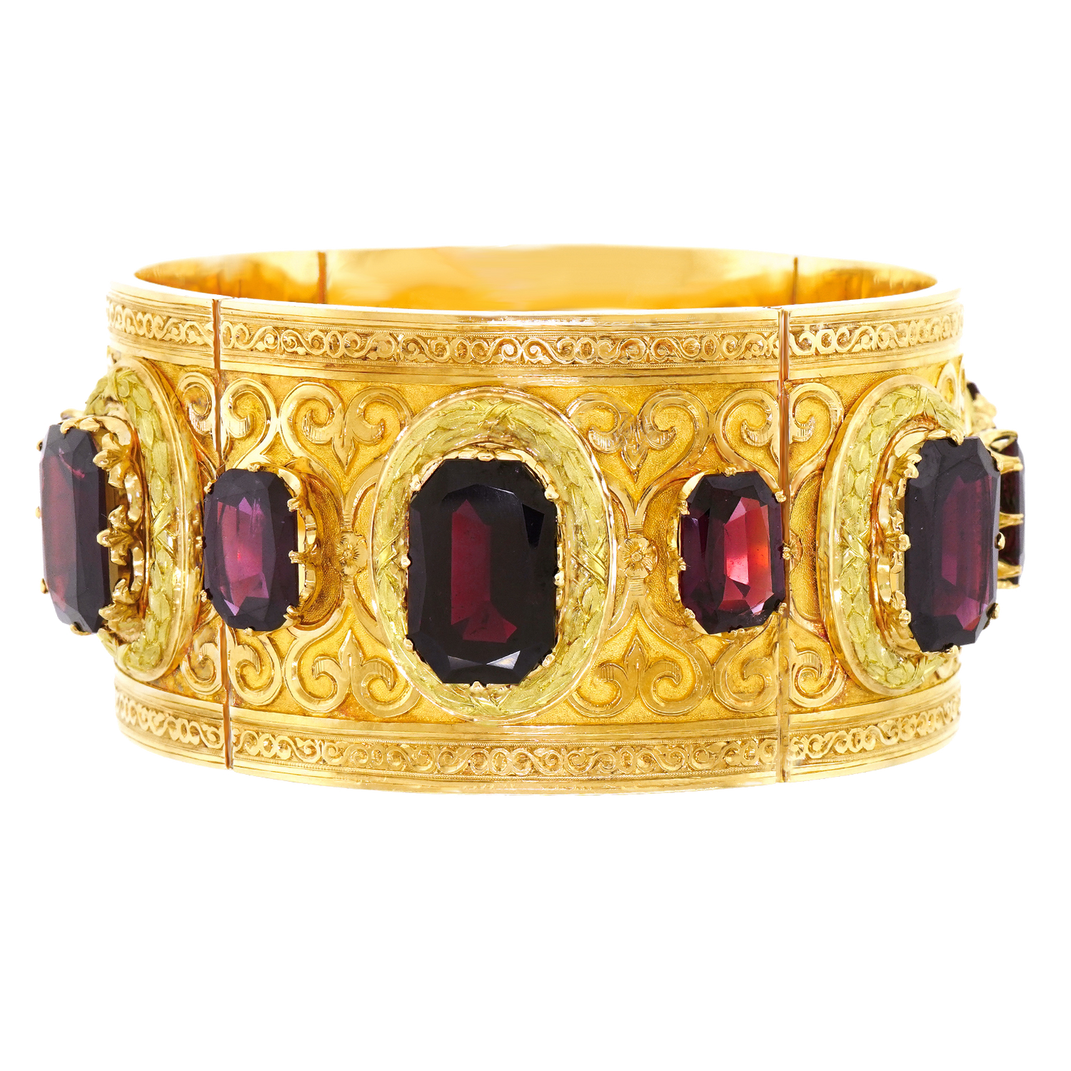 Circa 1880s, 18k, France. This stunning revivalist aesthetic bracelet is a visual tour de force! Featuring neoclassical and renaissance motifs, it is beyond stylish, meticulously well made, and set with superb garnets that catch the light and glow like smoldering embers. Authenticity is true style. Wearing a period Victorian bracelet makes the visual moment.  Excellent condition.