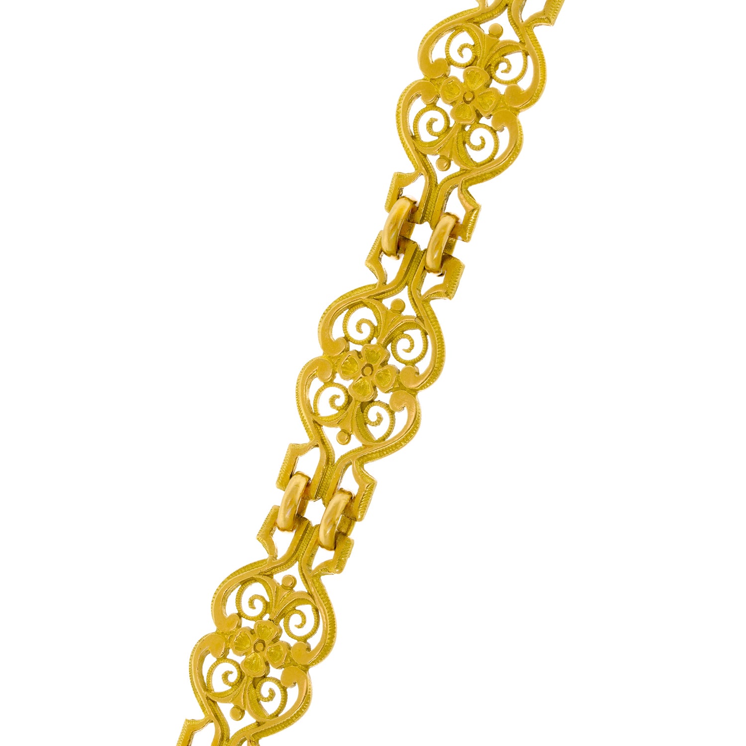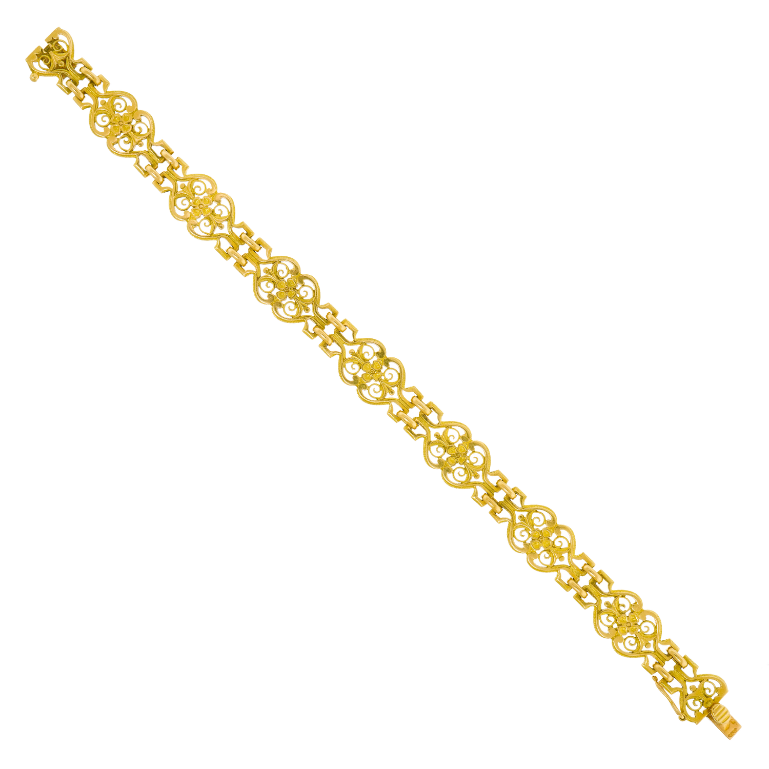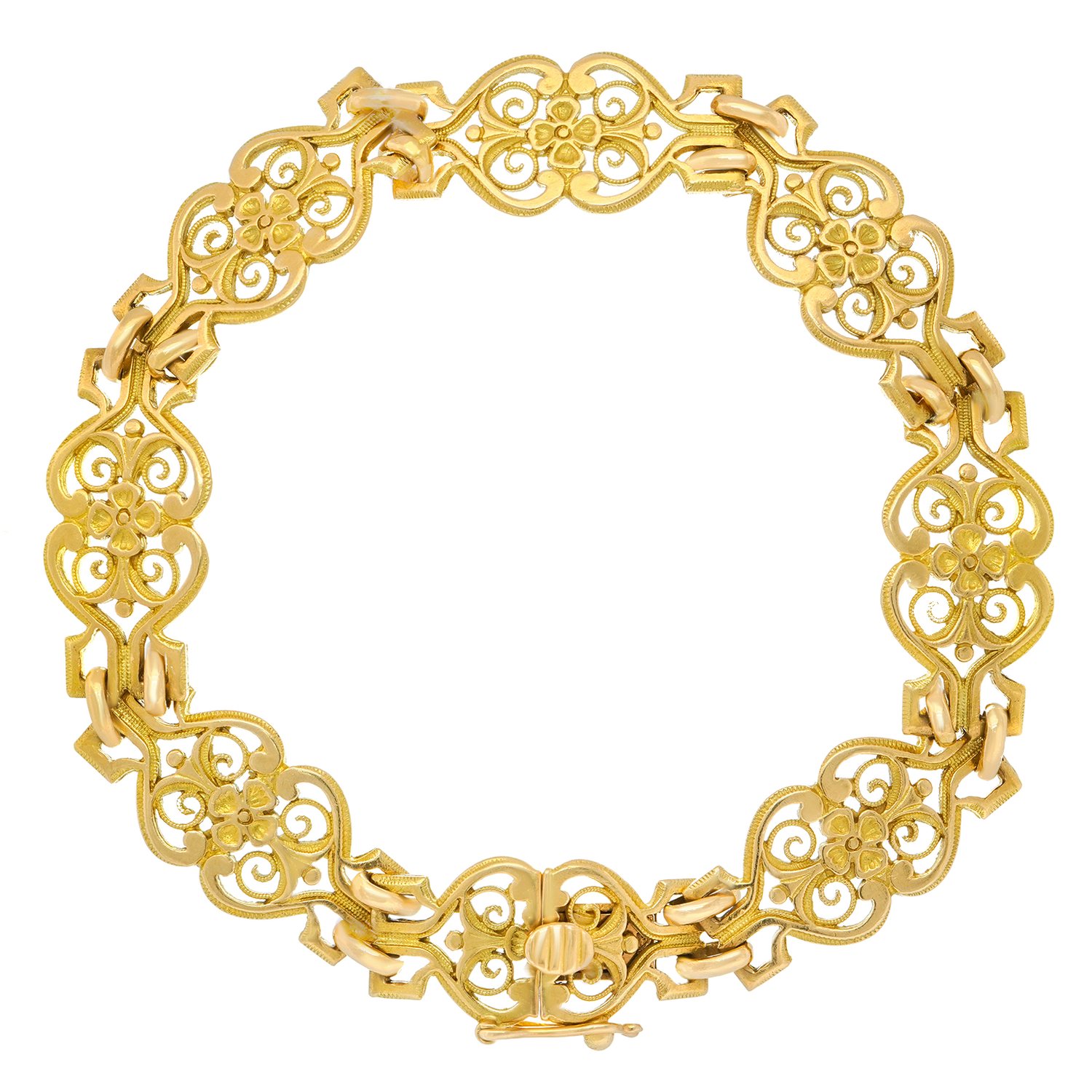 Circa 1880s, 18k, France.  This antique French bracelet features stylish handmade filigree elements. Dressed up or down, the look is Gallic Town and Country at its most vintage chic. A versatile accessory, it is perfect on its own, with a watch, or a stack of bracelets. Excellent condition