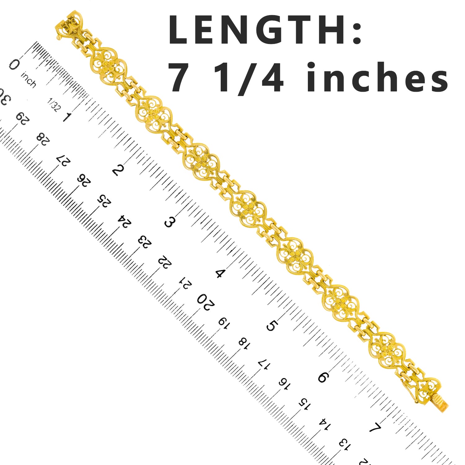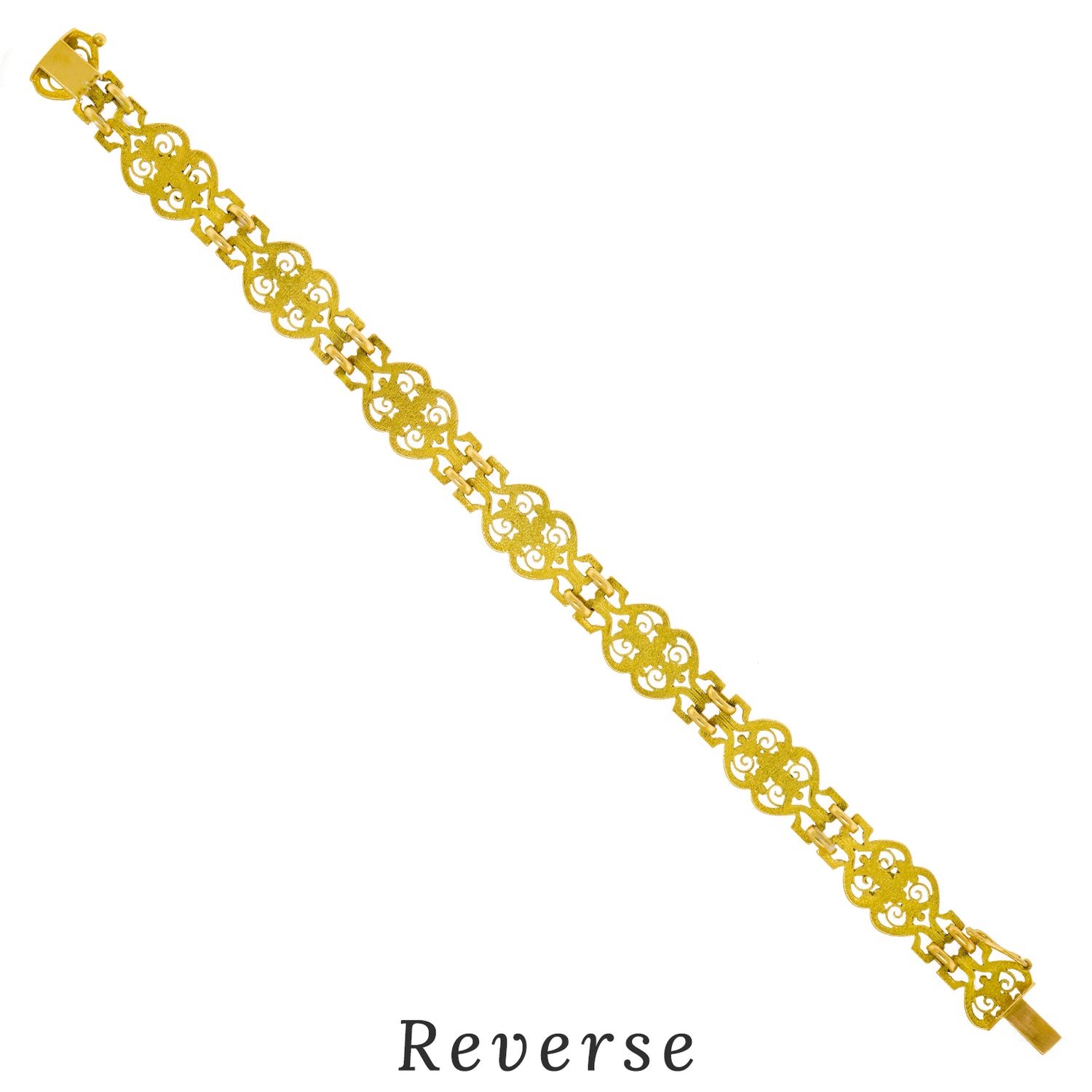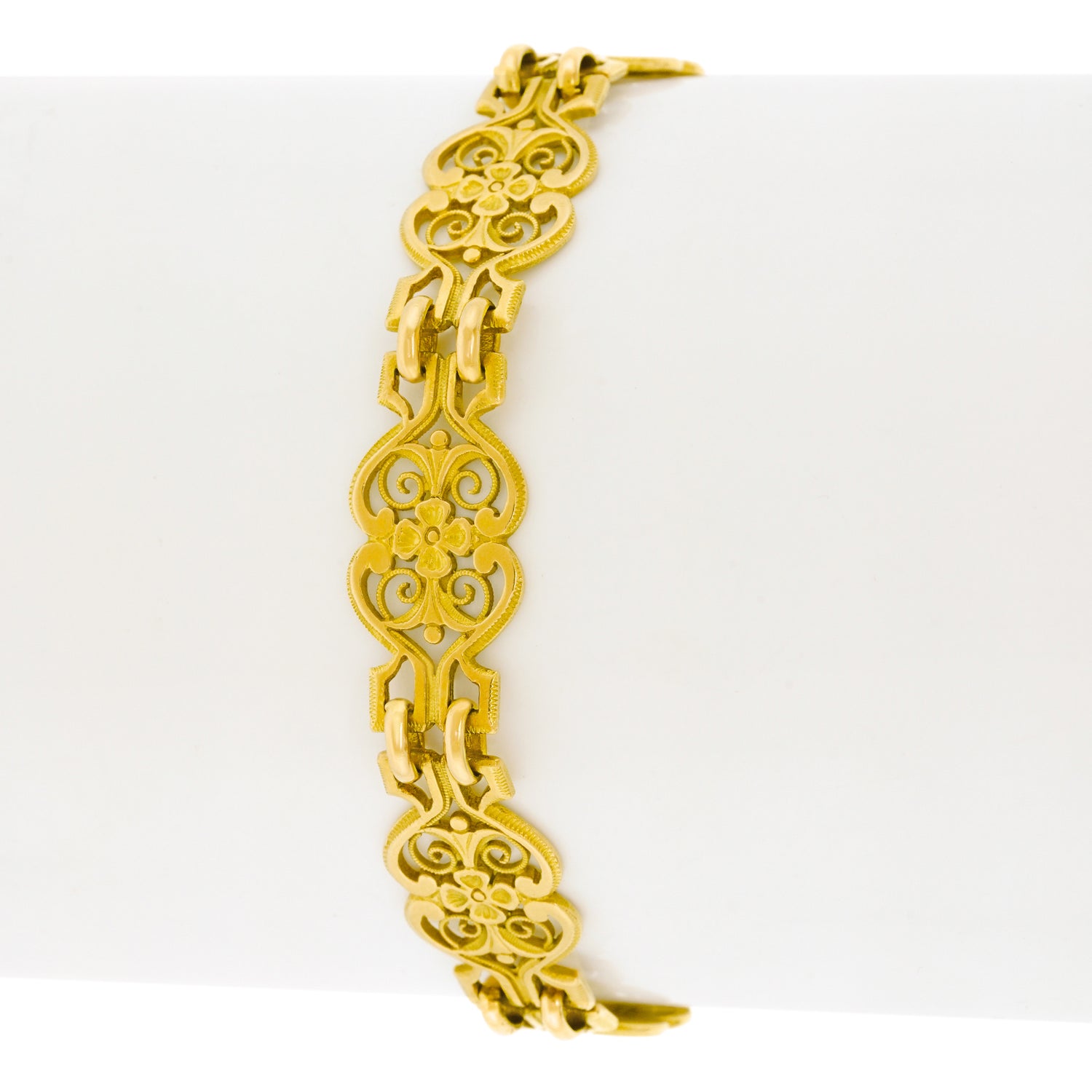 Circa 1880s, 18k, France.  This antique French bracelet features stylish handmade filigree elements. Dressed up or down, the look is Gallic Town and Country at its most vintage chic. A versatile accessory, it is perfect on its own, with a watch, or a stack of bracelets. Excellent condition