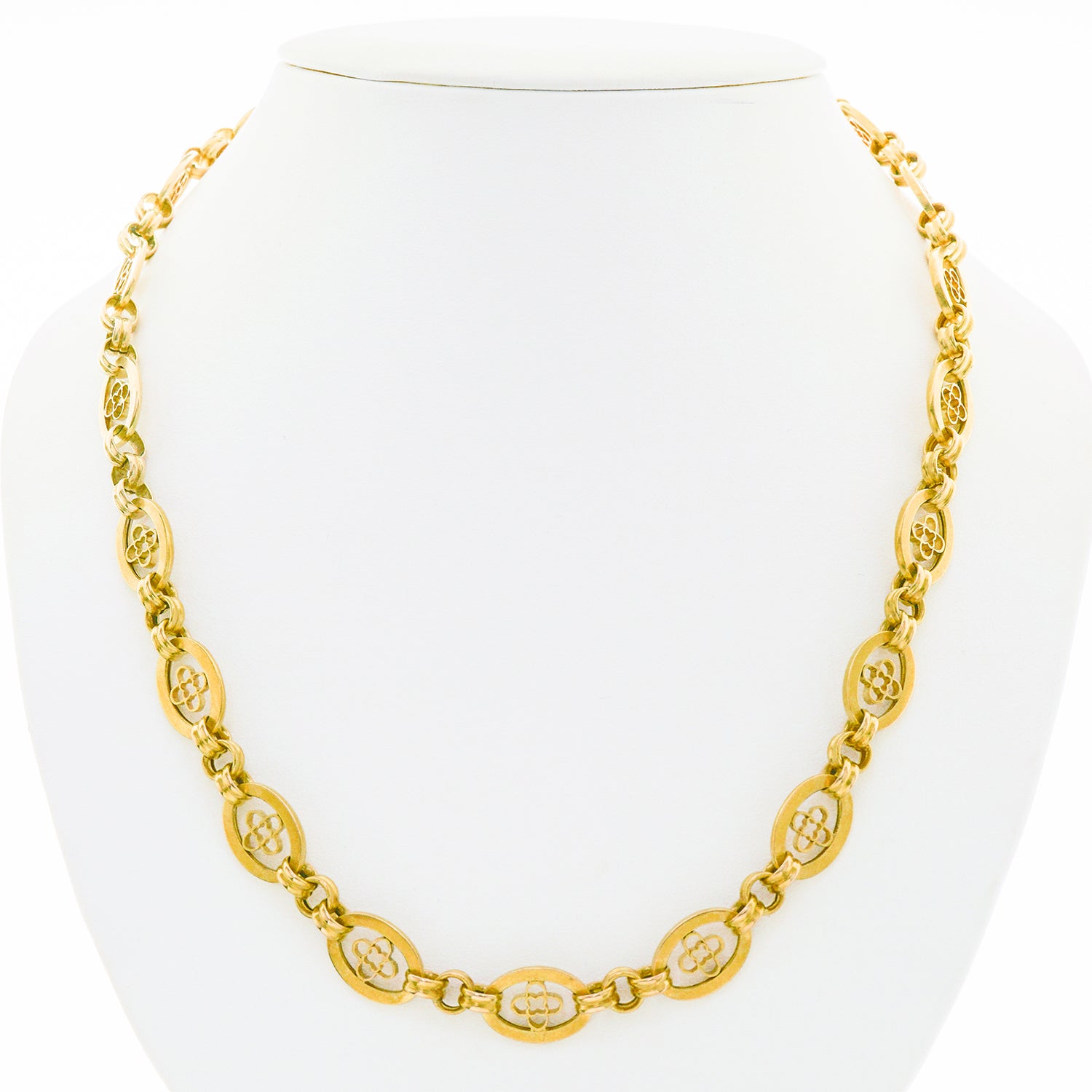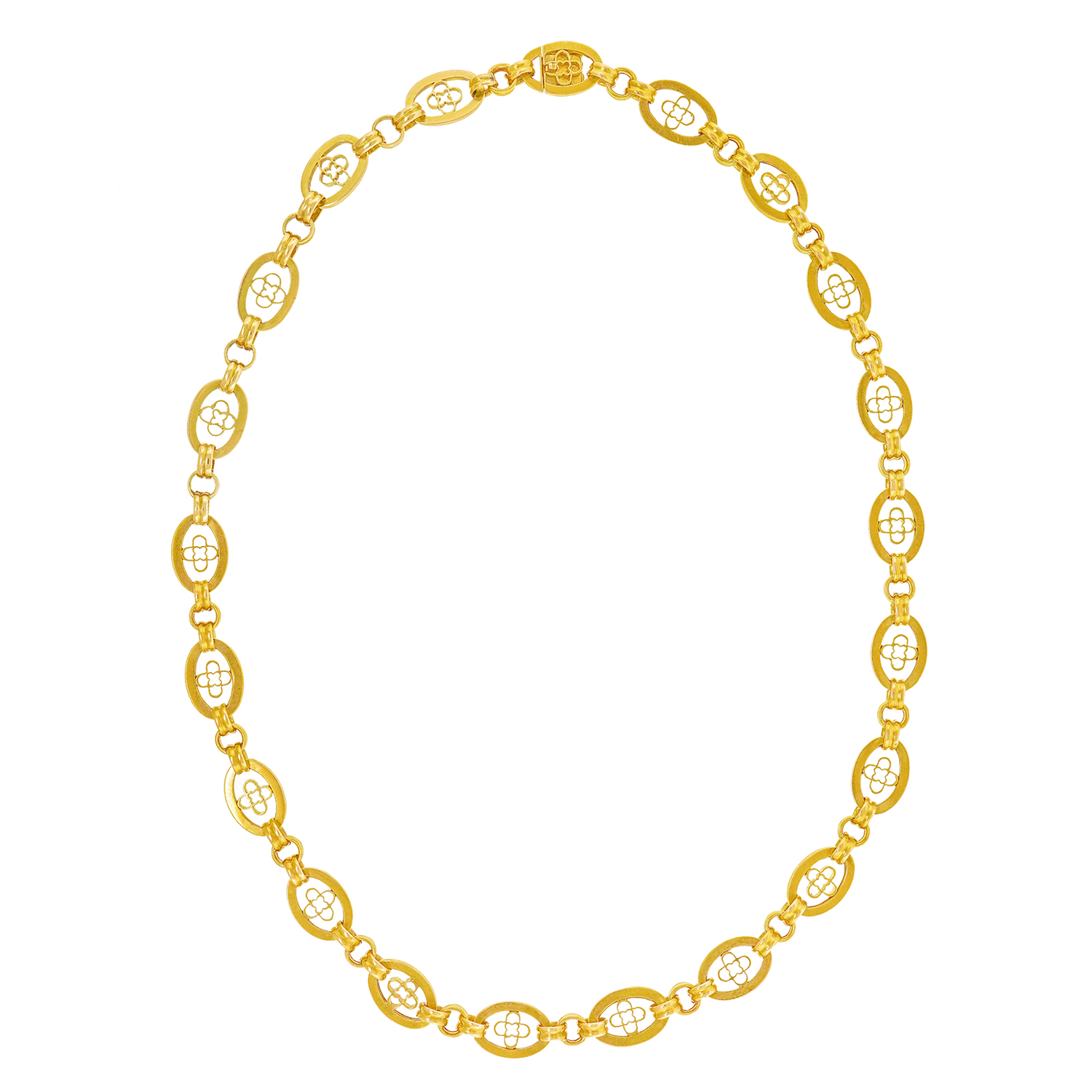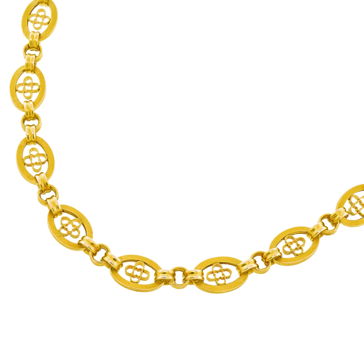 Circa 1905, 18k, French.  Featuring fine detail and superb construction, this antique French necklace has a stylish town and country look. The oval links are generously sized and completely handmade. Featuring an Alhambra inside a quatrefoil motif, the 21-inch length is perfect for any moment of fashion. Excellent condition.