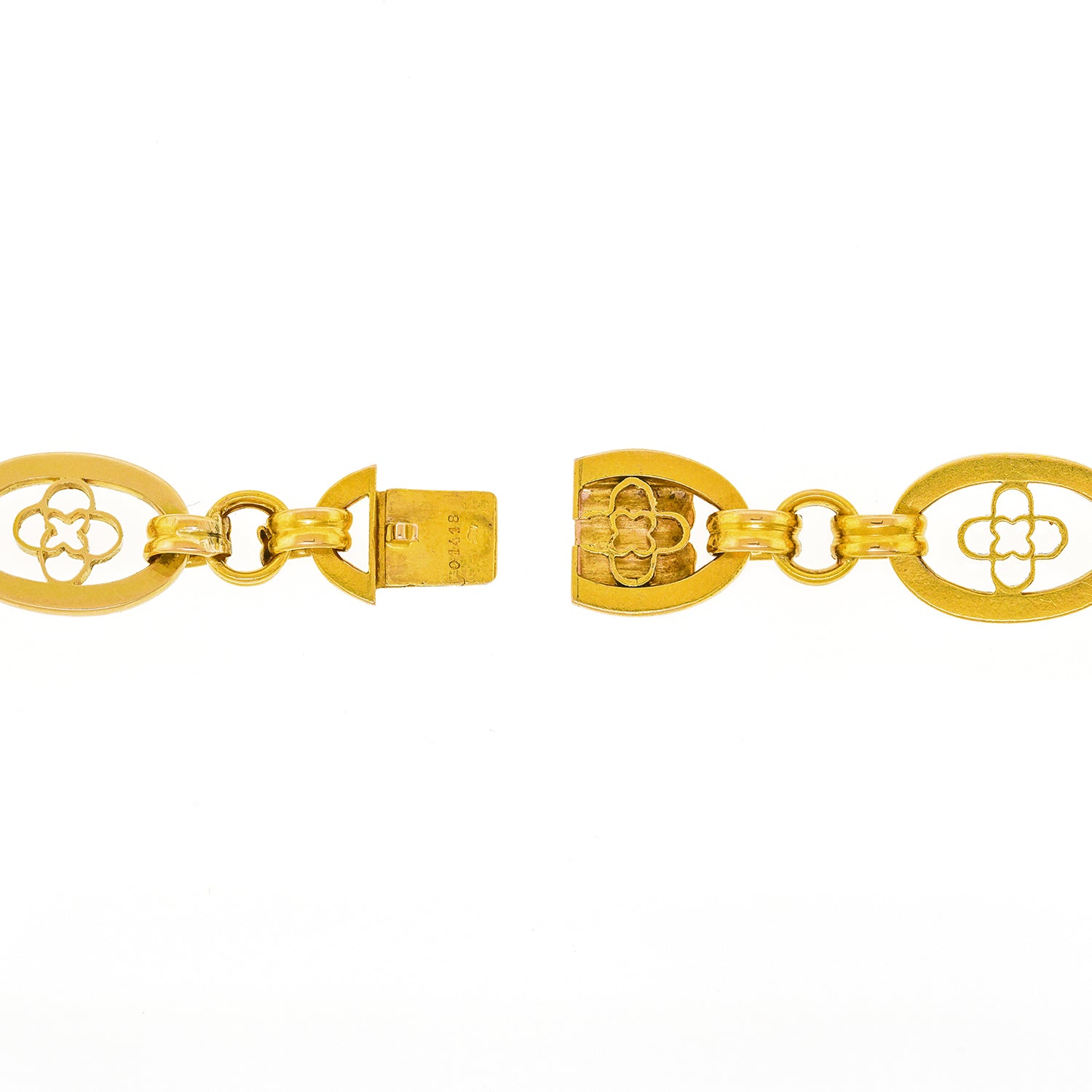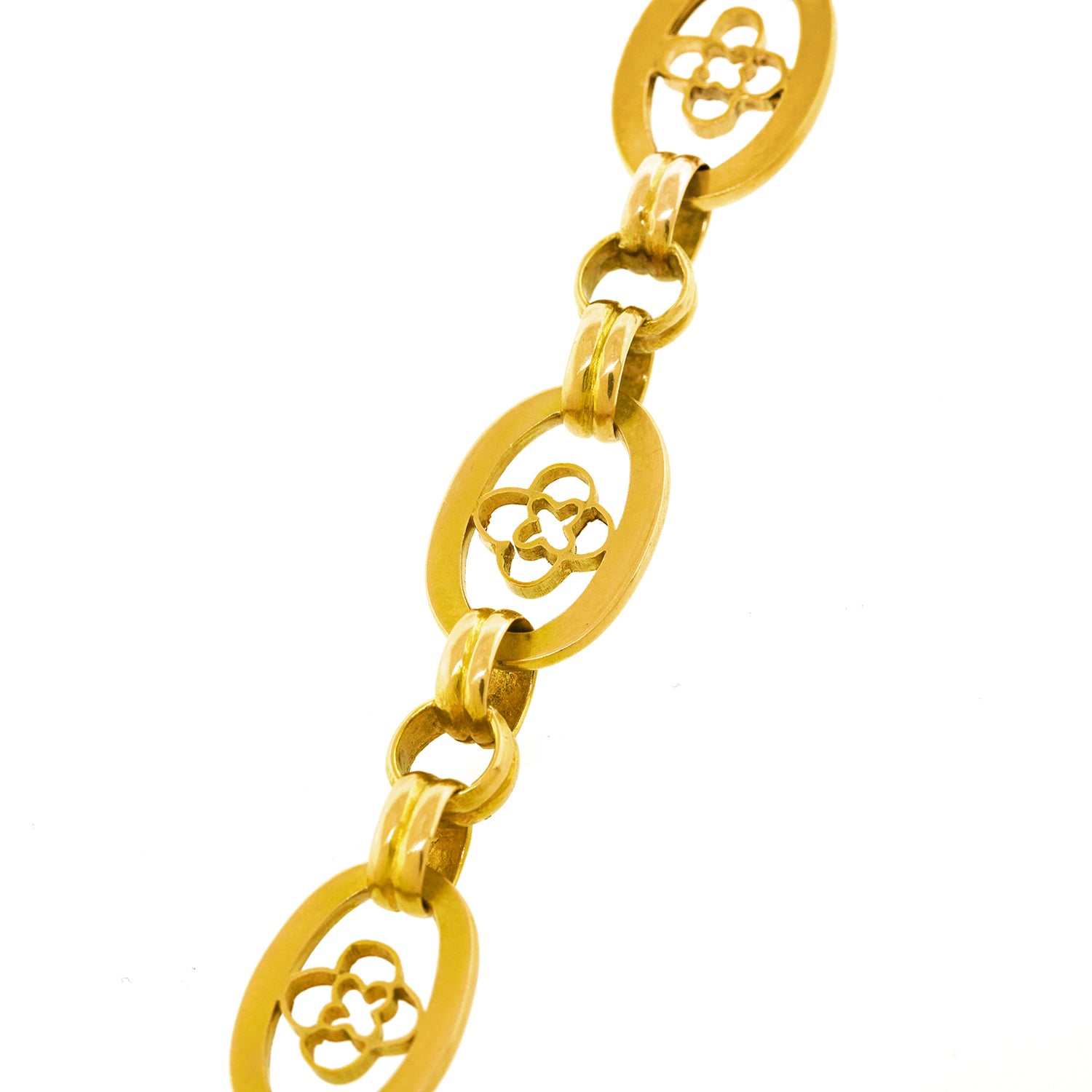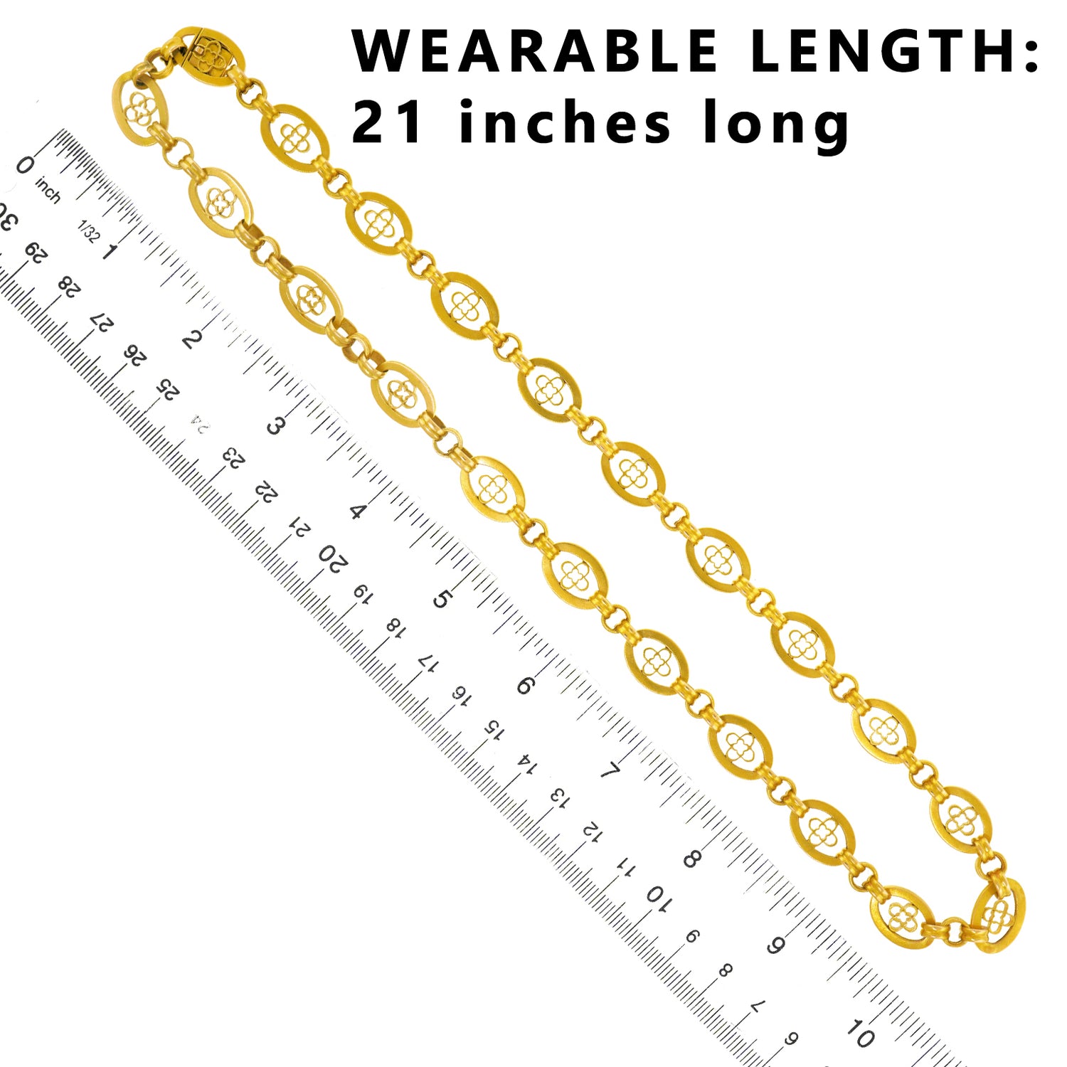 Circa 1905, 18k, French.  Featuring fine detail and superb construction, this antique French necklace has a stylish town and country look. The oval links are generously sized and completely handmade. Featuring an Alhambra inside a quatrefoil motif, the 21-inch length is perfect for any moment of fashion. Excellent condition.