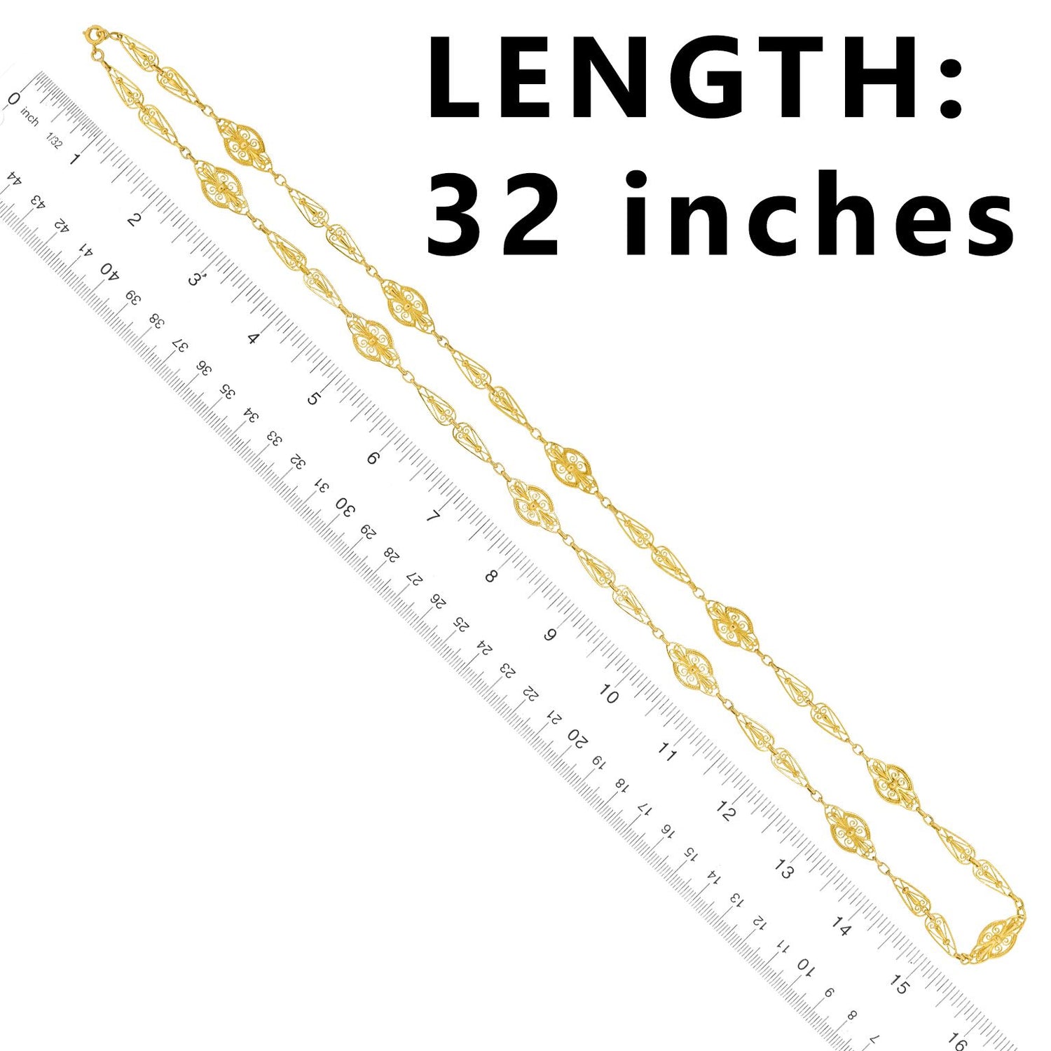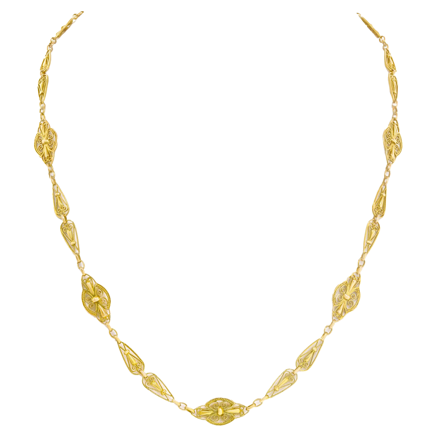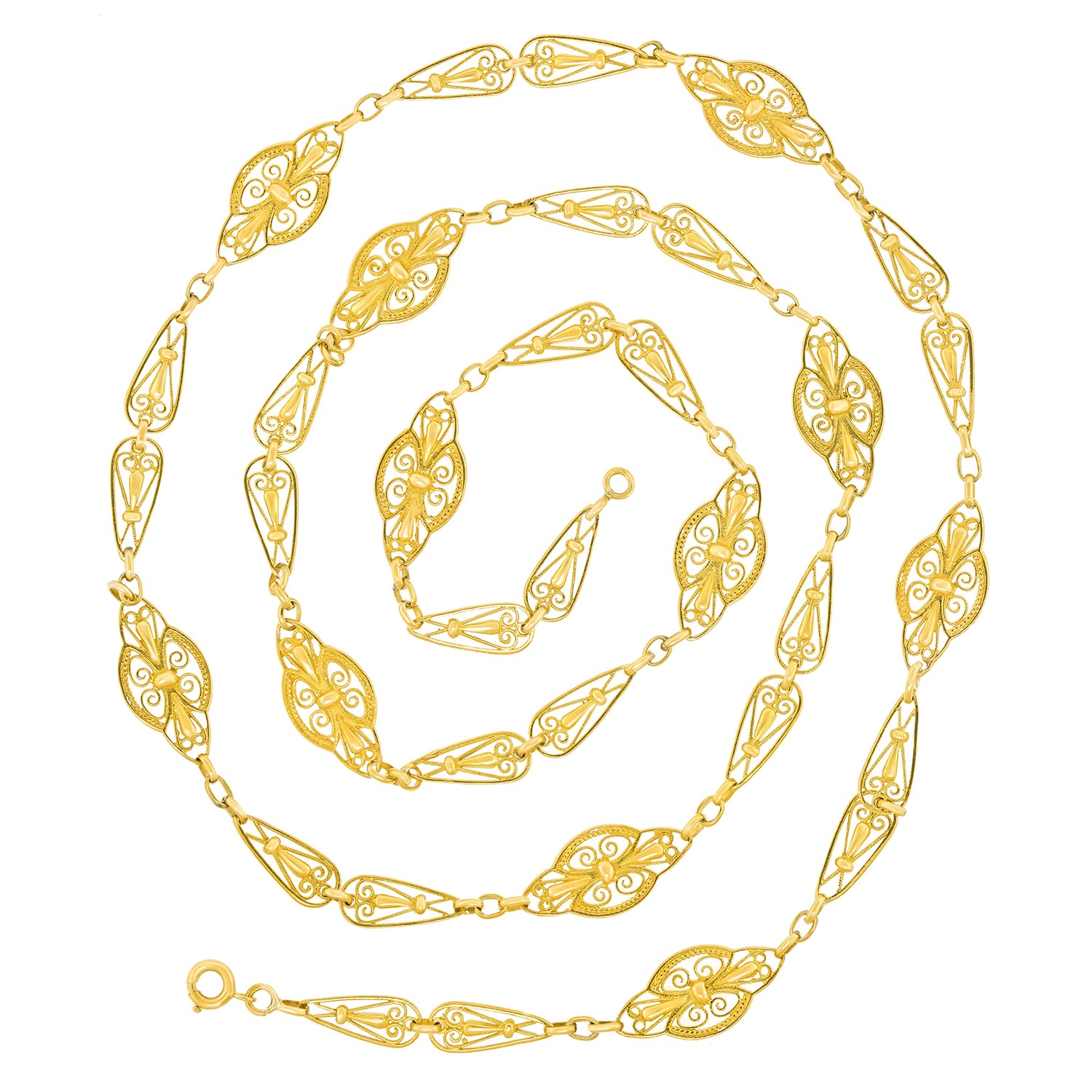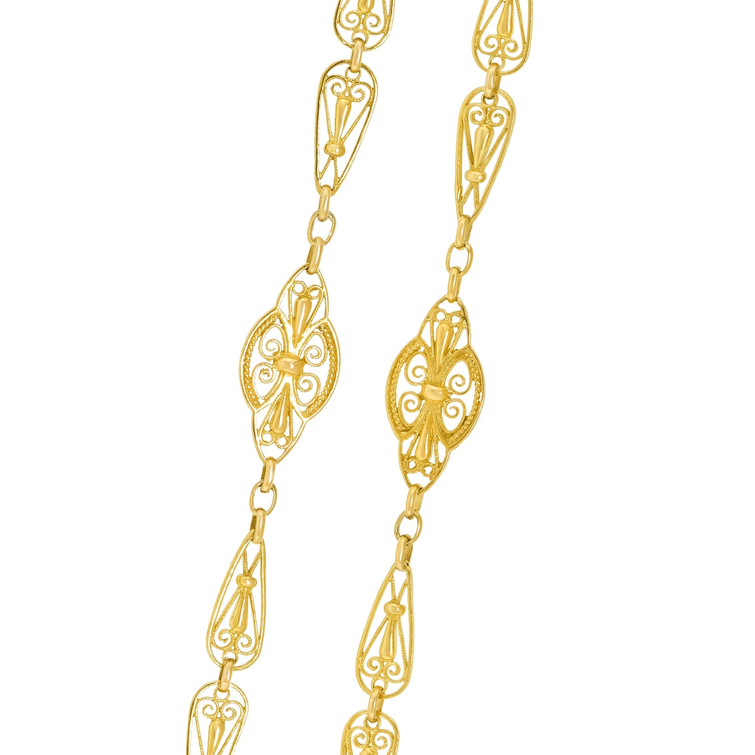 Circa 1880s, 18k, France. This 32-inch-long antique French necklace features stylish handmade filigree elements. Dressed up or down, the look is Gallic Town and Country chic at its vintage best. A very versatile accessory (think multiples), it can be layered with pearls or other necklaces. Excellent condition.