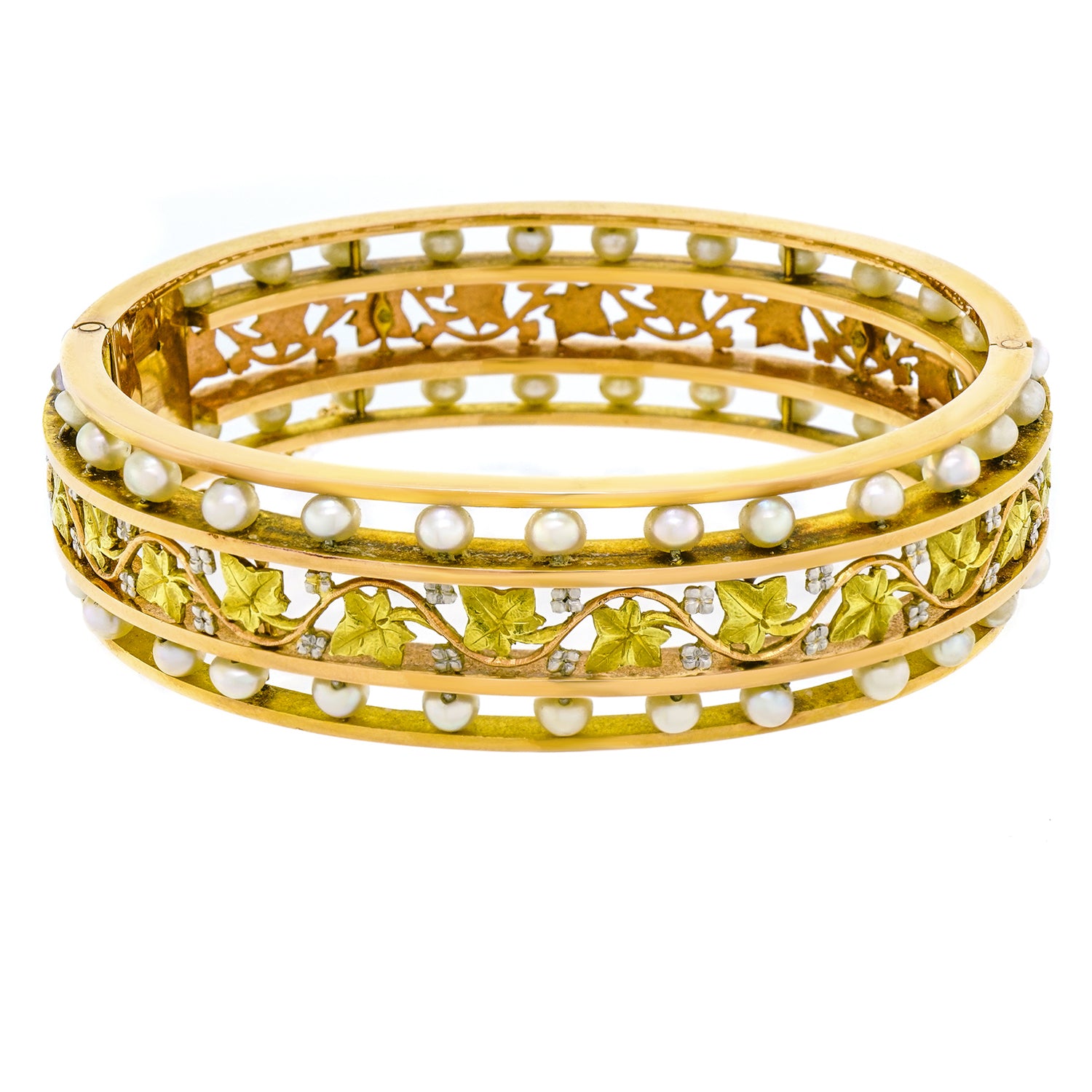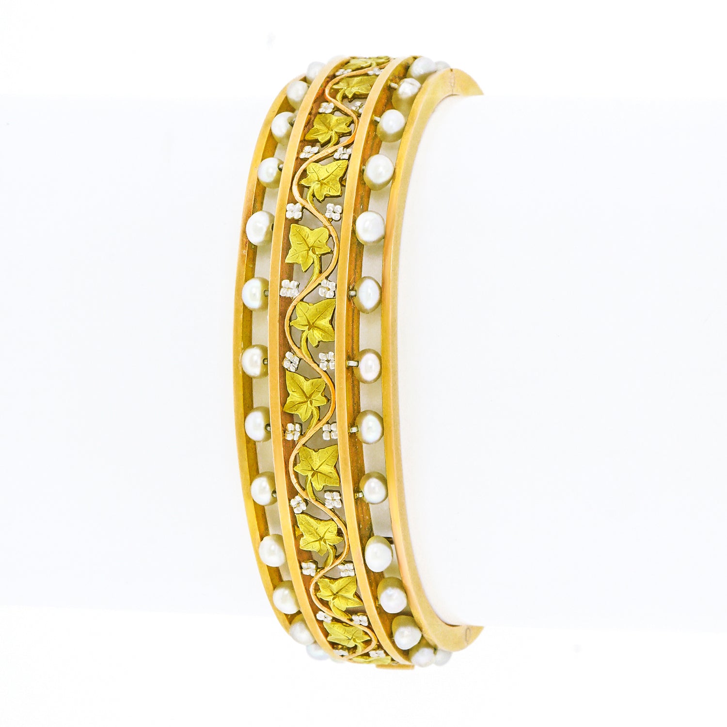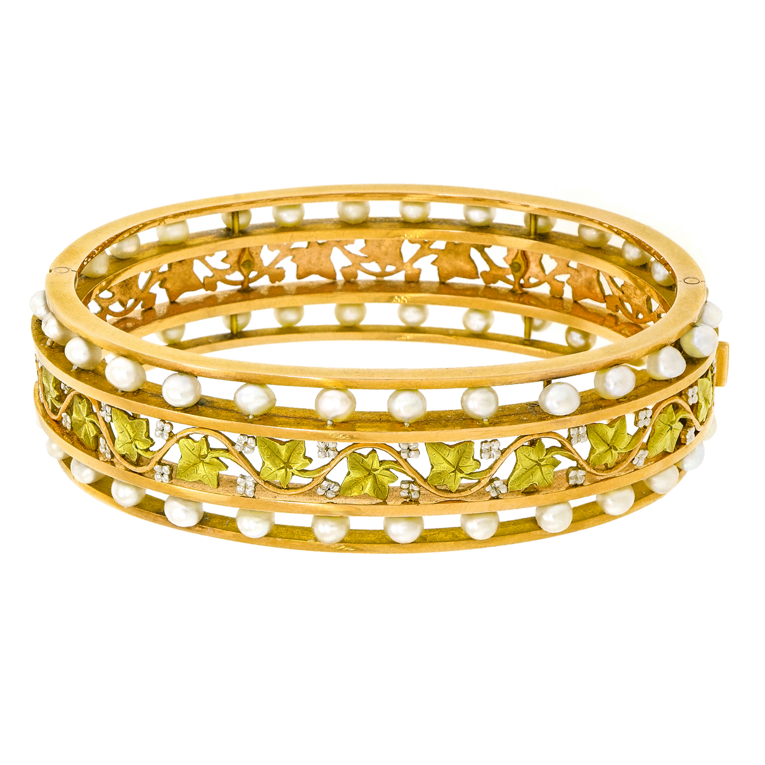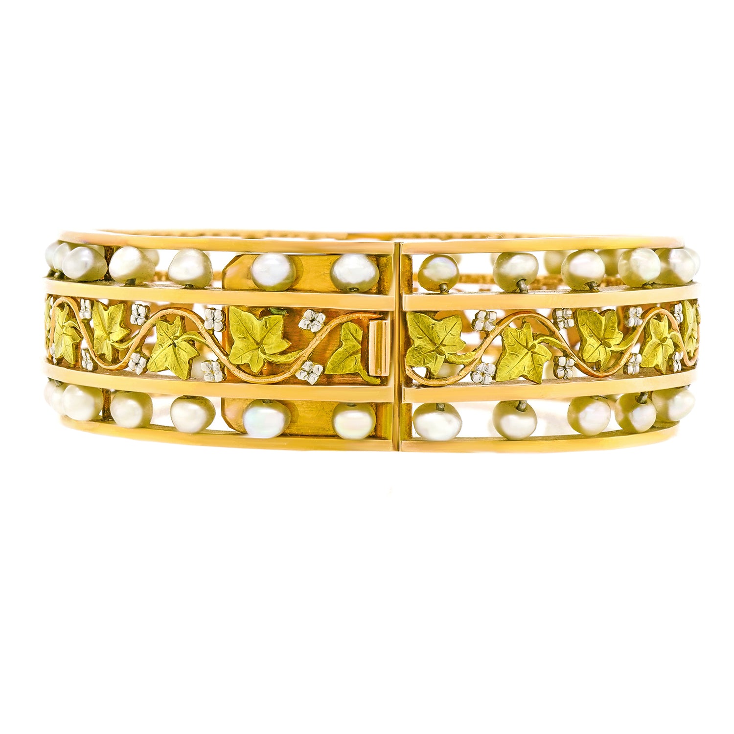 Circa 1870-80s, 18k, Paris, France. This fine antique bracelet is a gorgeous example of Parisian jewelry fashion in the late 19th century. It has it all, traditional French four-color gold, a sublime design, and a very stylish look. Vines with green leaves, white flowers, and red branches twine around the center of the bracelet, accented by two rows of lustrous natural pearls. Finely hand-made, this hinged bangle is in excellent condition.