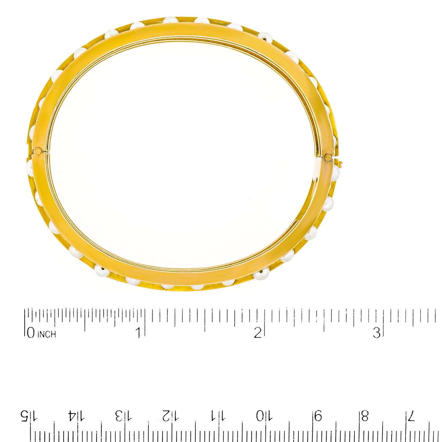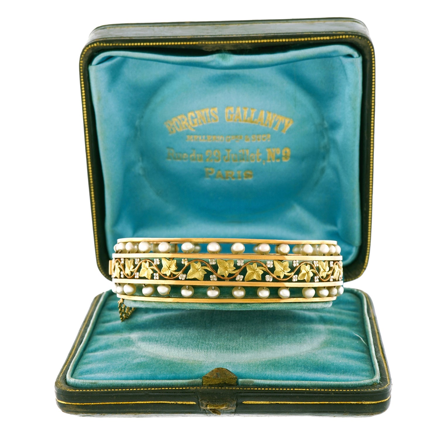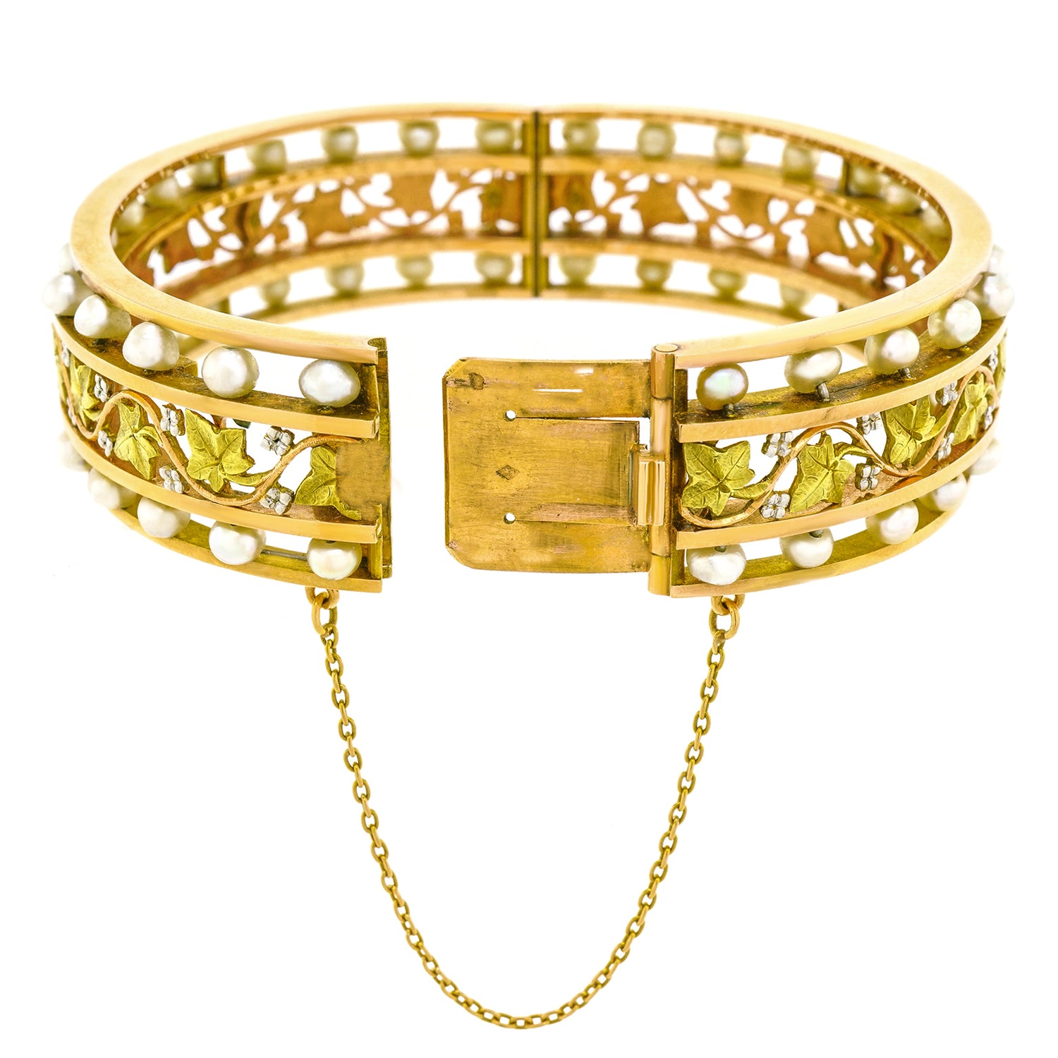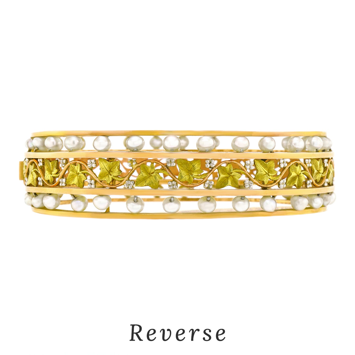Circa 1870-80s, 18k, Paris, France. This fine antique bracelet is a gorgeous example of Parisian jewelry fashion in the late 19th century. It has it all, traditional French four-color gold, a sublime design, and a very stylish look. Vines with green leaves, white flowers, and red branches twine around the center of the bracelet, accented by two rows of lustrous natural pearls. Finely hand-made, this hinged bangle is in excellent condition.