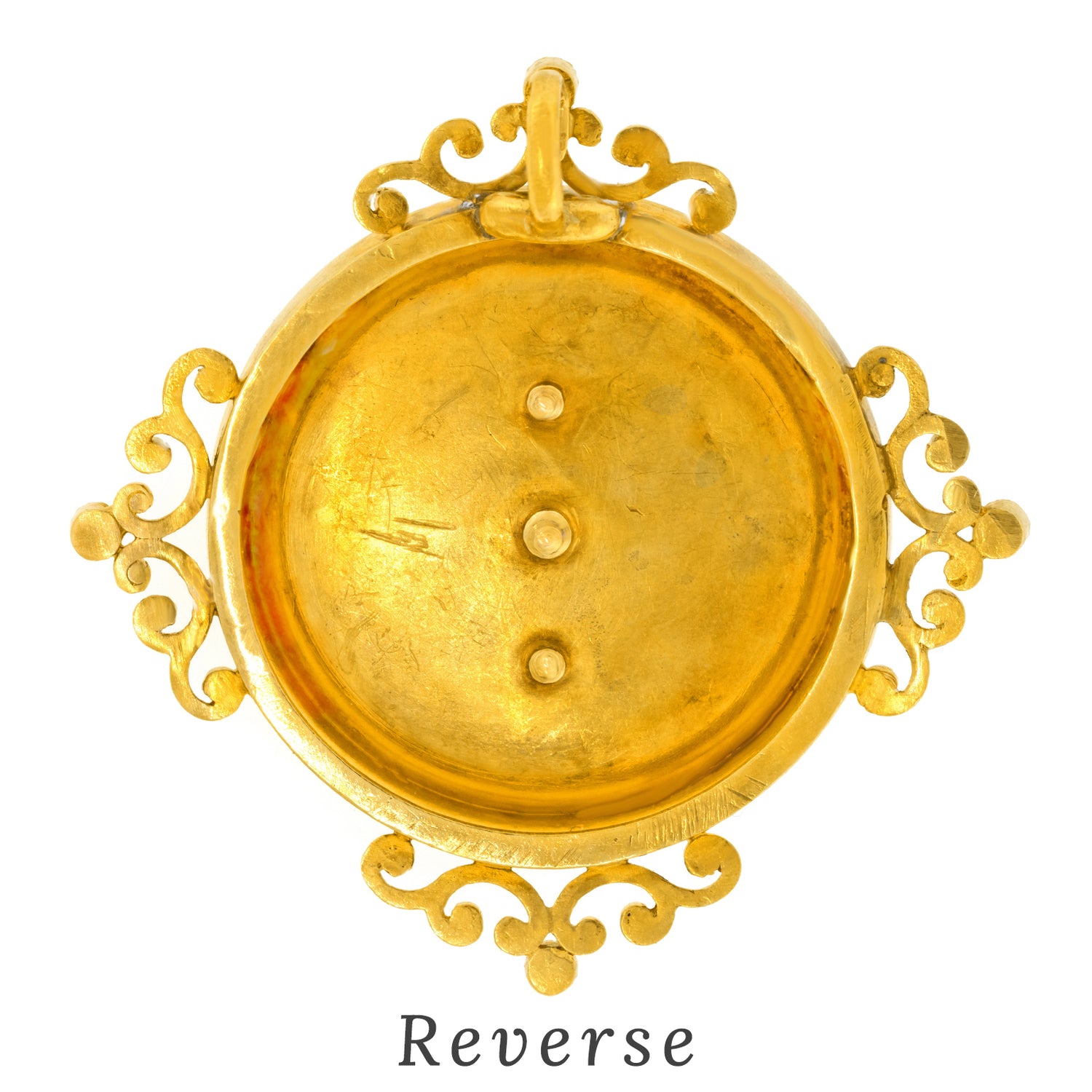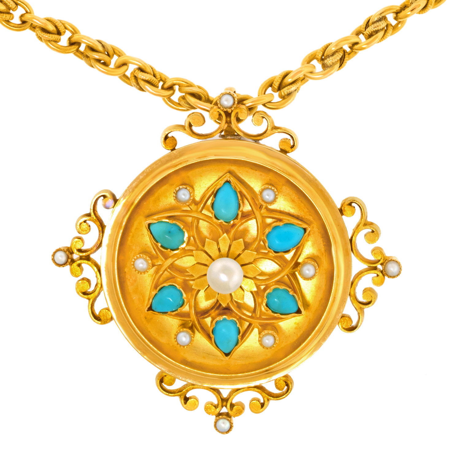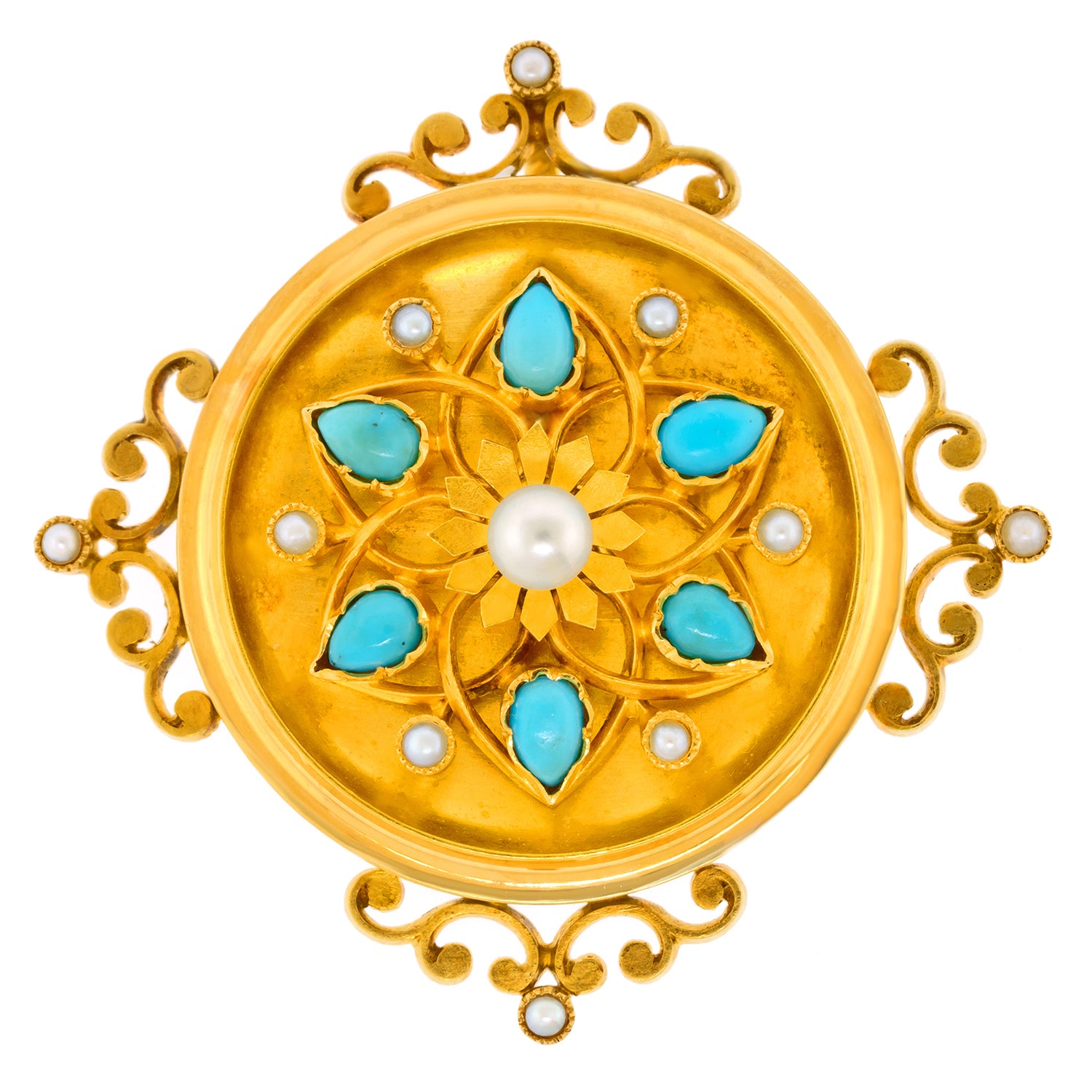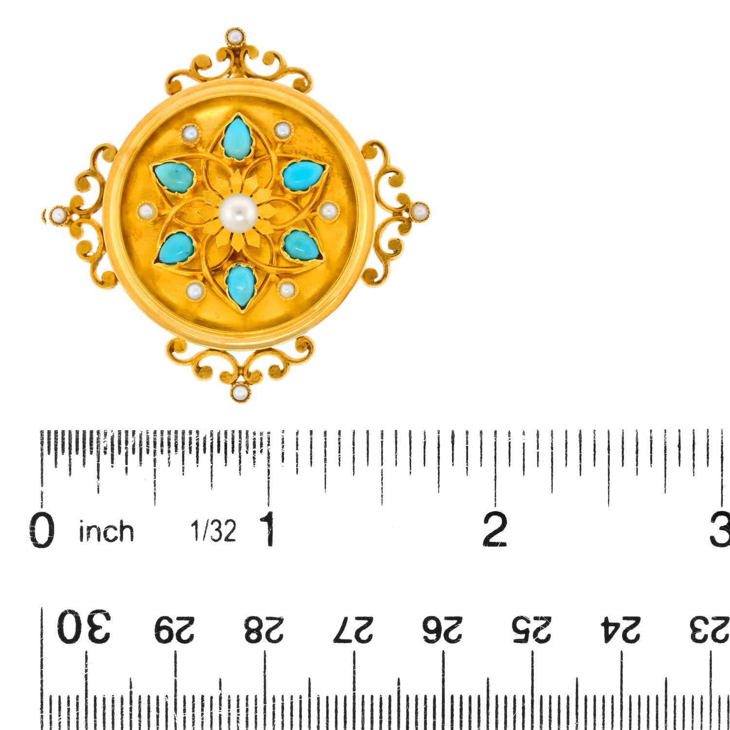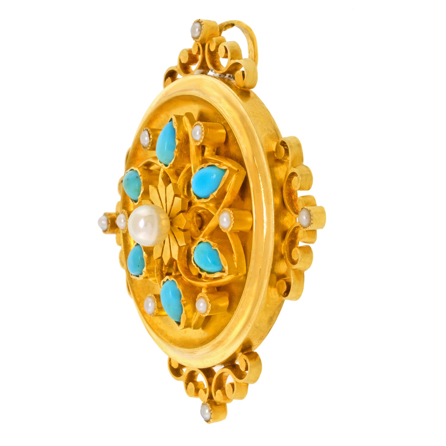 Circa 1880s, 18k, France. This antique pendant is set with brilliant blue Persian Turquoise in a stylishly refreshing Moorish motif. Intricate goldwork, underscored by meticulous hand fabrication and delightful movement, all add to the timelessly chic look. Excellent condition.