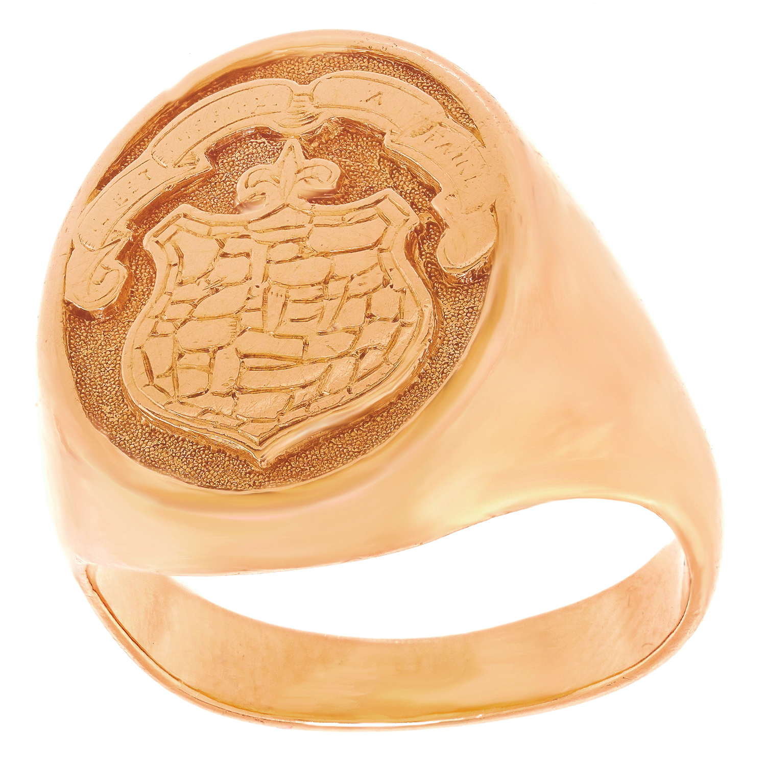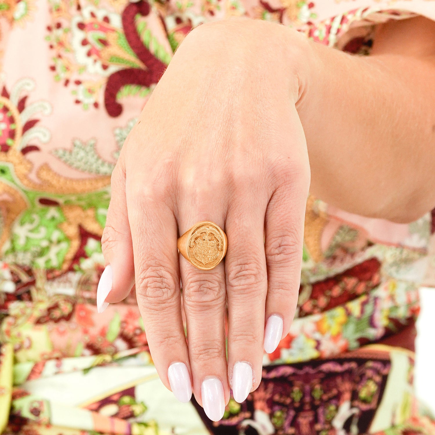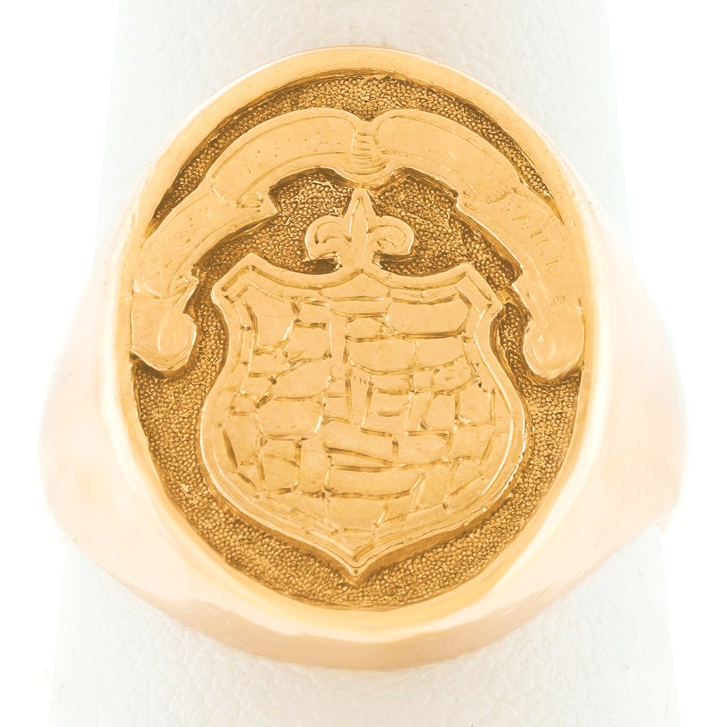 Circa 1890s, 14k, American.  Decorated with a crisp armorial, this antique signet ring has a charming town and country look. Classic lines, heavy gold, and a balanced scale make this a perfect everyday gold ring. Beautifully made, it is in excellent condition.